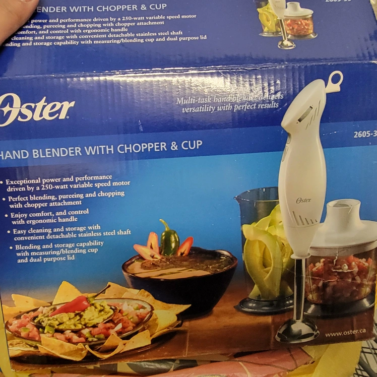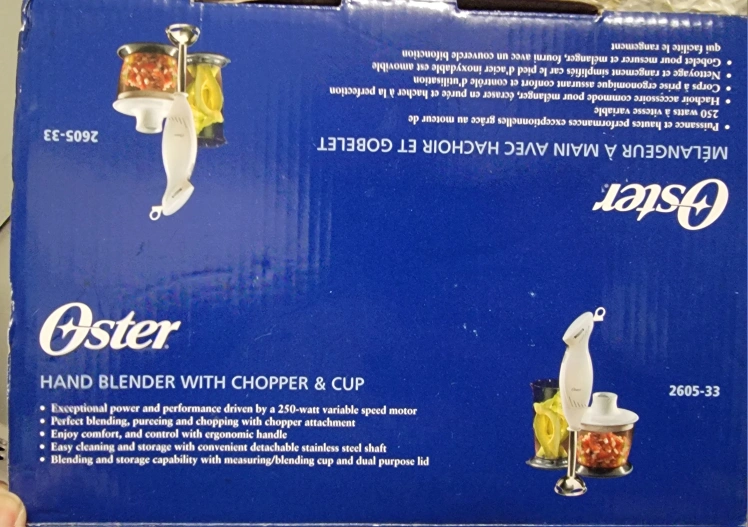 Oster hand blender. 250-watt variable speed motor. Includes chopper attachment, missing cup. Ergonomic handle. Stainless steel shaft. Easy cleaning and storage.