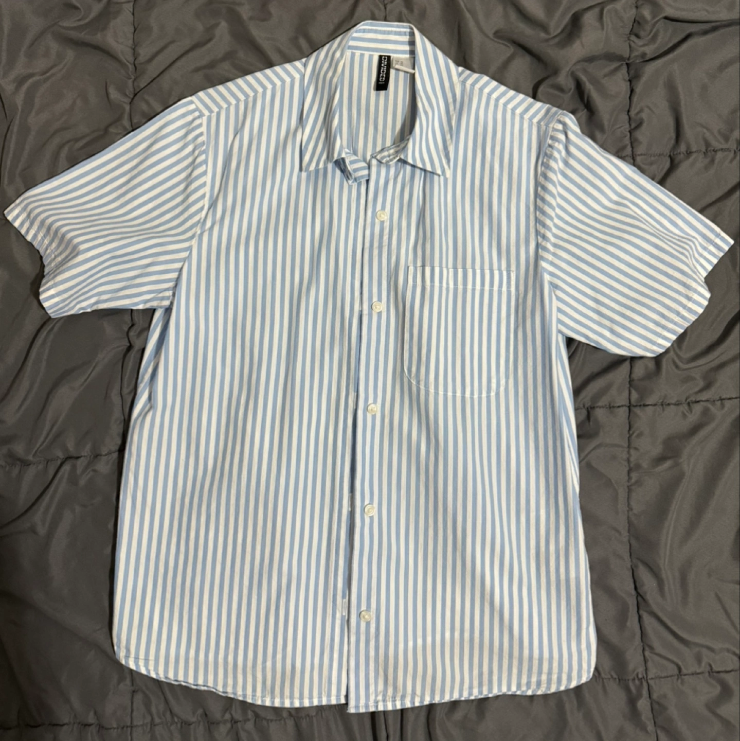 H&M Men's Blue and White Striped Short Sleeve Button Down Shirt