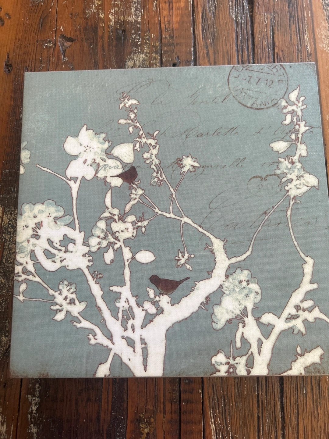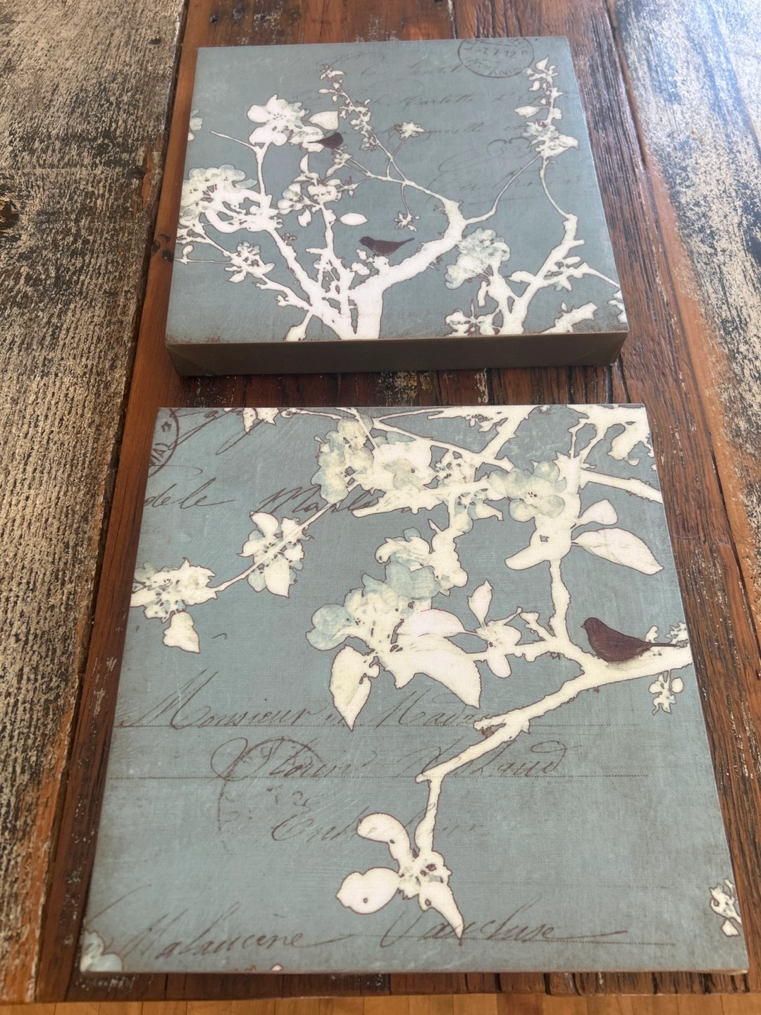 Set of two square canvas prints. Features a delicate floral design with birds. Pale blue background with white blossoms and brown birds. French-inspired script visible in the background.
