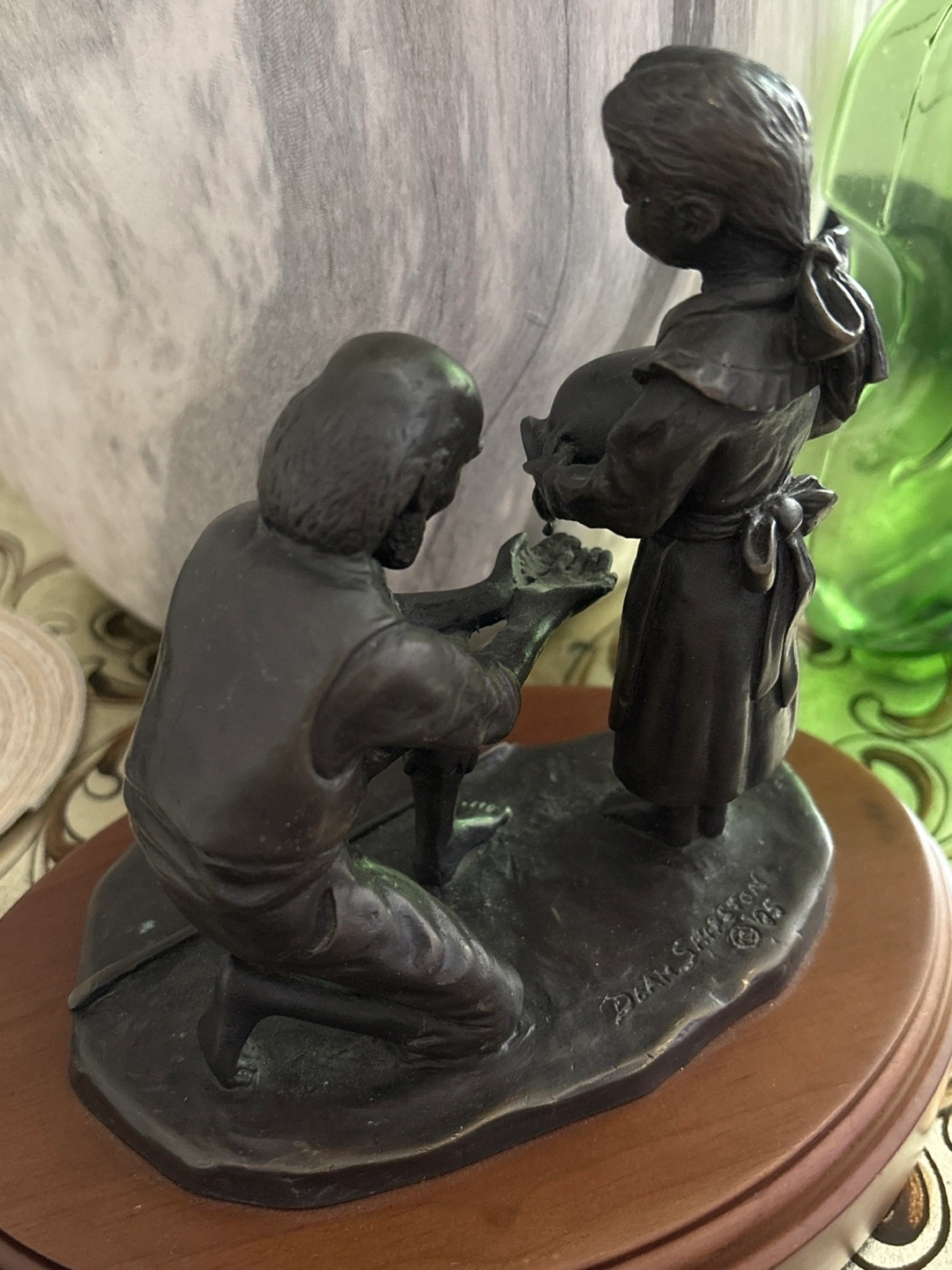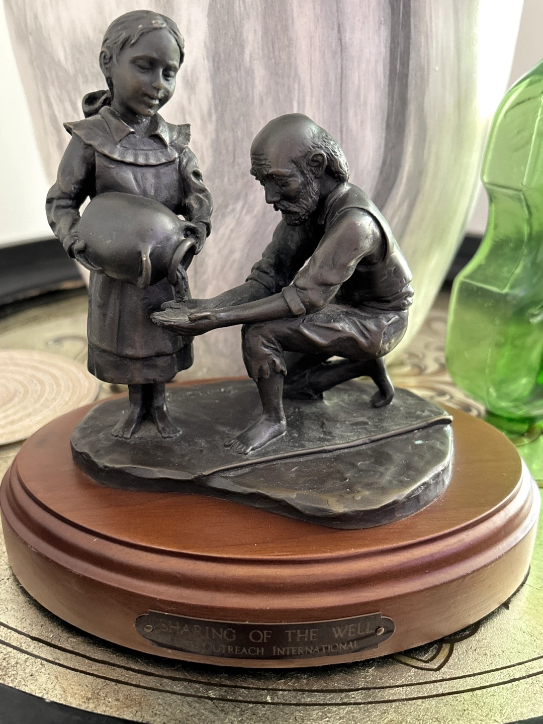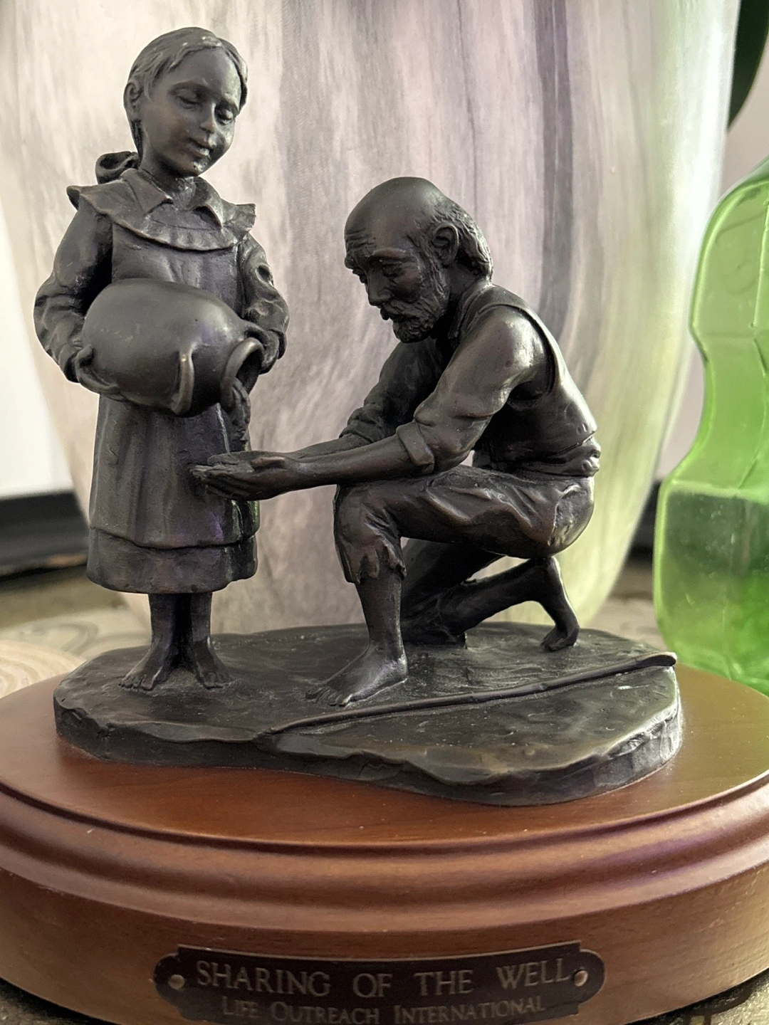 Bronze sculpture depicting a girl sharing water with an old man. Features a wooden base. Life Outreach International by Dean Shipston. Collectible item.