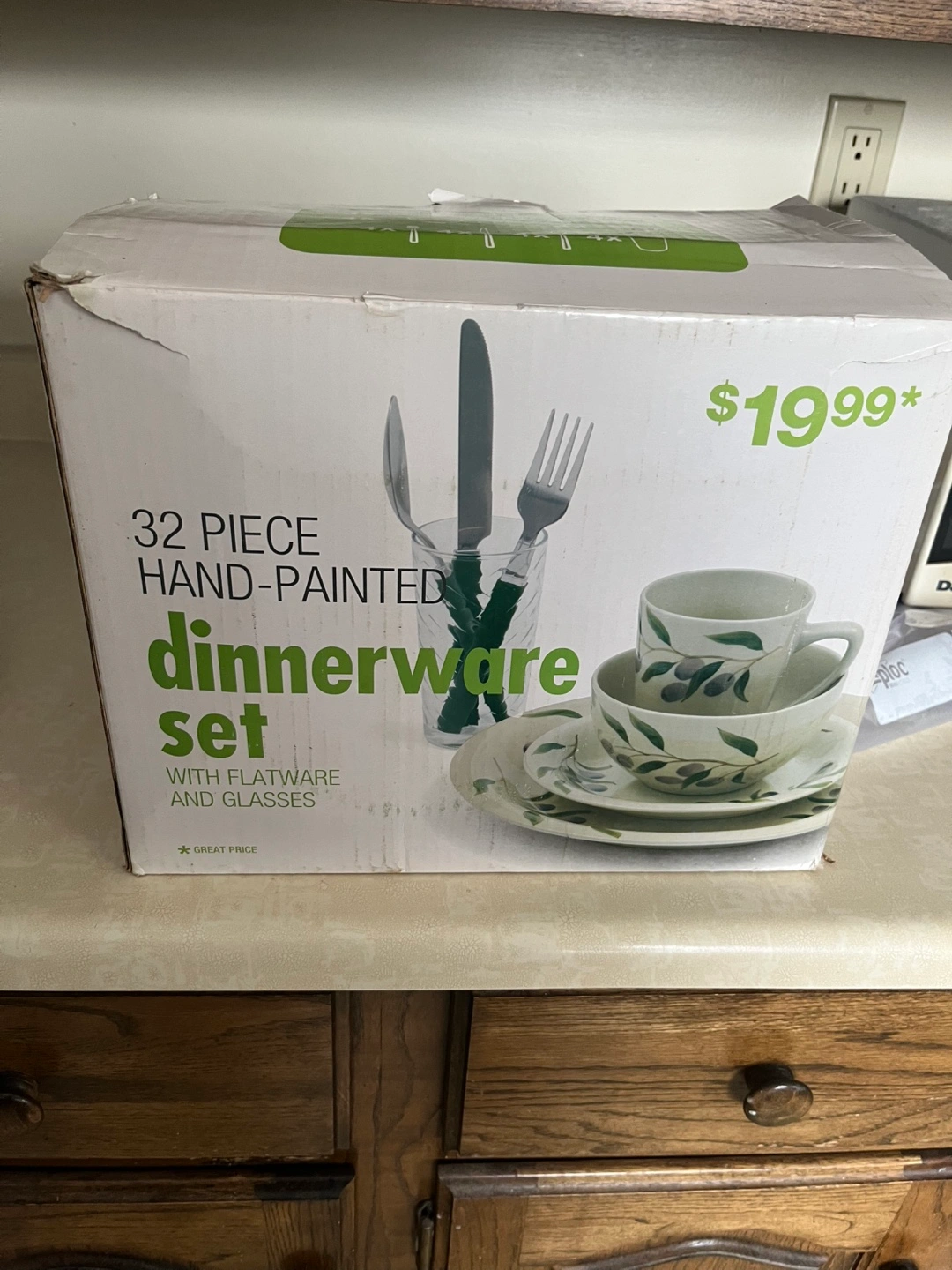 32-piece hand-painted dinnerware set. Includes flatware and glasses.