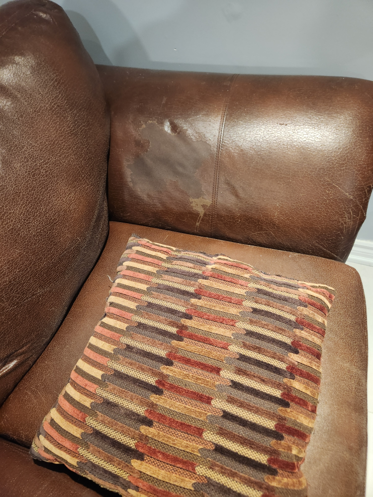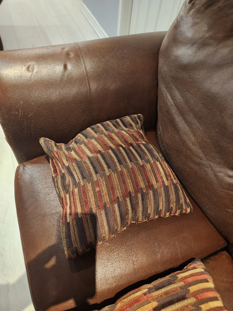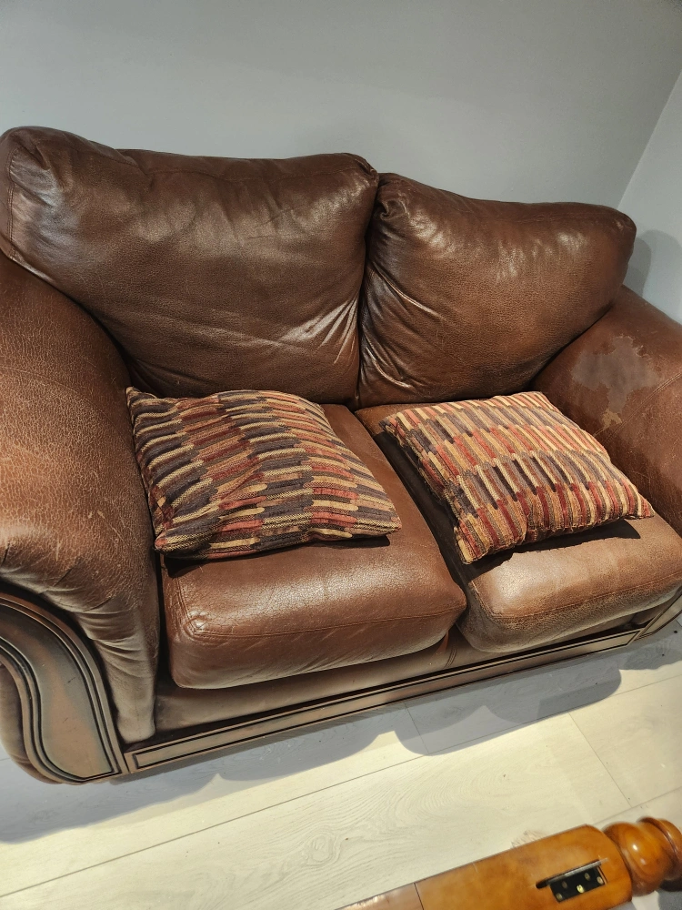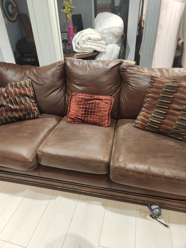 Brown leather sofa and love seat with wooden accents. Includes several throw pillows. selling for $80 are give me your best offer