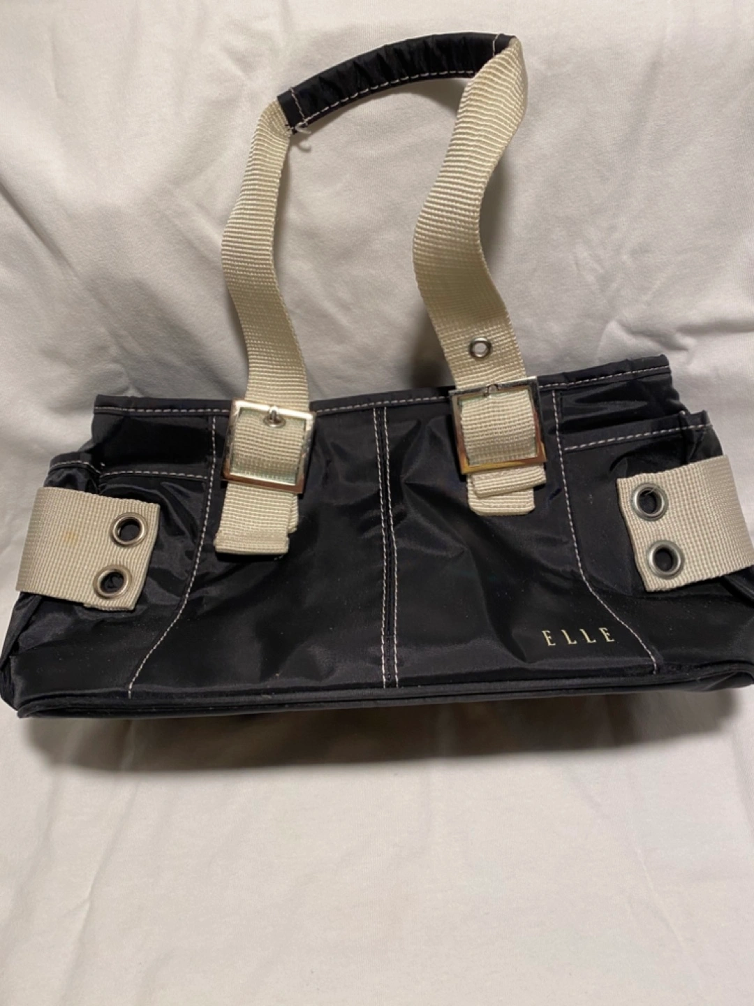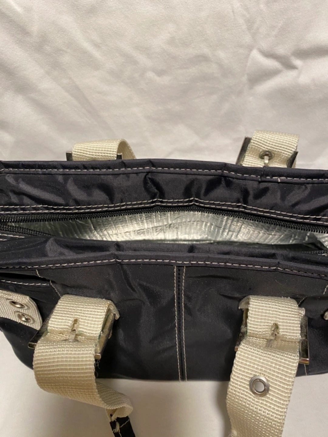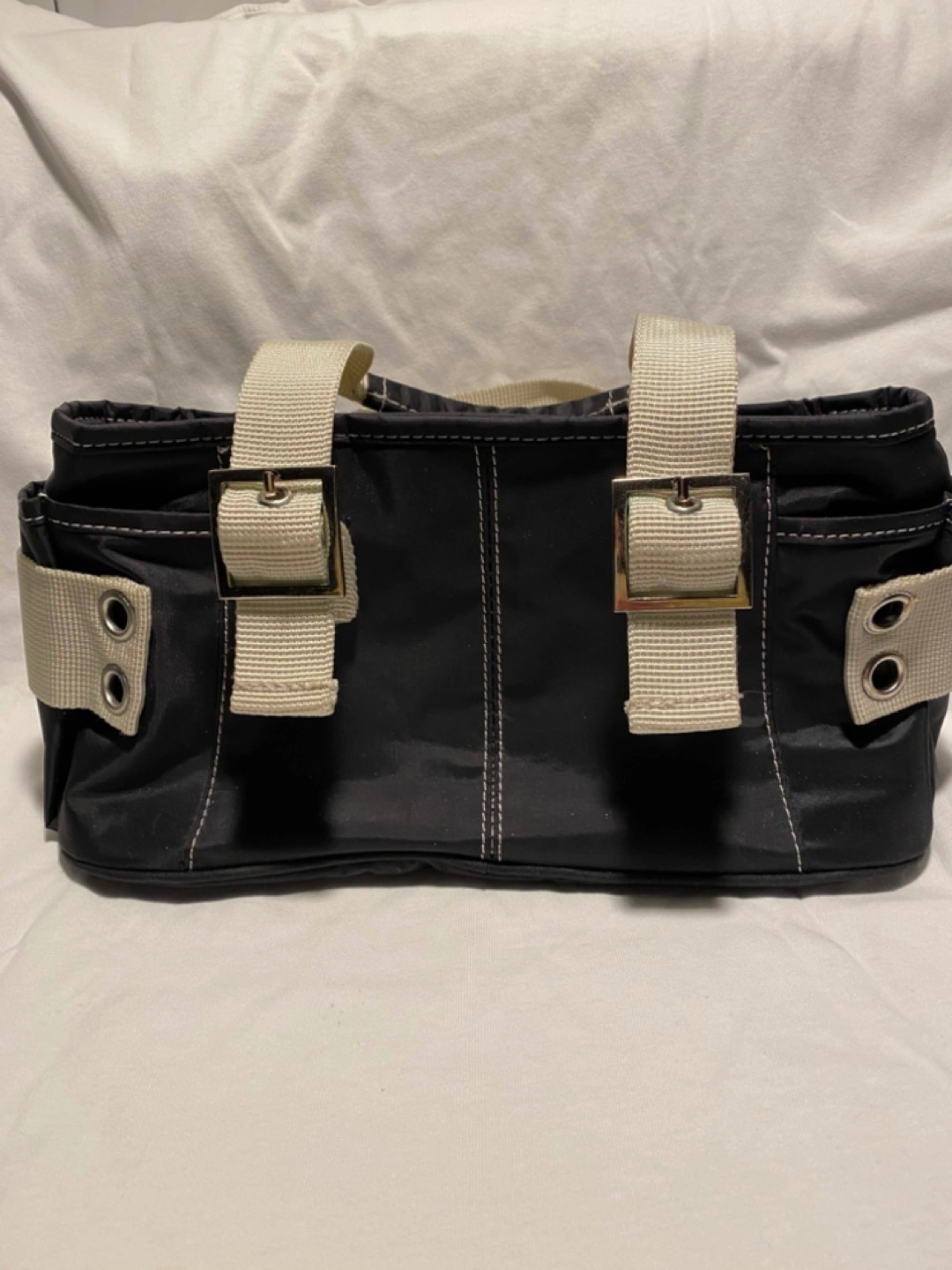Small black nylon handbag. Features cream-coloured straps and buckles. Zipper closure. Insulated interior.