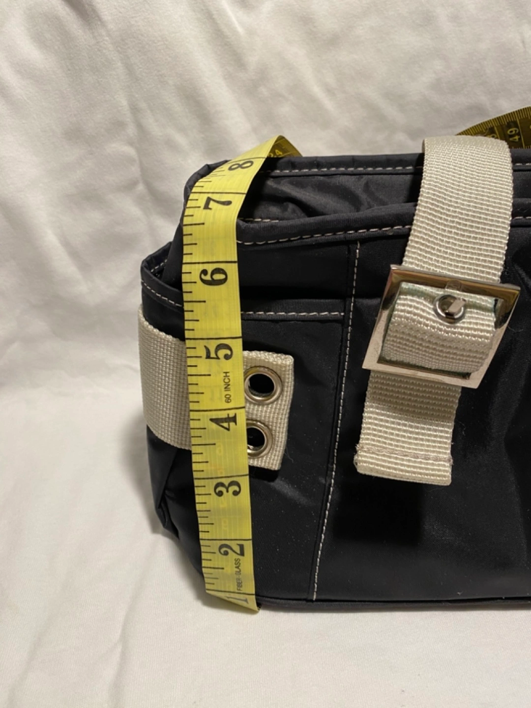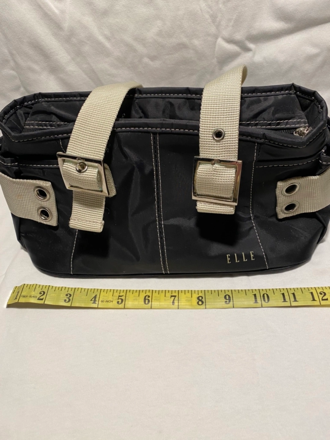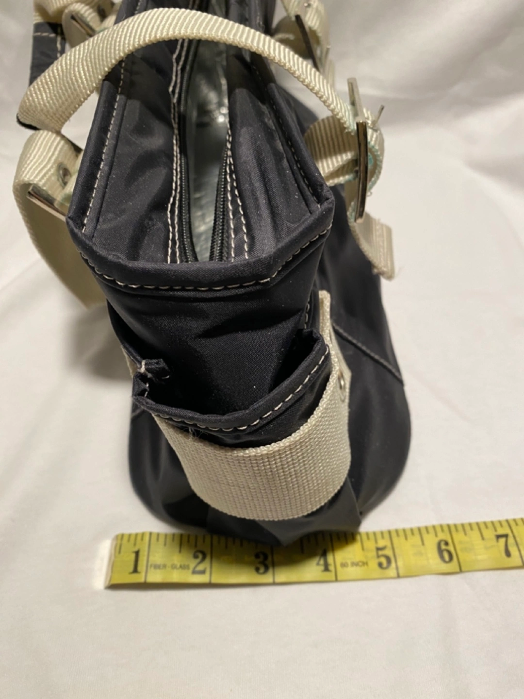 Small black nylon handbag. Features cream-coloured straps and buckles. Zipper closure. Insulated interior.