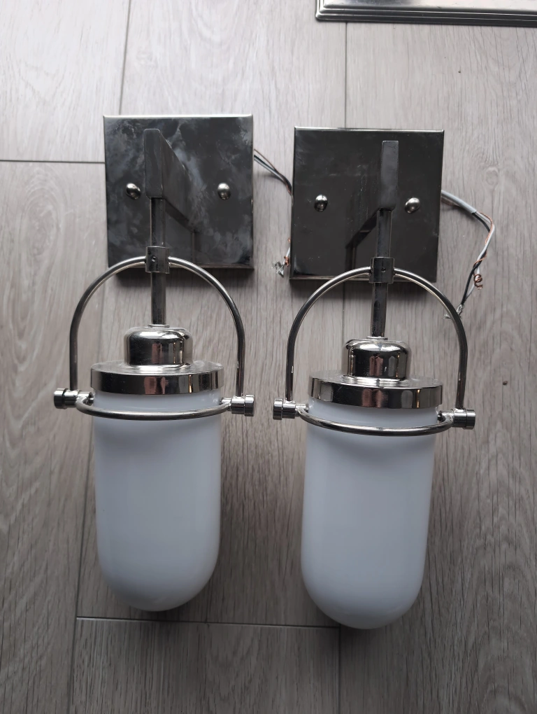 Two stylish wall sconces. Chrome finish. White glass shades. Wired, ready to install. Perfect for a contemporary space.