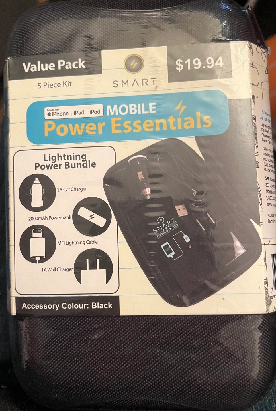Five-piece power kit includes car charger, power bank, lightning cable, and wall charger. Black carrying case. Perfect for travel.