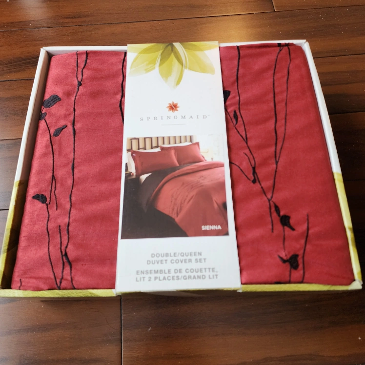 New Springmaid Sienna duvet cover set. Double/Queen size. Red with black embroidered design. Includes duvet cover and pillowcases.