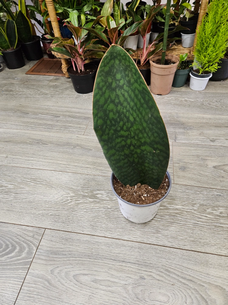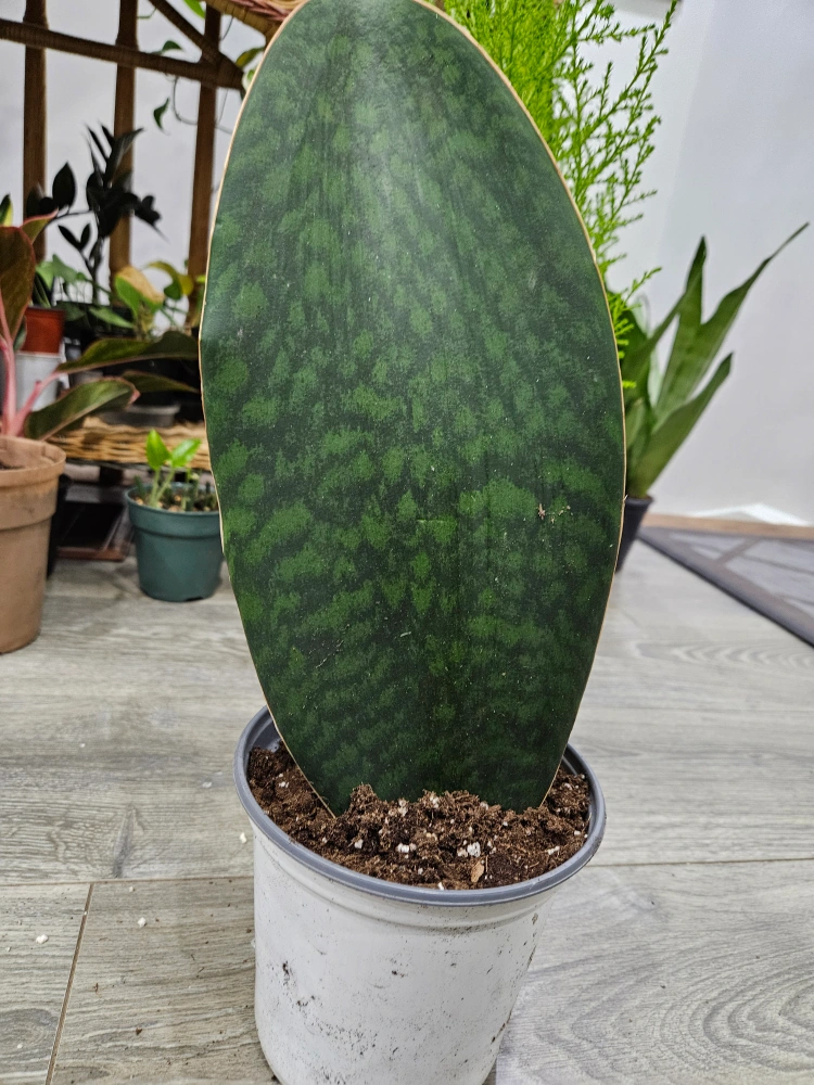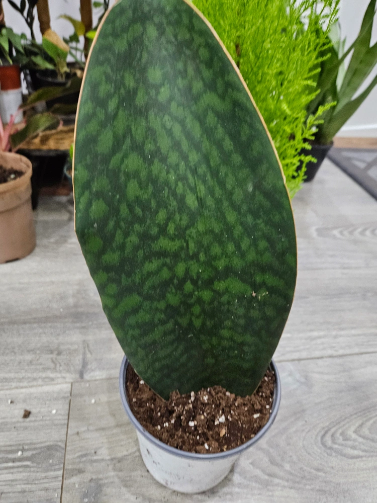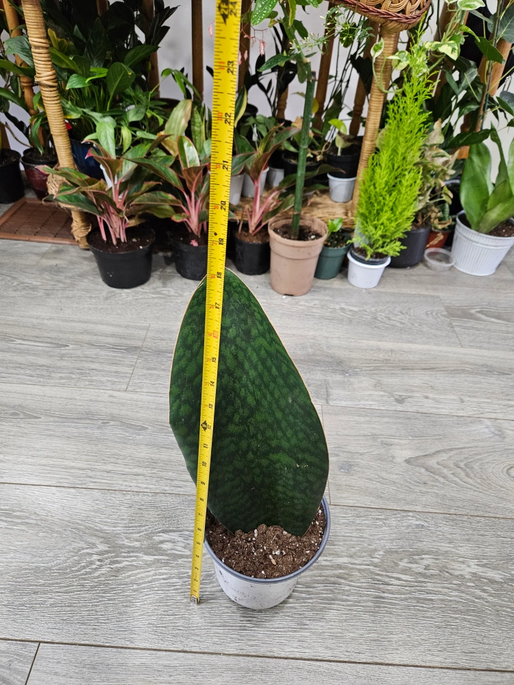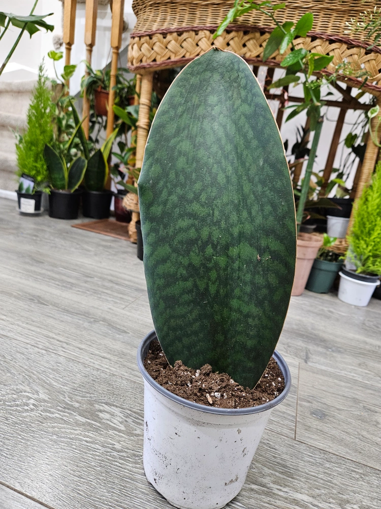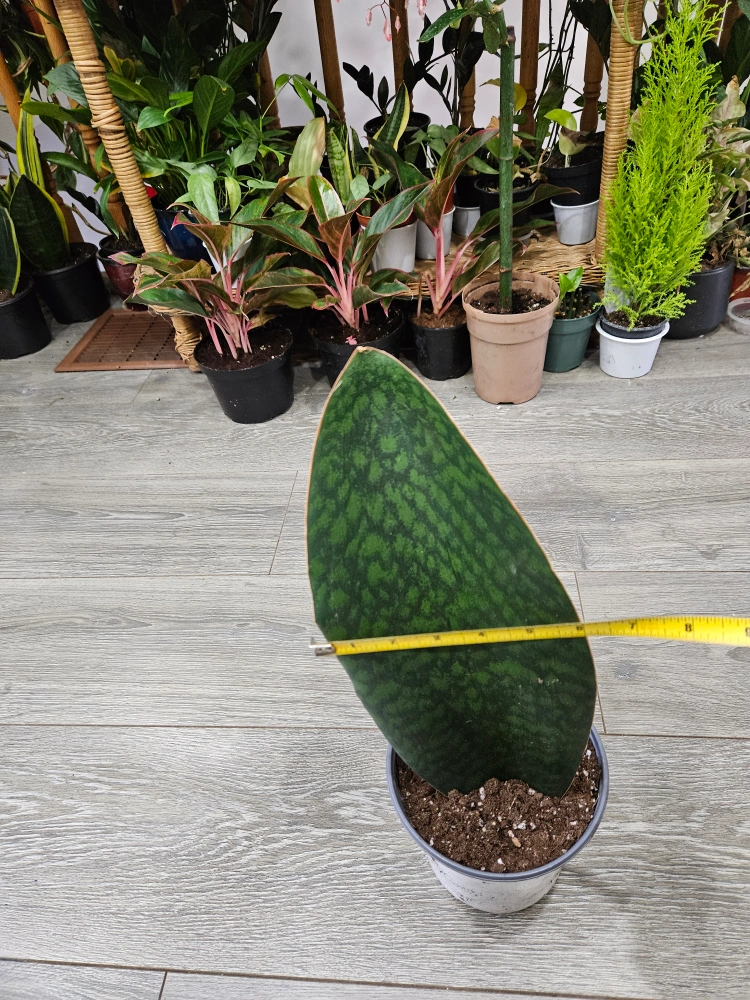Beautiful, large Sansevieria Masoniana. Single leaf. Potted in a 6"nursery grey pot. Approximately 23 inches tall.