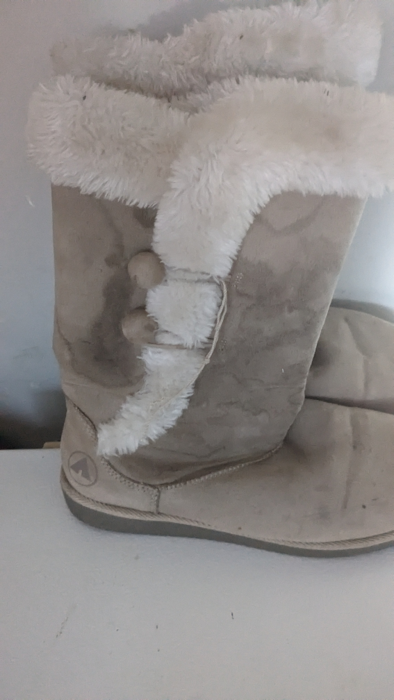 Beige suede winter boots. Faux fur trim. Button accents. Used condition. need a wipe down