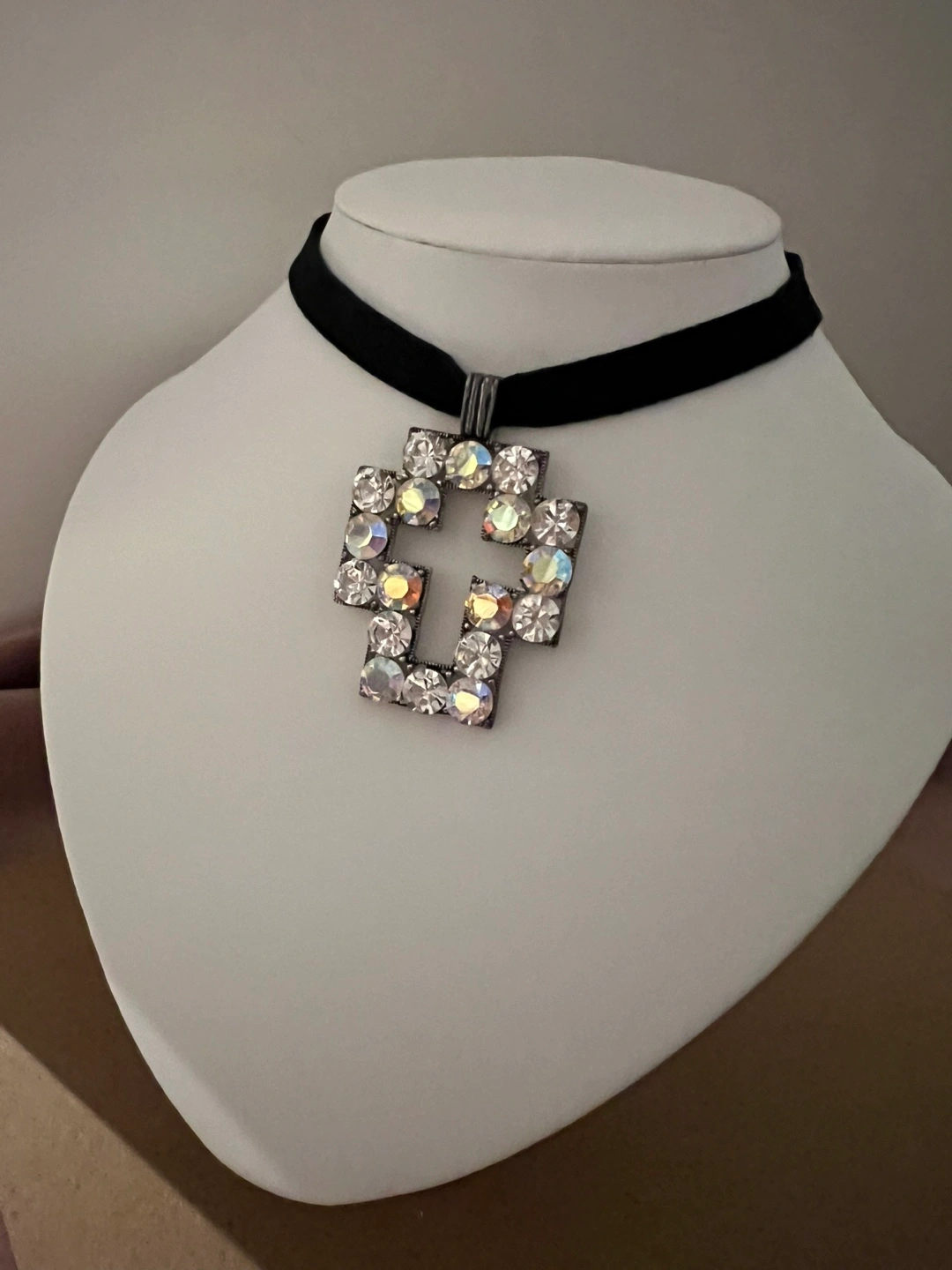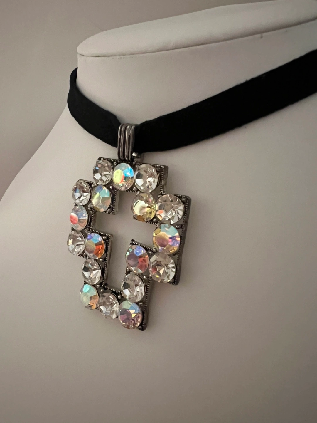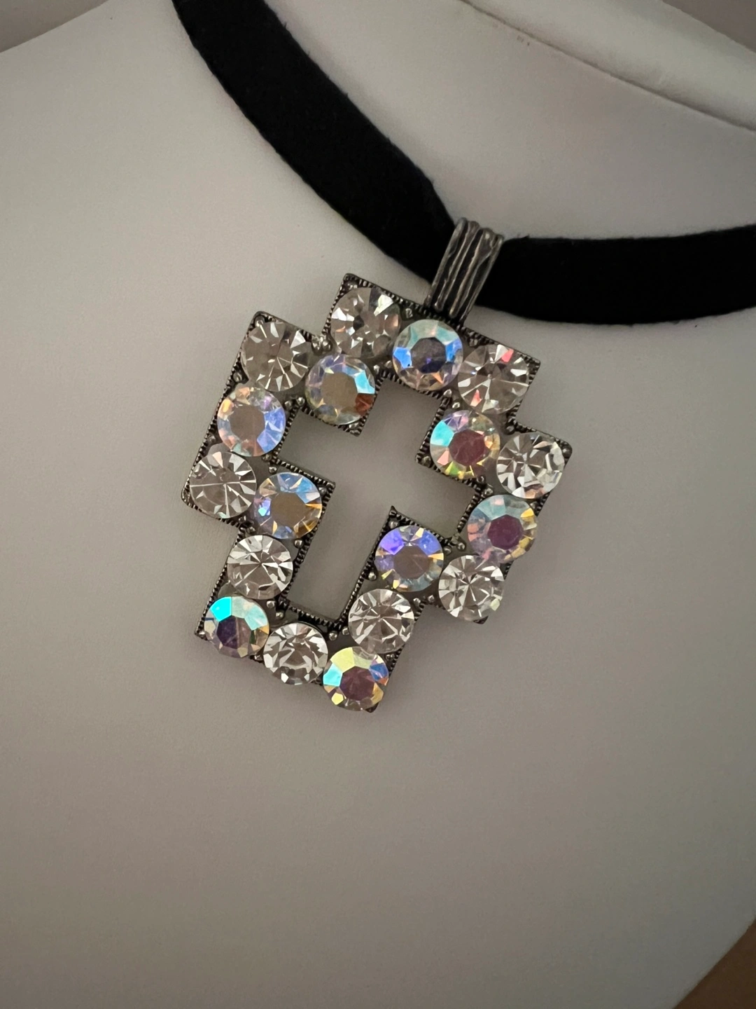 Beautiful choker necklace. Features a large cross pendant encrusted with iridescent rhinestones. Black velvet choker. Unique statement piece.