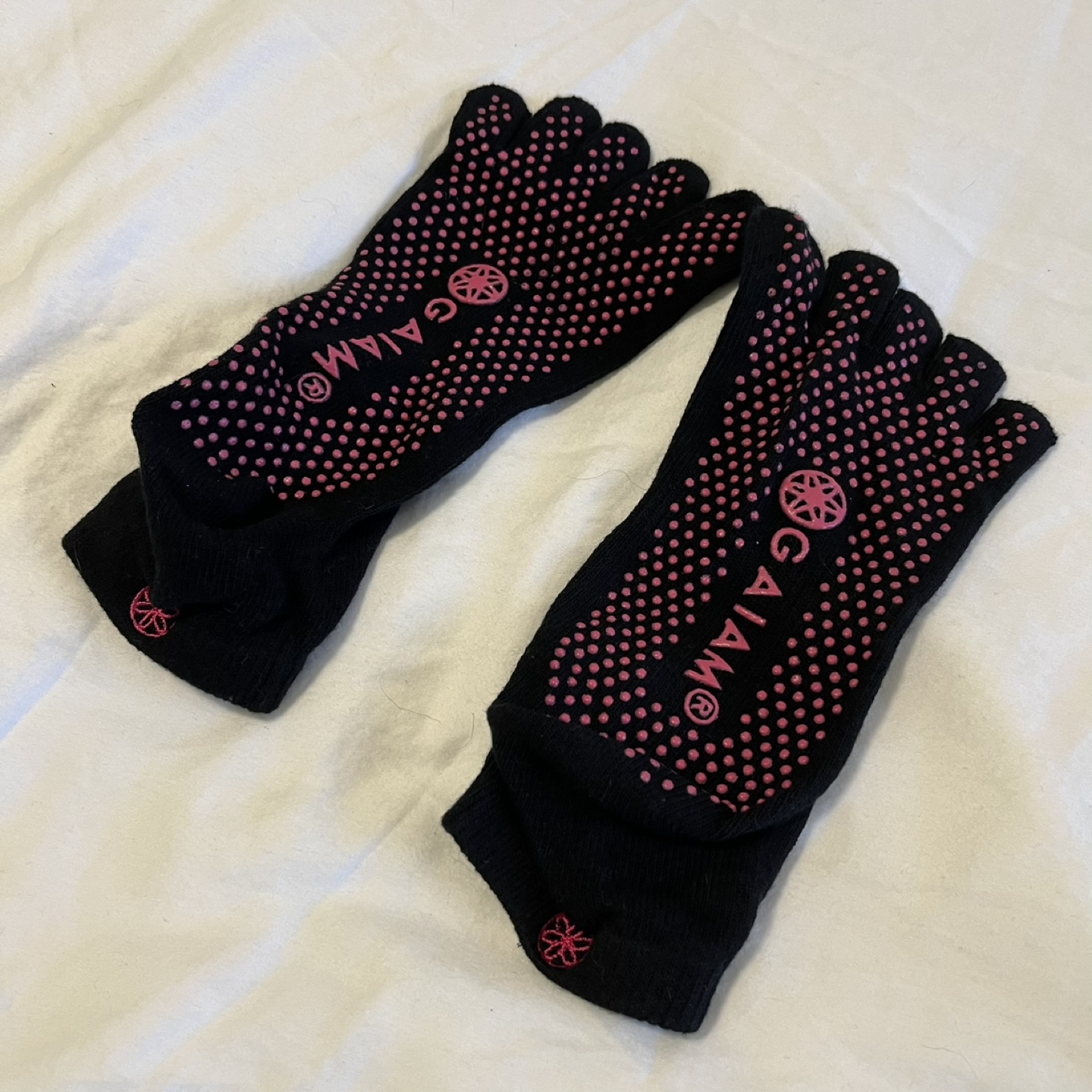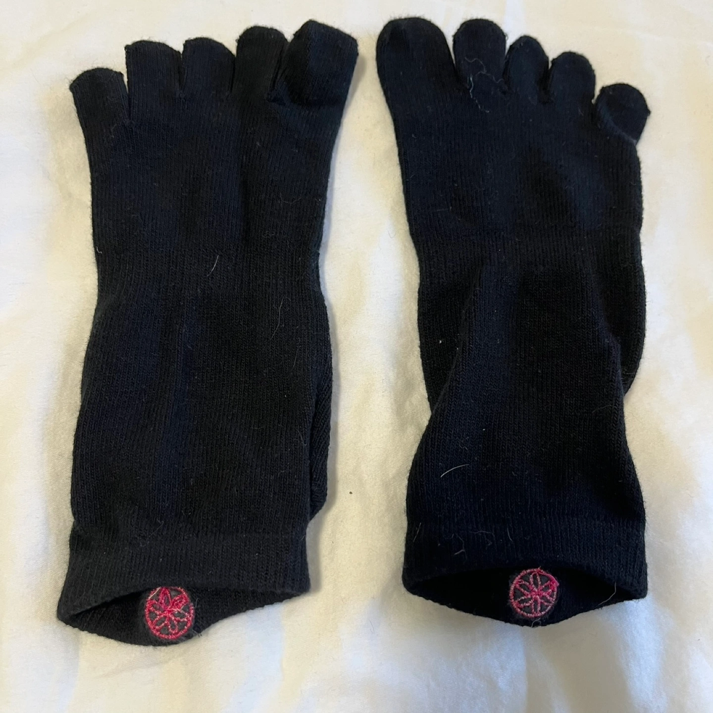 Pair of black yoga socks. Grippy dots on the soles. Five-toe design. Great for yoga or pilates. Check out my other listings!