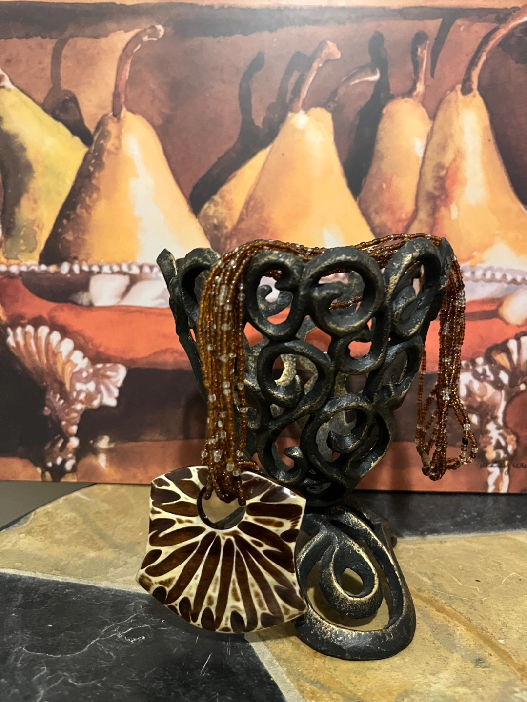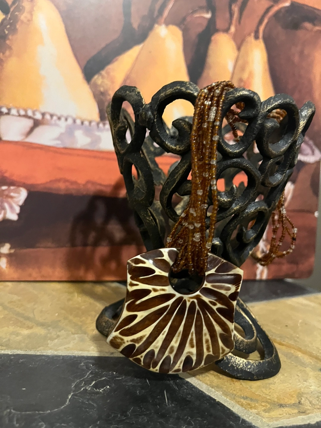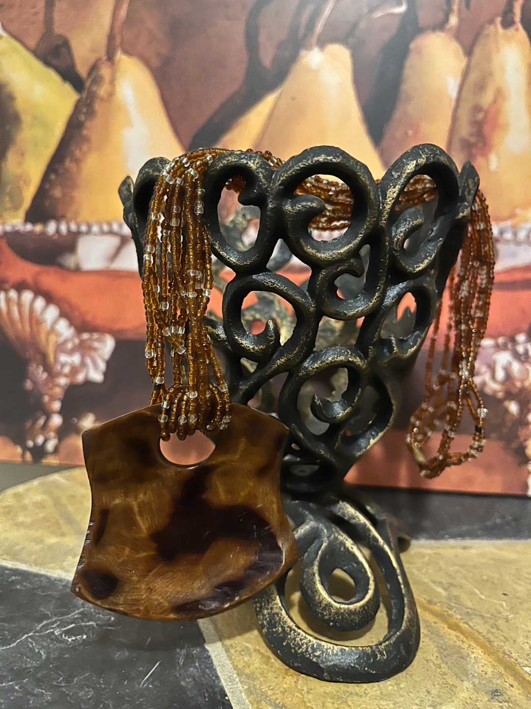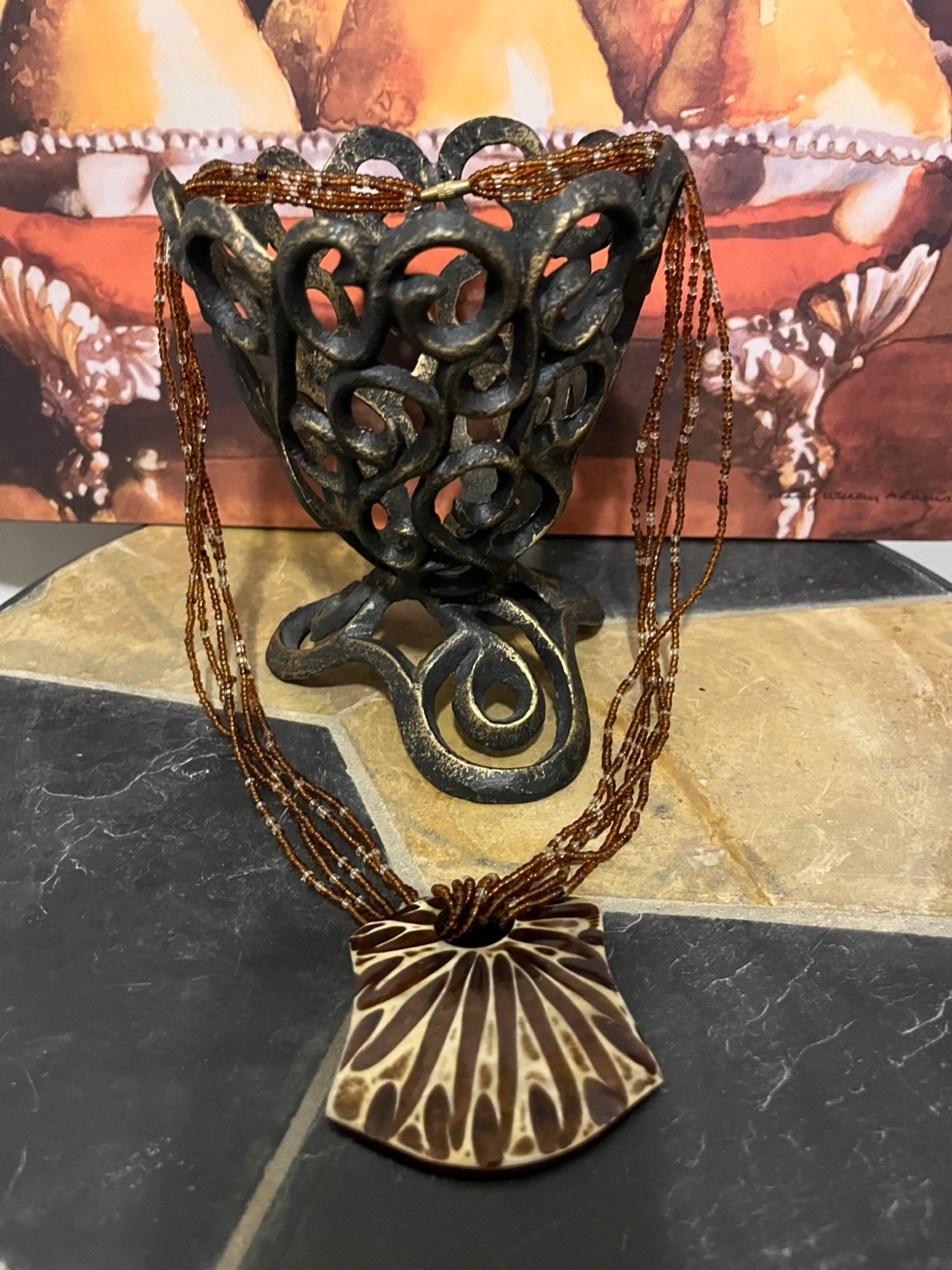 Stunning necklace features a multi-strand beaded design and a large, eye-catching pendant. Brown and tan colour scheme. Pendant appears to be resin or similar material. Beautiful statement piece.