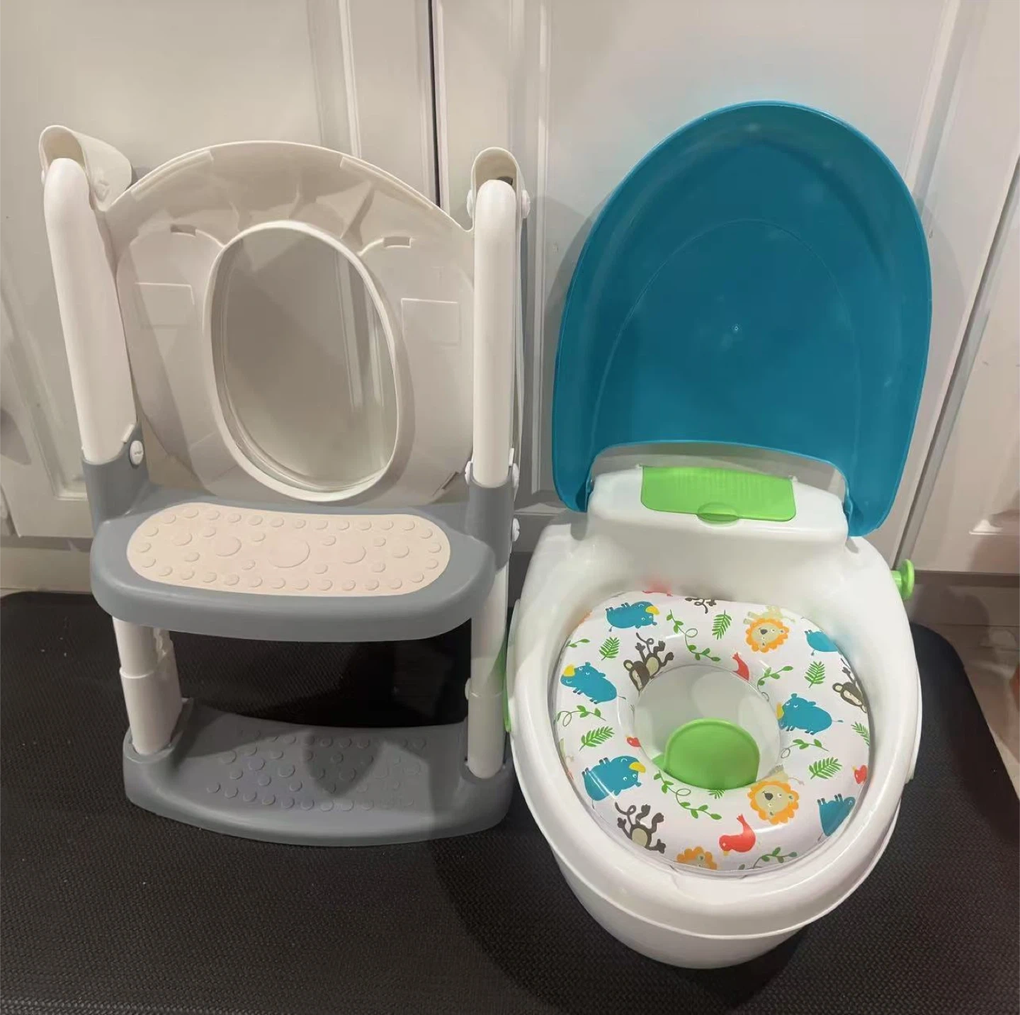 This is a toddler potty training seat with an adjustable step stool. It features a comfortable seat with a cute animal design and a sturdy base for stability. The potty has a removable inner bucket for easy cleaning and a splash guard. It's perfect for little ones learning to use the toilet independently!