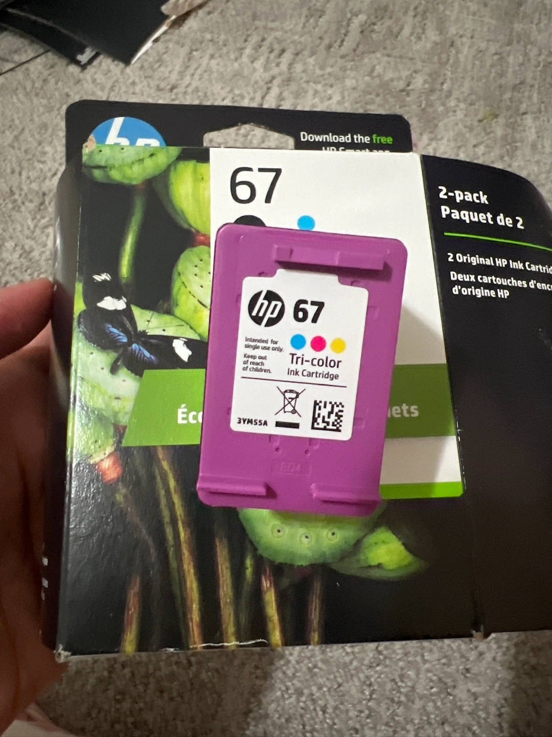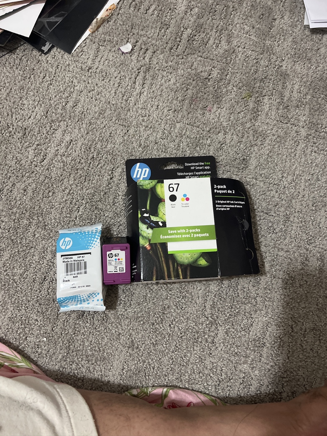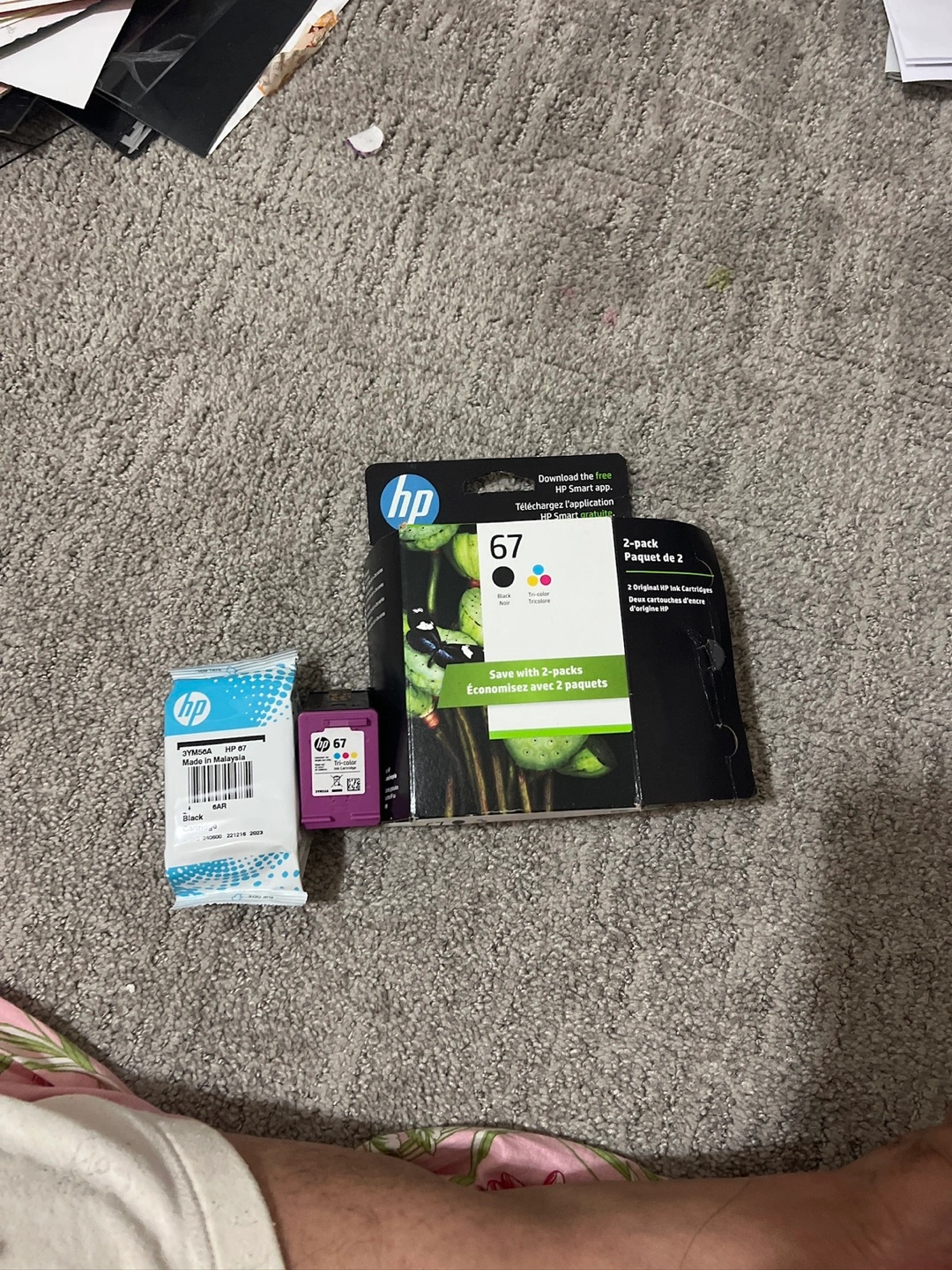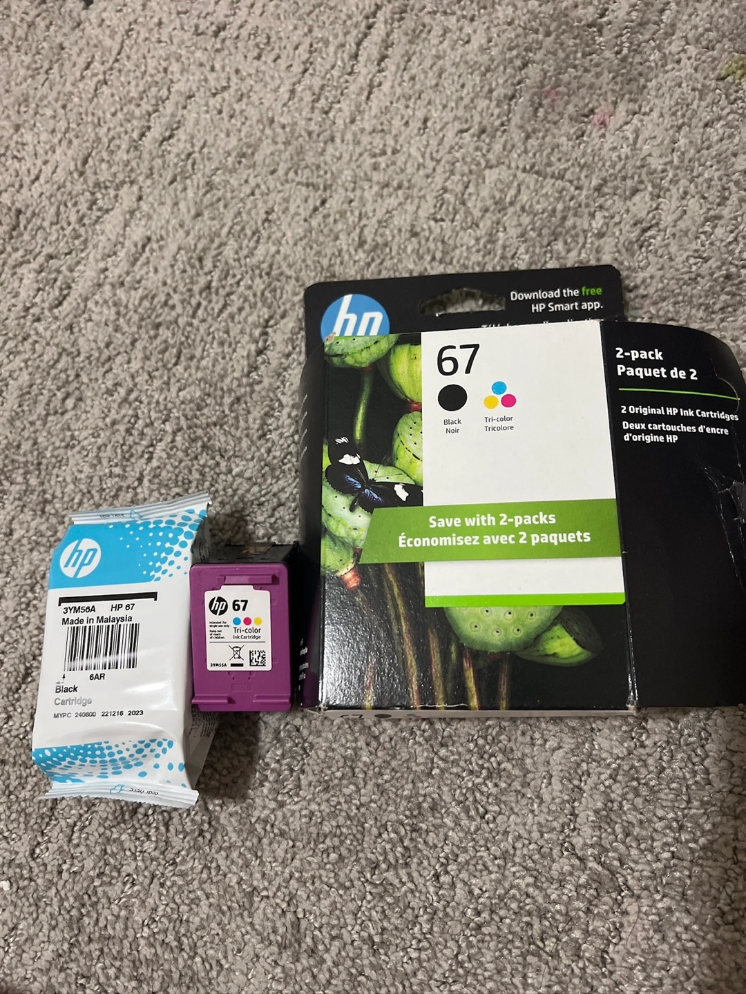 Two-pack of HP 67 ink cartridges. One black and one tri-color. Like New, never used.