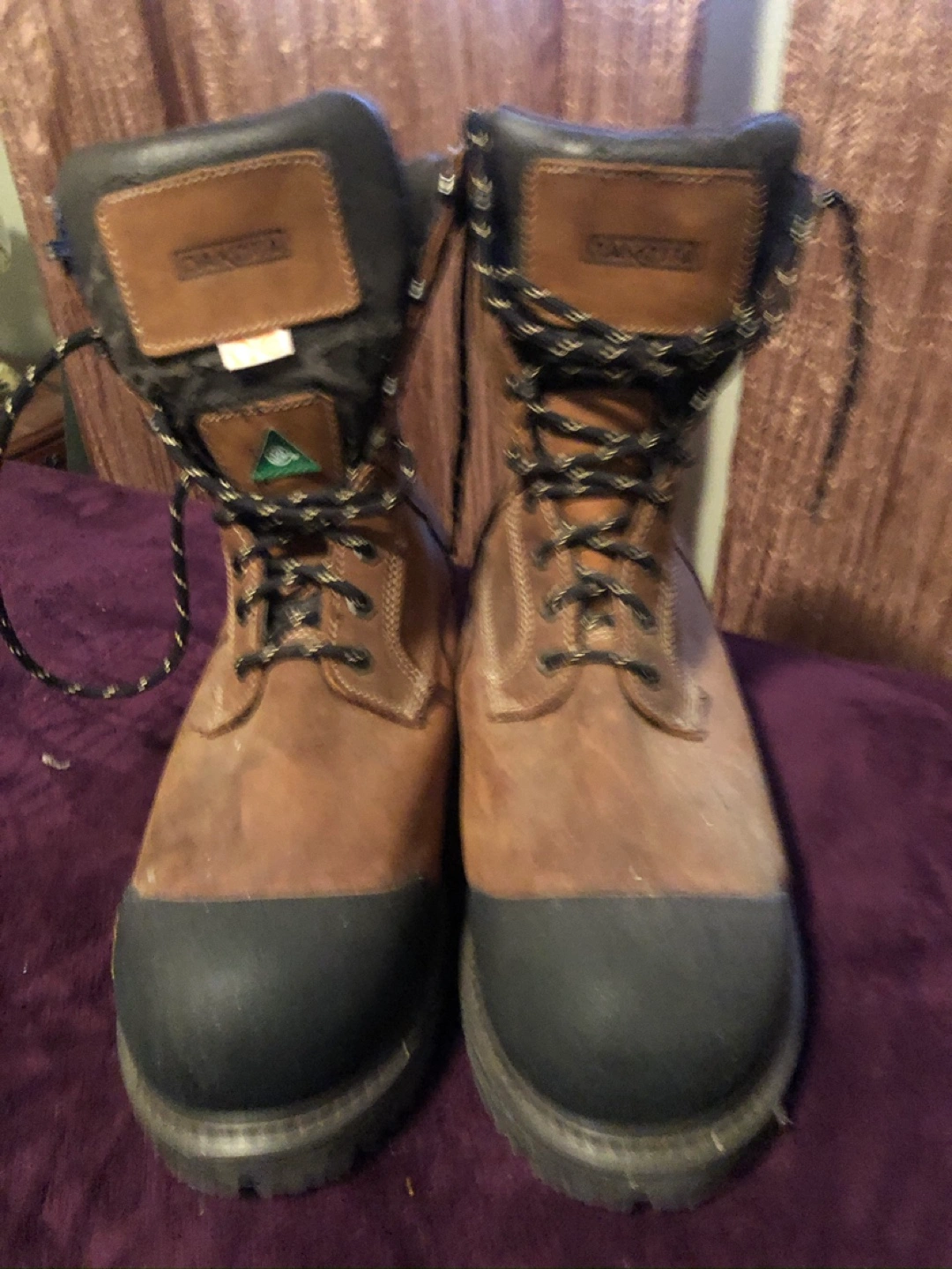 Men's brown leather work boots. Composite toe, armour flex, and arch guard. Durable outsole. Lace-up closure.