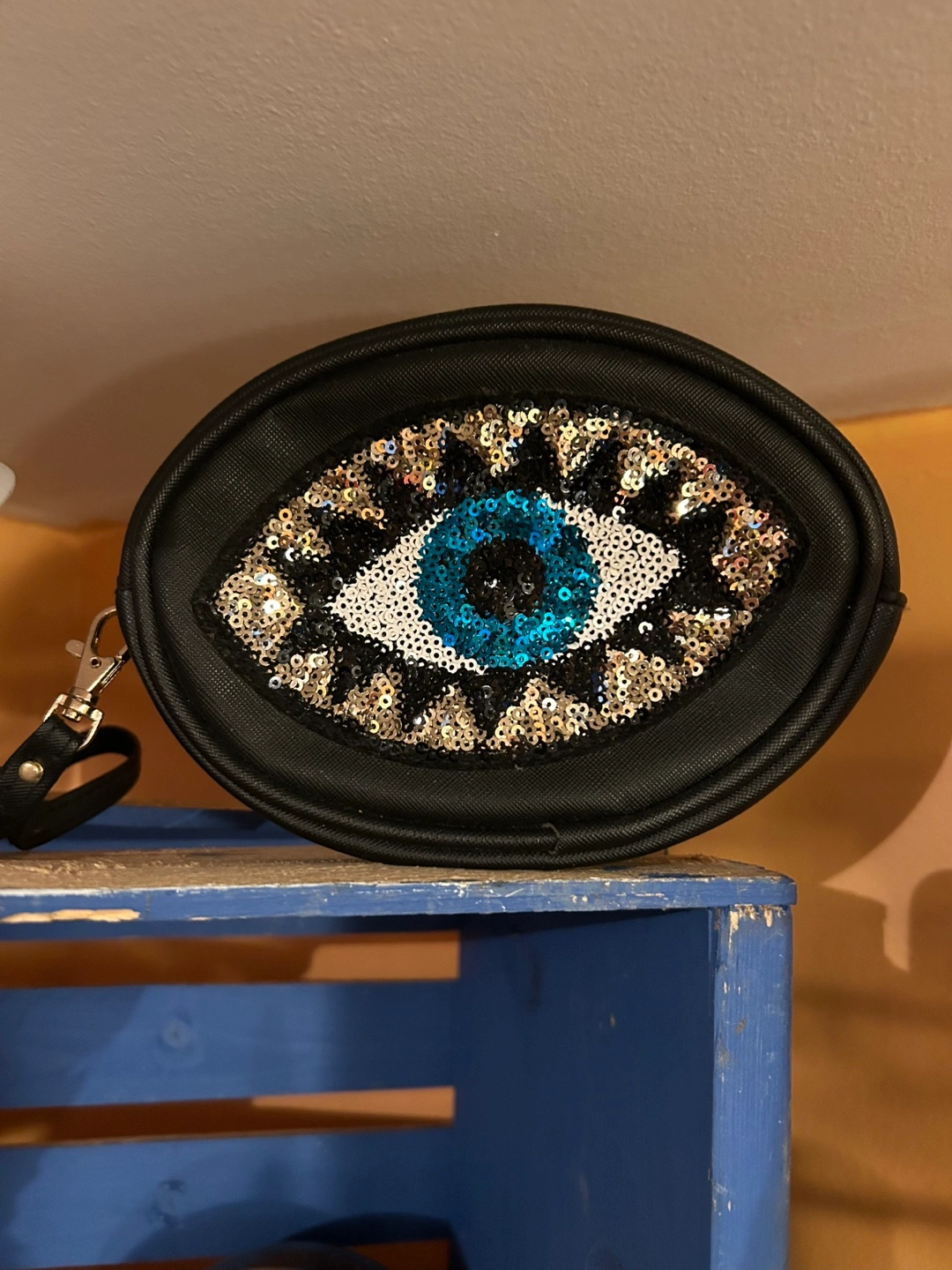 Small black bag. Features a large sequin evil eye design. Oval shape with a wrist strap.