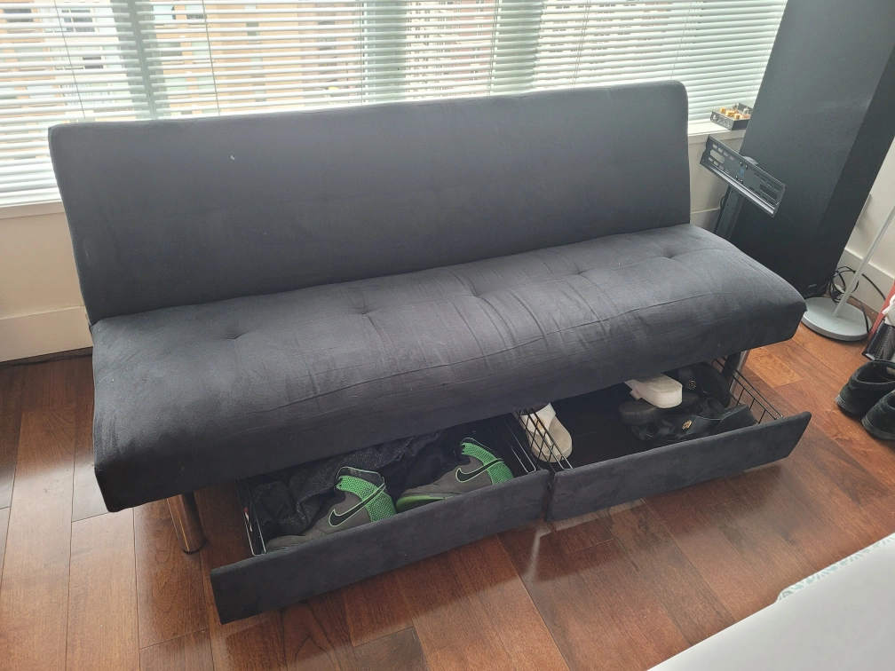 Dark grey microfiber futon sofa bed. Features two pull-out storage drawers. Metal legs. Excellent for small spaces.