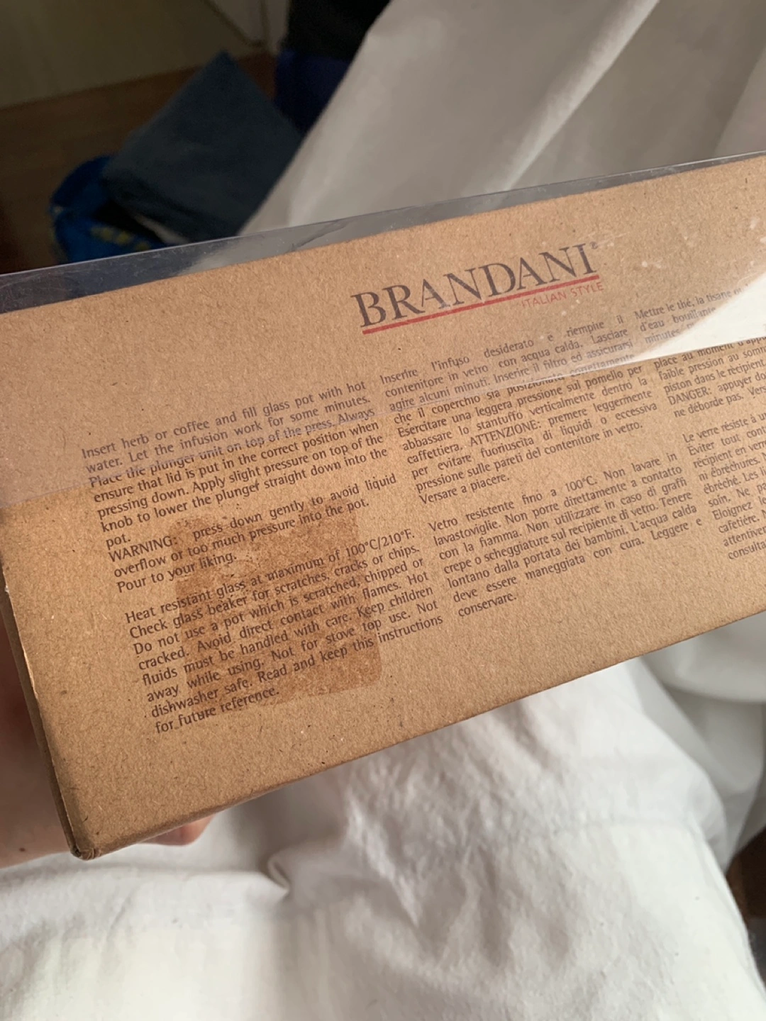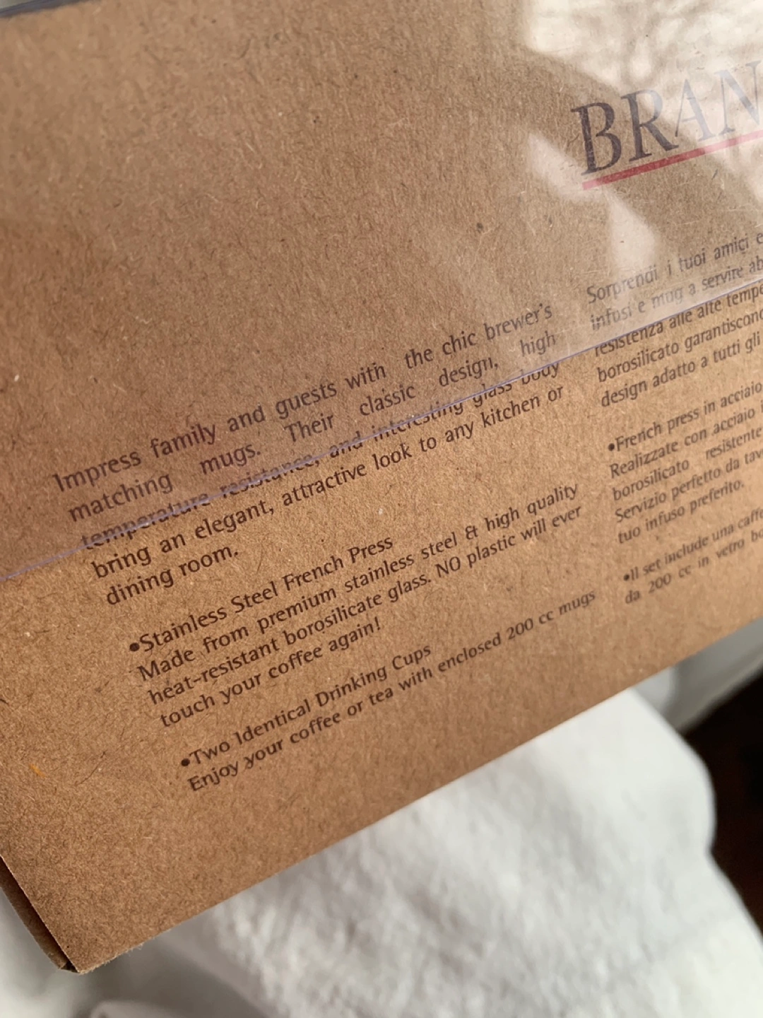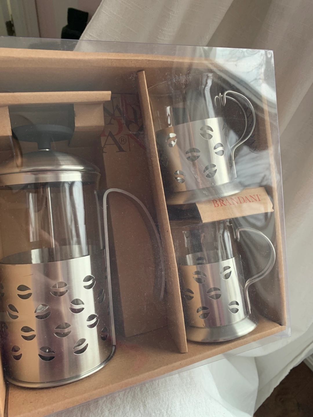 Three-piece coffee set. Includes French press, two matching mugs. Stainless steel and borosilicate glass.