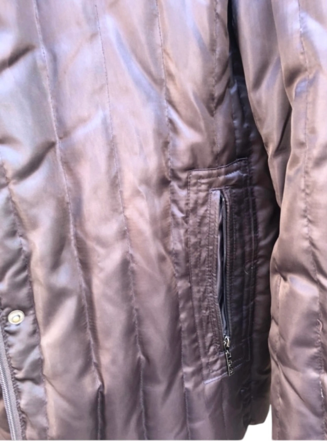 Women's dark brown puffer jacket. Features a high collar, zipper and button closure, and zippered pockets. Lightweight and warm. Excellent condition
