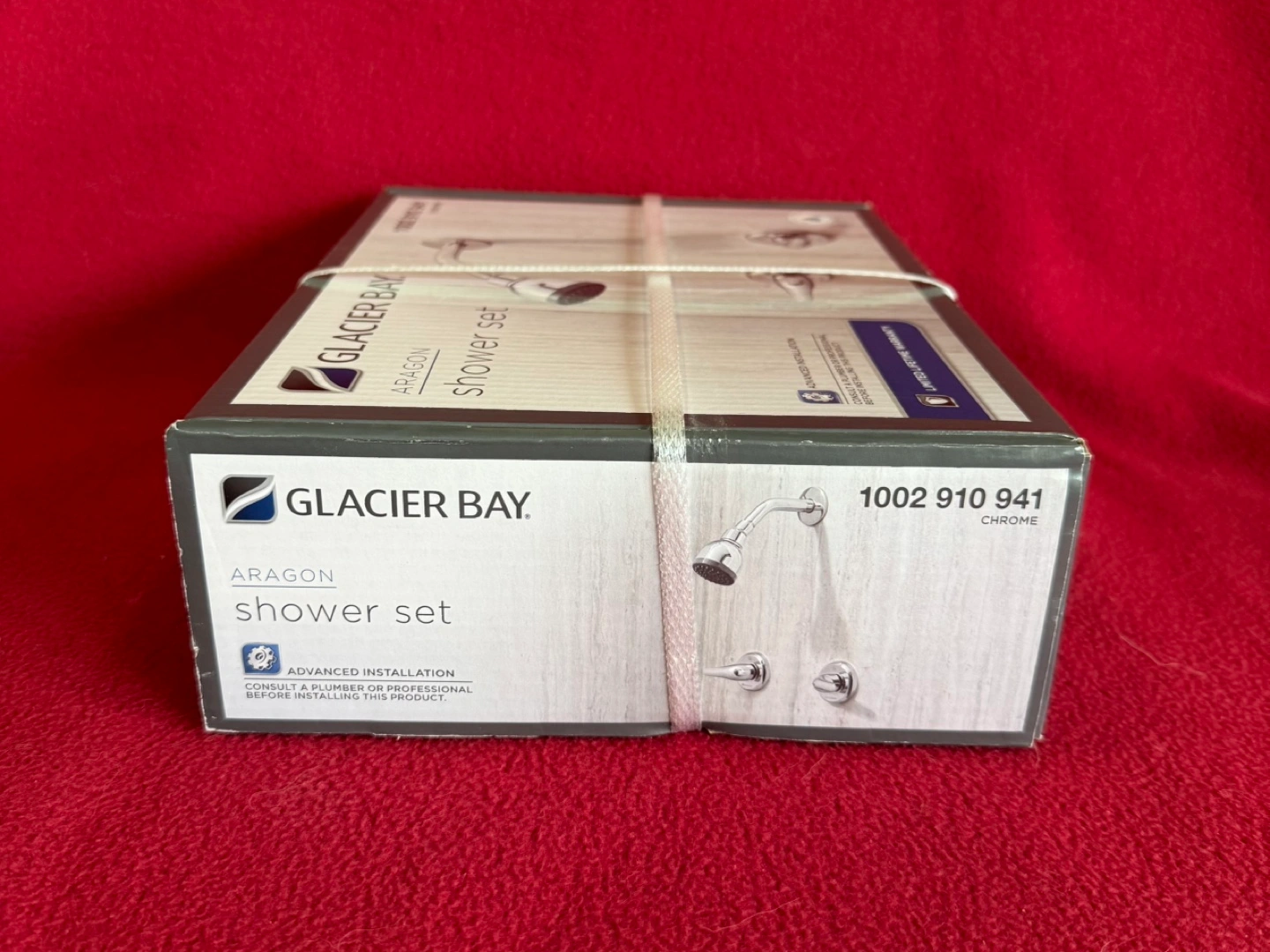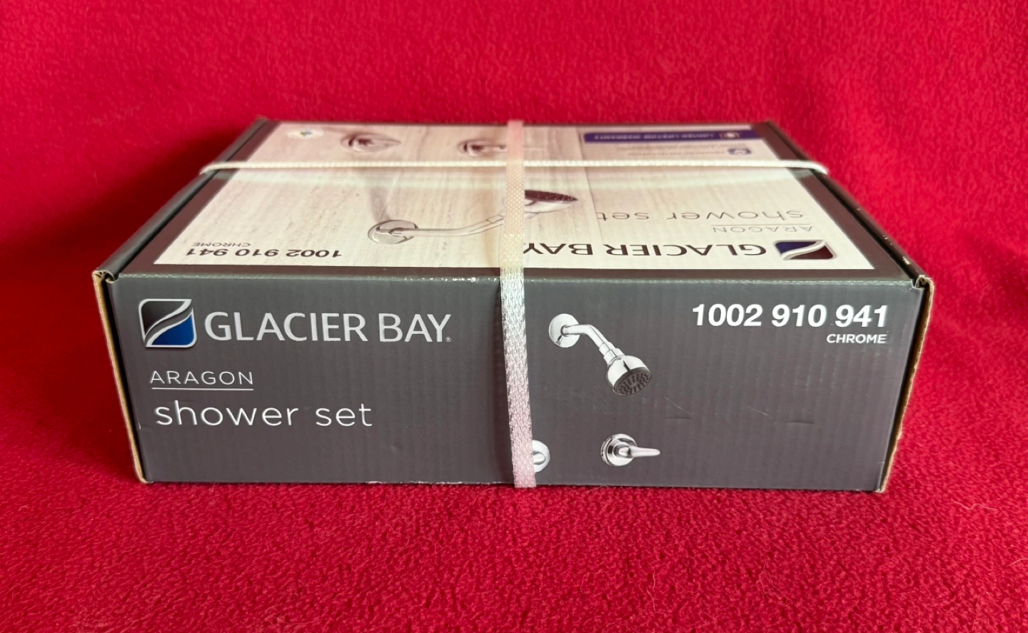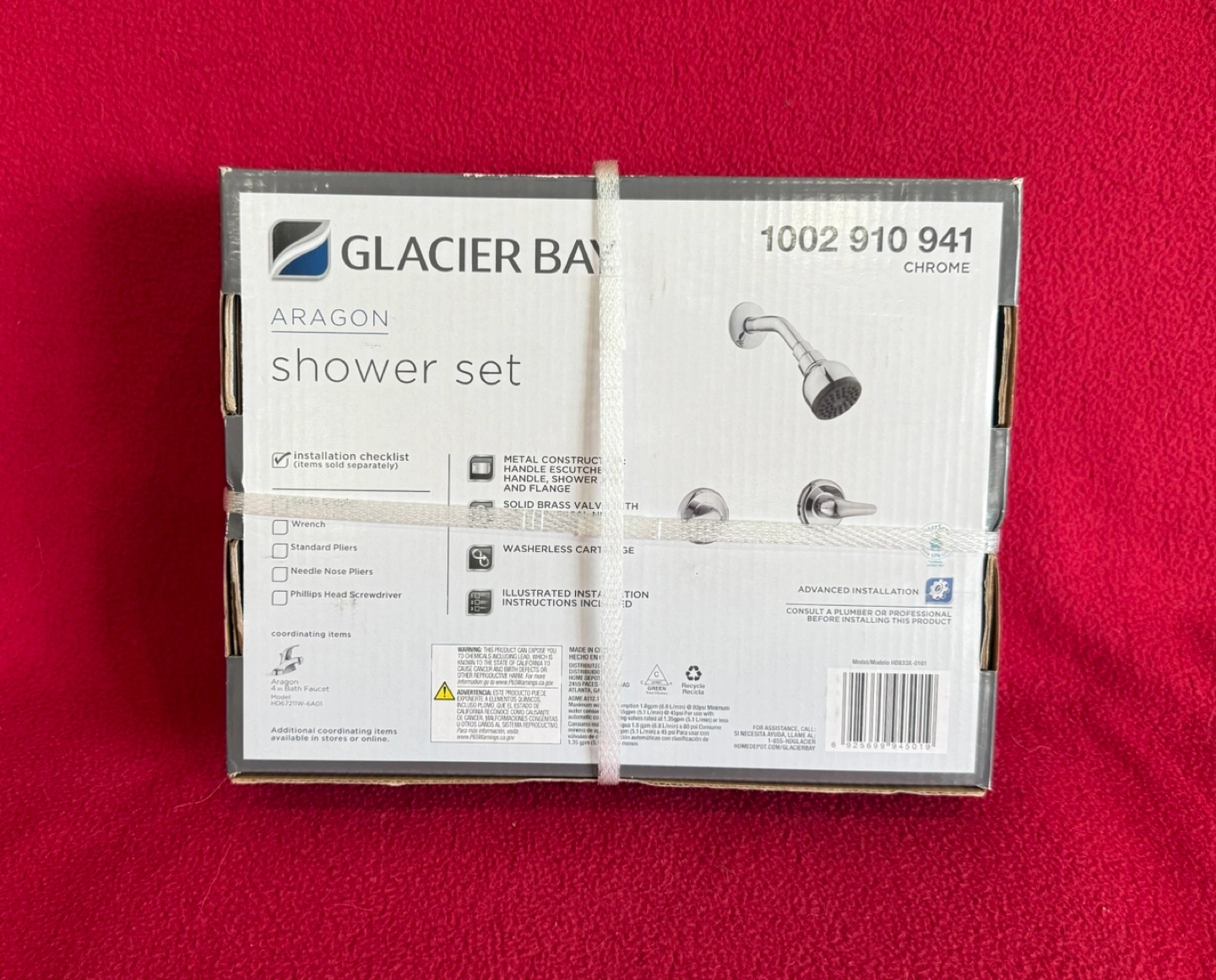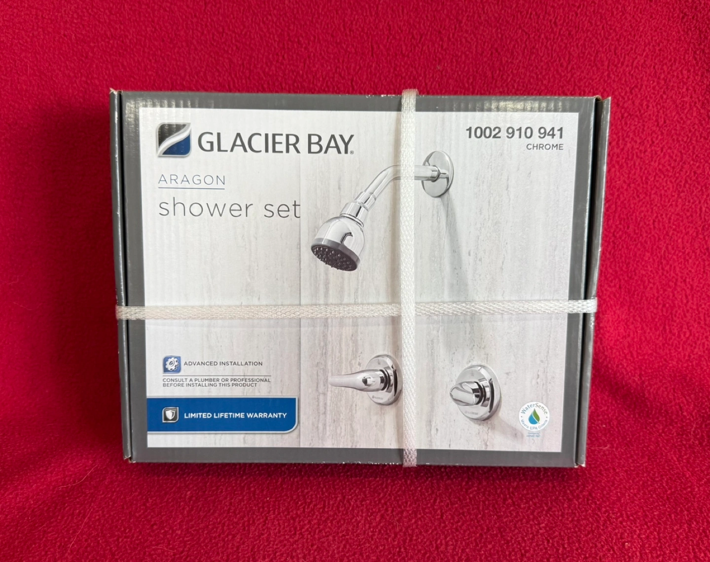 Glacier Bay Aragon shower set. Chrome finish. Includes shower head, handle, and other components. Limited lifetime warranty.