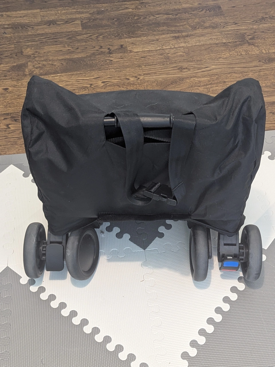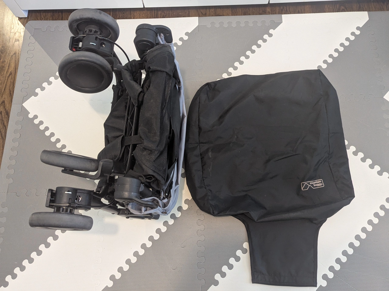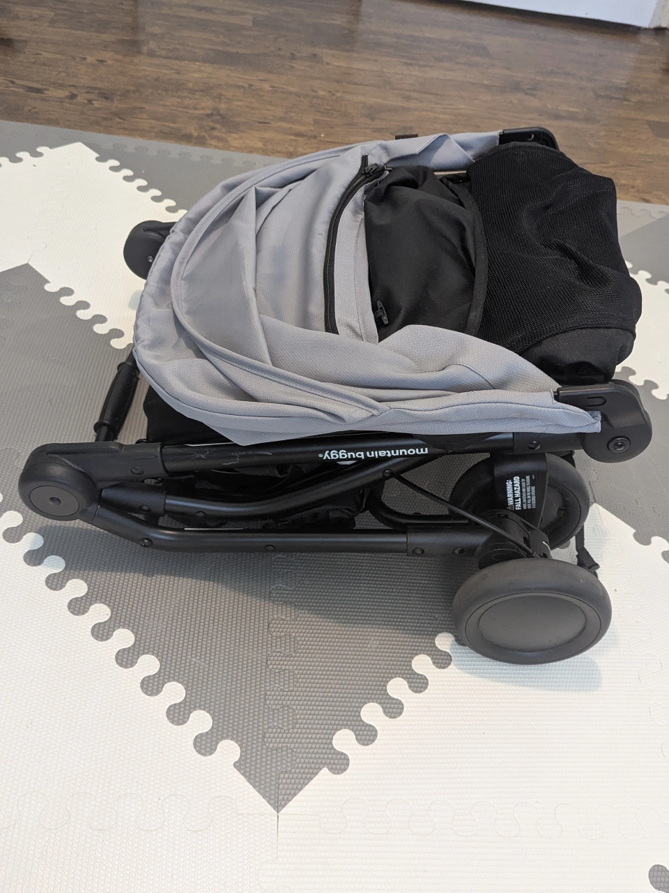 Stroller with black frame and grey canopy. Great little travel stroller that is lightweight and easily foldable. Storage basket at the bottom of the stroller for convenience. Includes travel bag (see photos). Used very lightly.