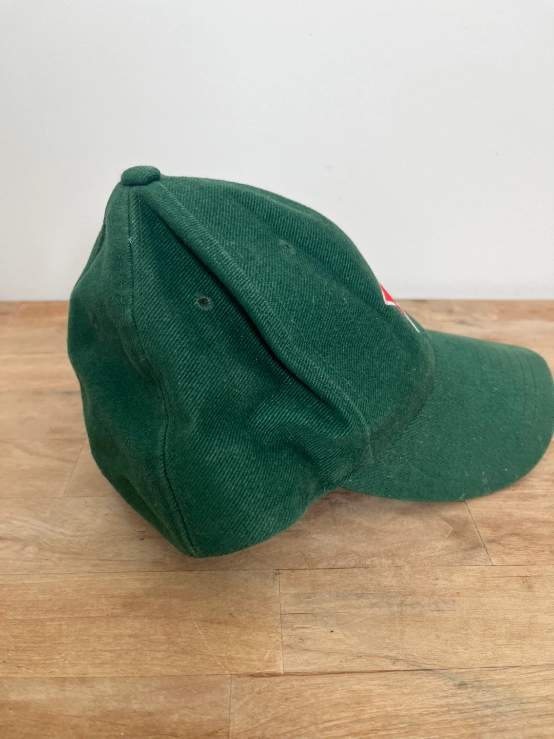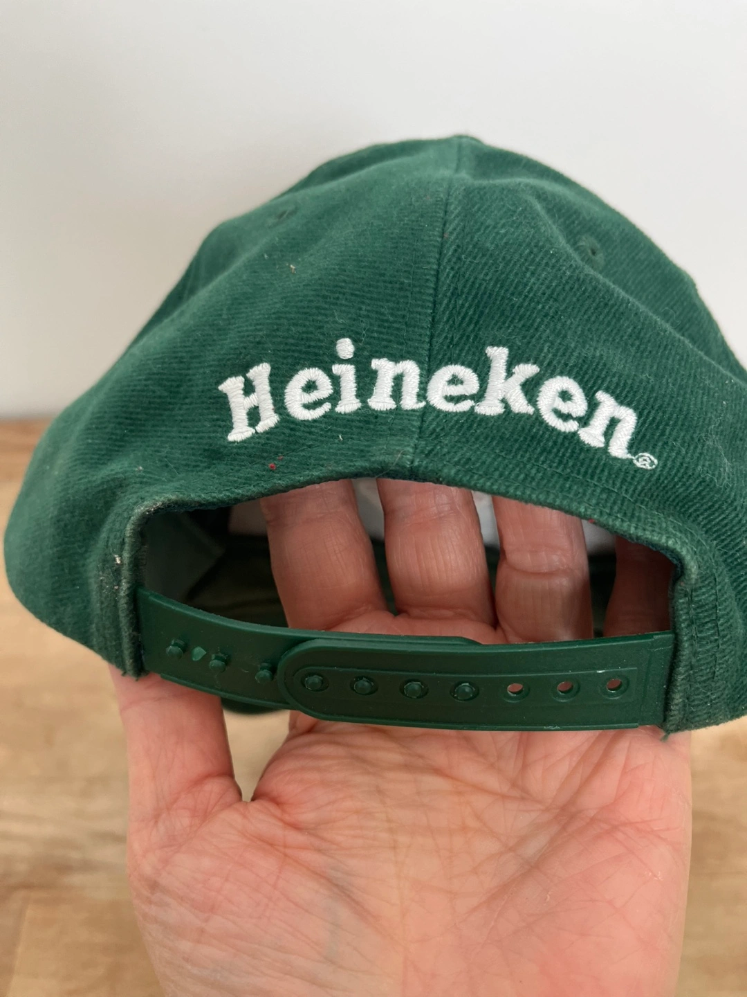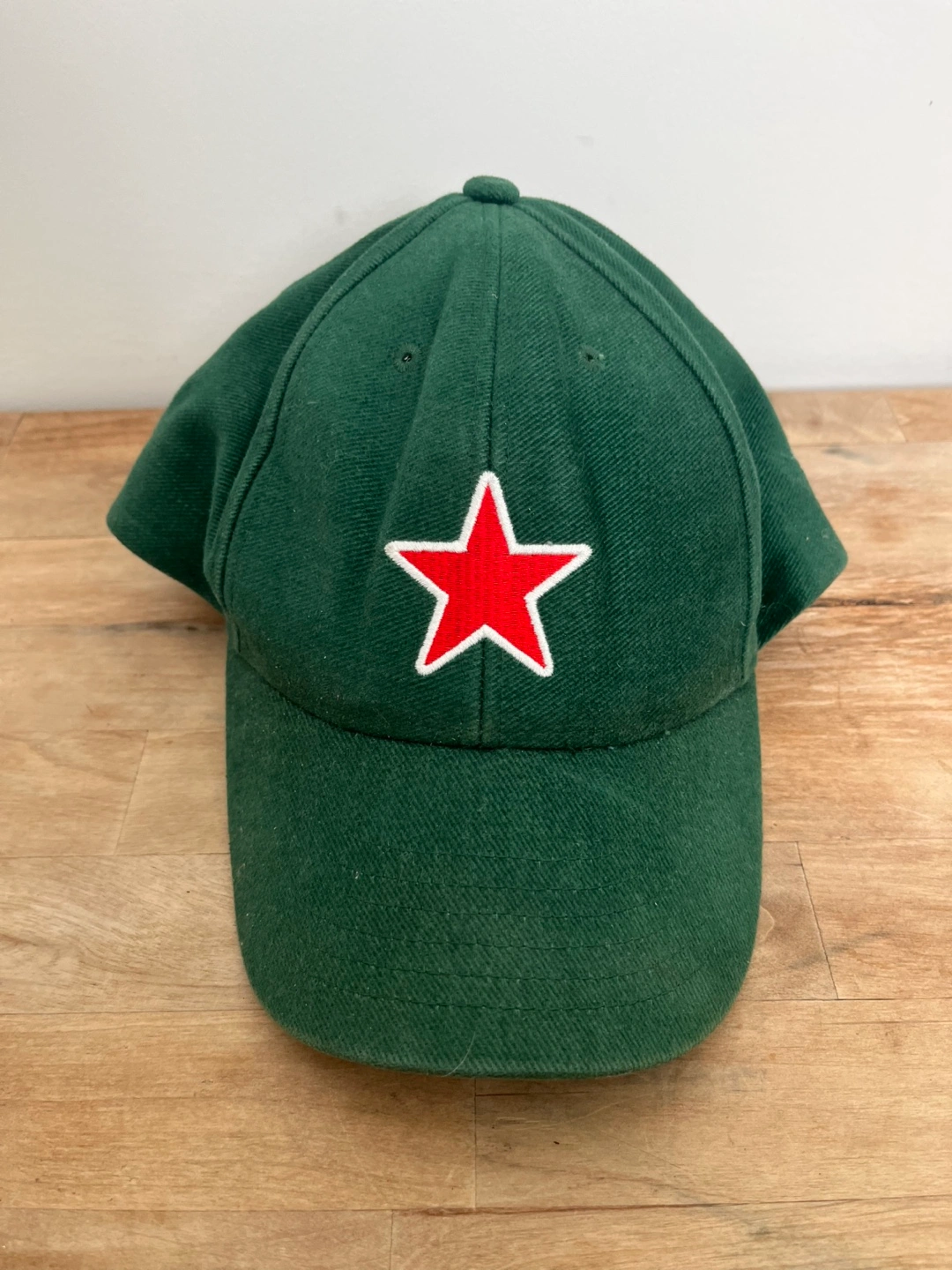 Dark green baseball cap. Features a red star on the front and Heineken branding on the back. Adjustable strap.