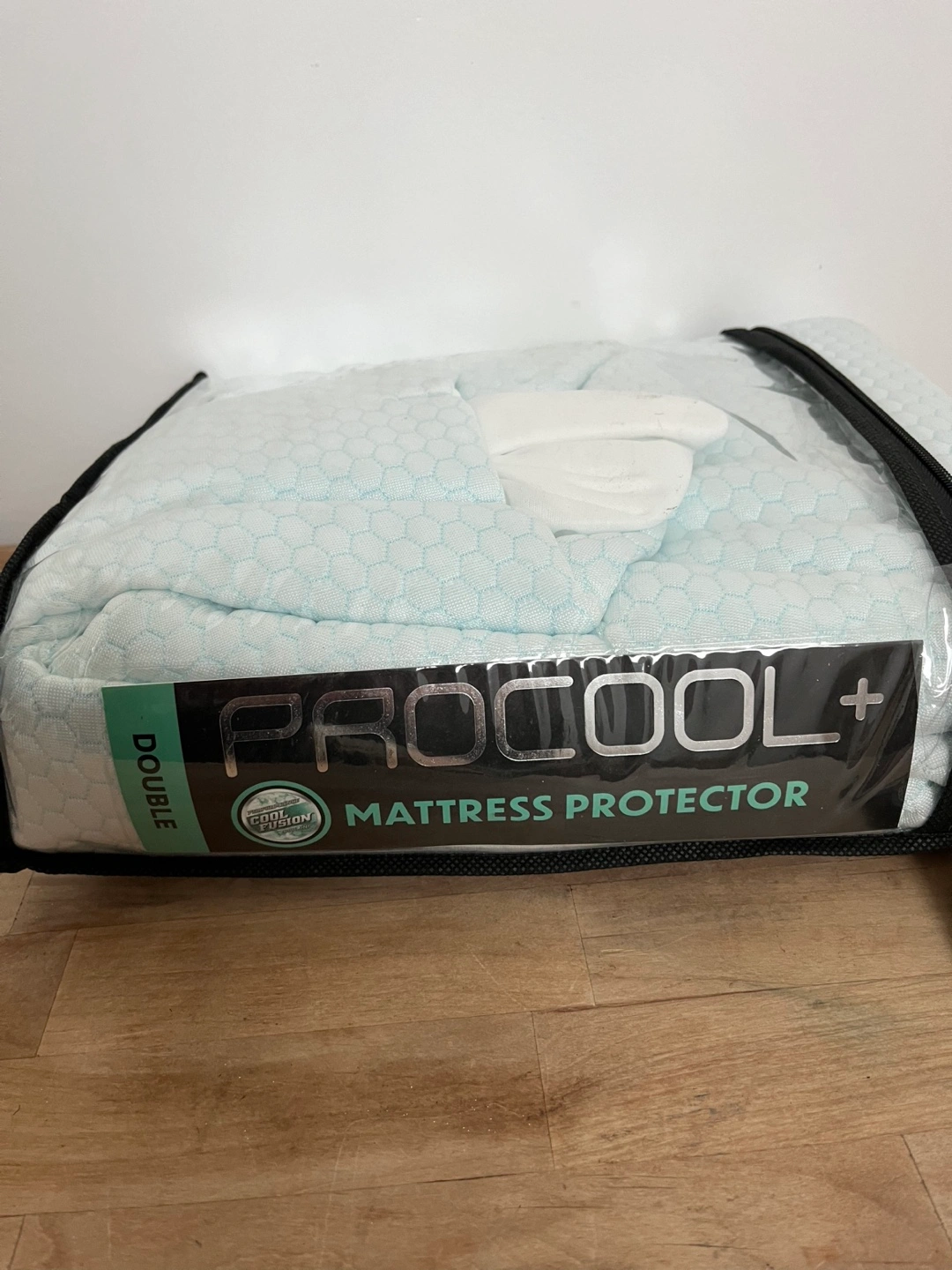 New double mattress protector. Features cooling technology. Water and stain resistant. Machine washable. Cool and comfortable all year round.