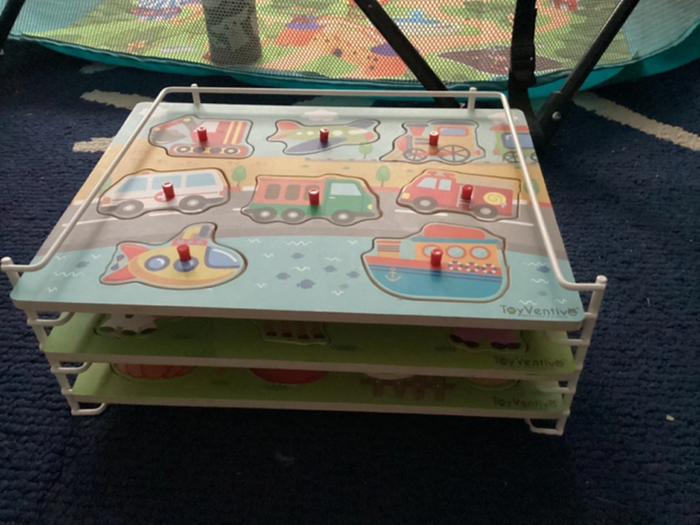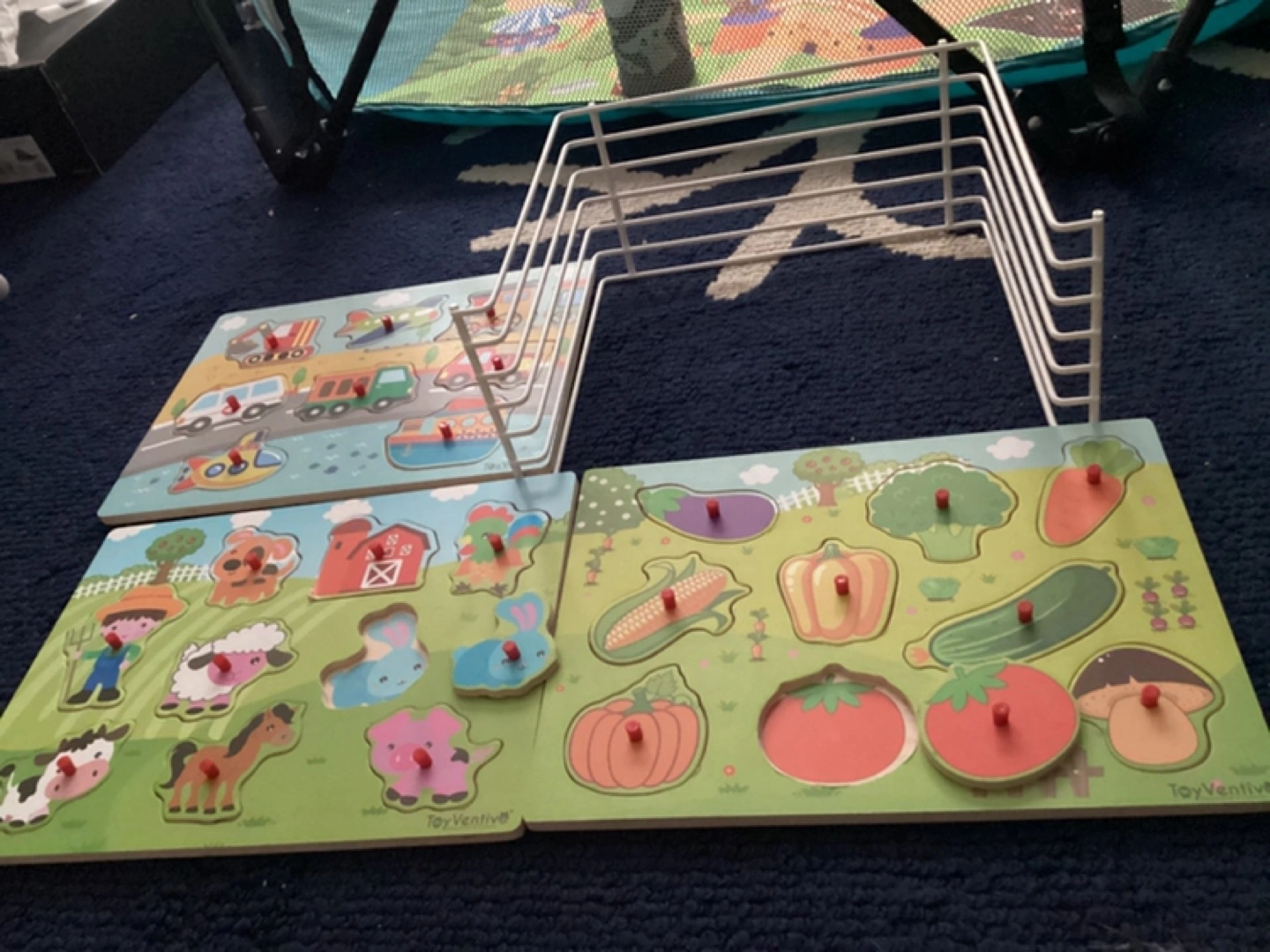 Three wooden chunky puzzles. Farm animals, vehicles, and vegetables. Includes a white wire storage rack. Check my other puzzles and toys.