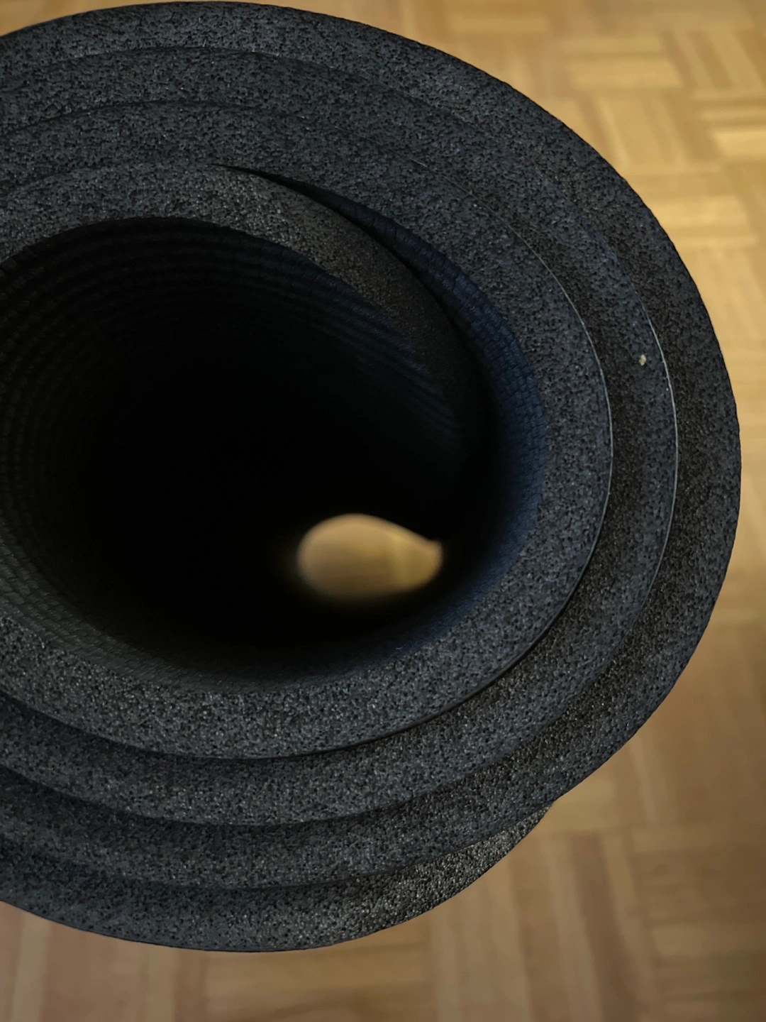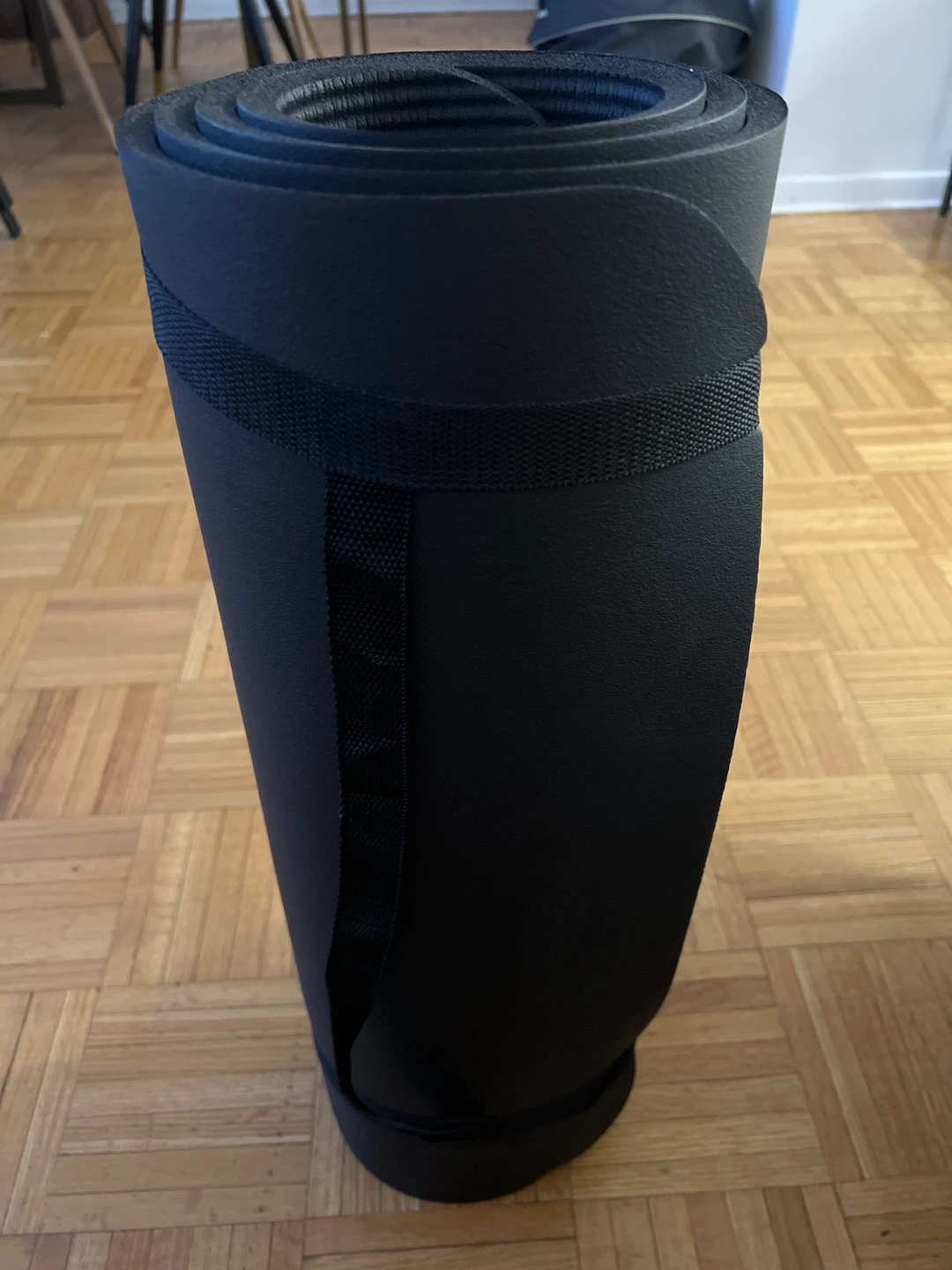 2mm thick black exercise or yoga mat. Rolled up with carrying straps. Great for yoga, Pilates, or floor exercises. Very Good quality. Brand new, never used. unsealed.