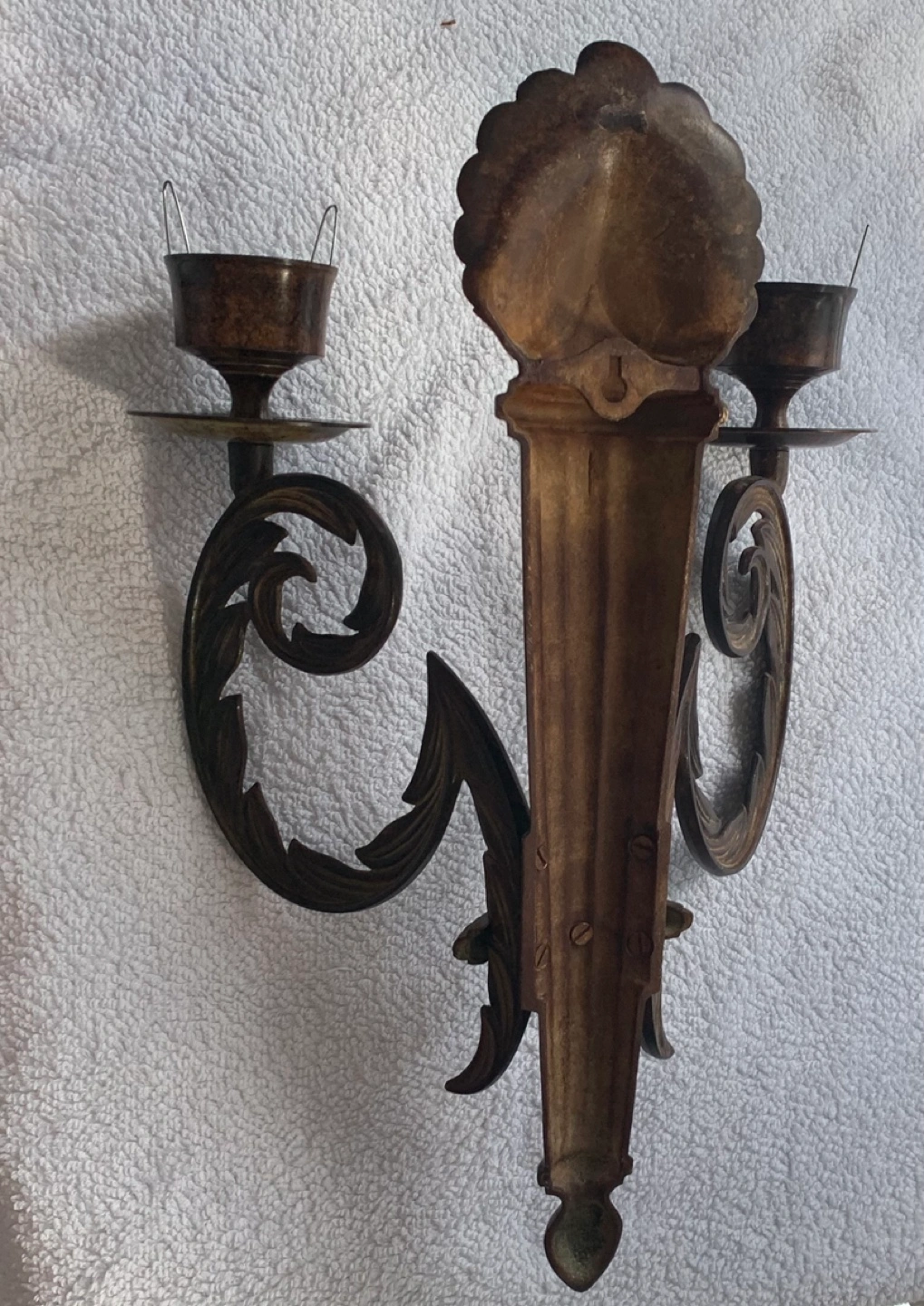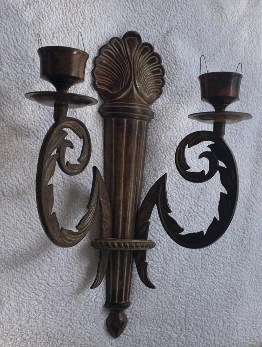 Ornate wall-mounted candle holder. Features two candle cups and decorative scrolling arms. Dark brown finish. Vintage style.