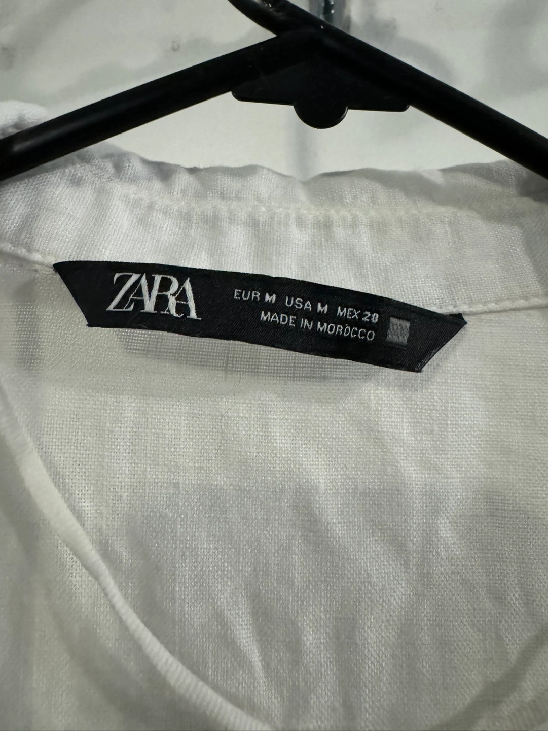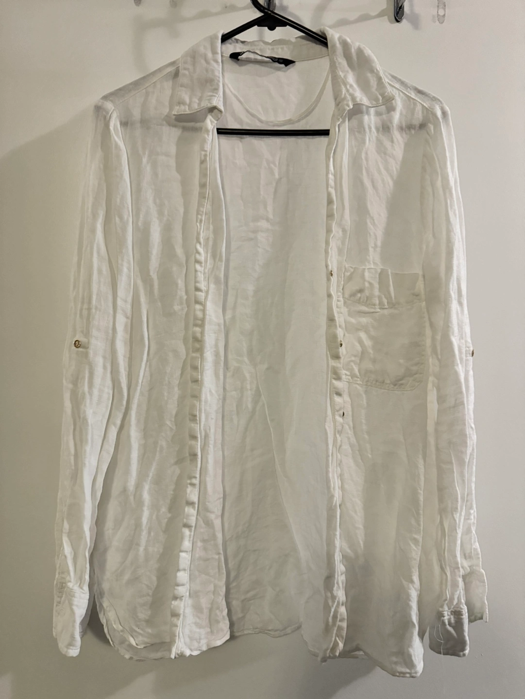 1000+Long sleeve button-up shirt. White linen. Size Medium. Gold coloured buttons. Chest pocket.