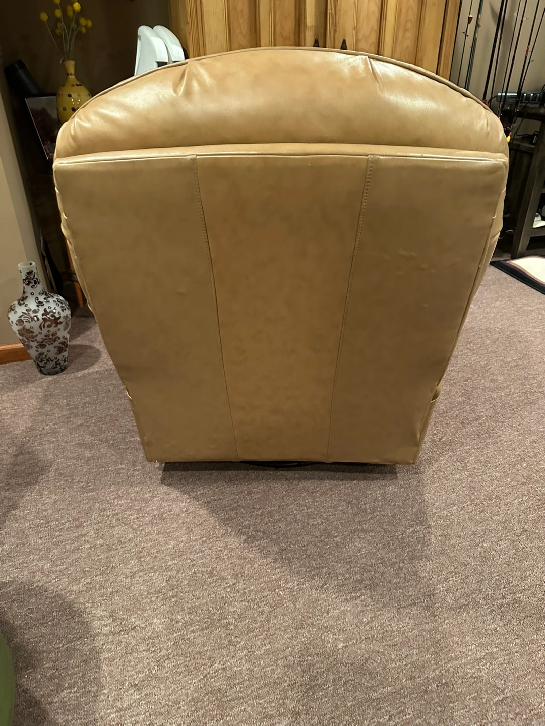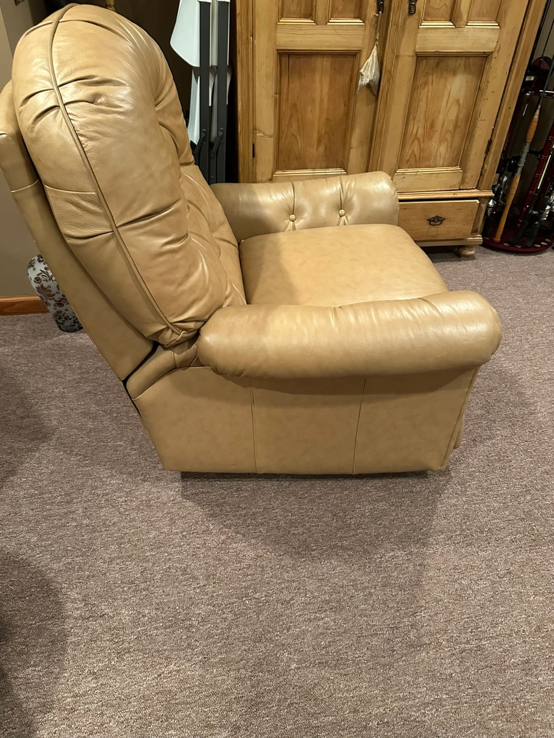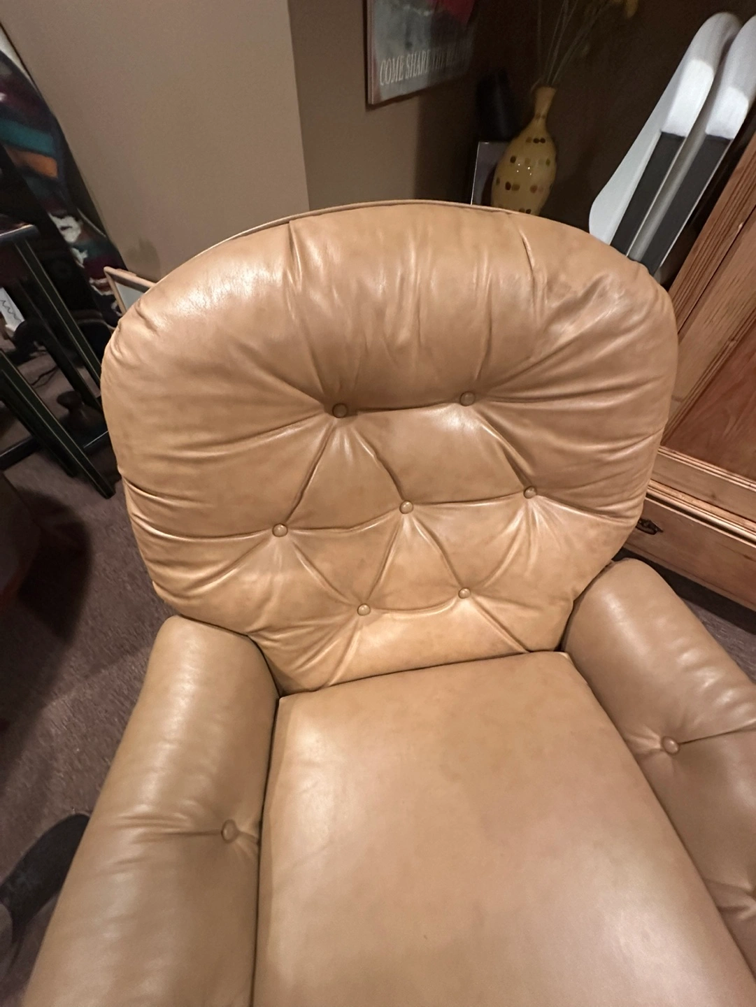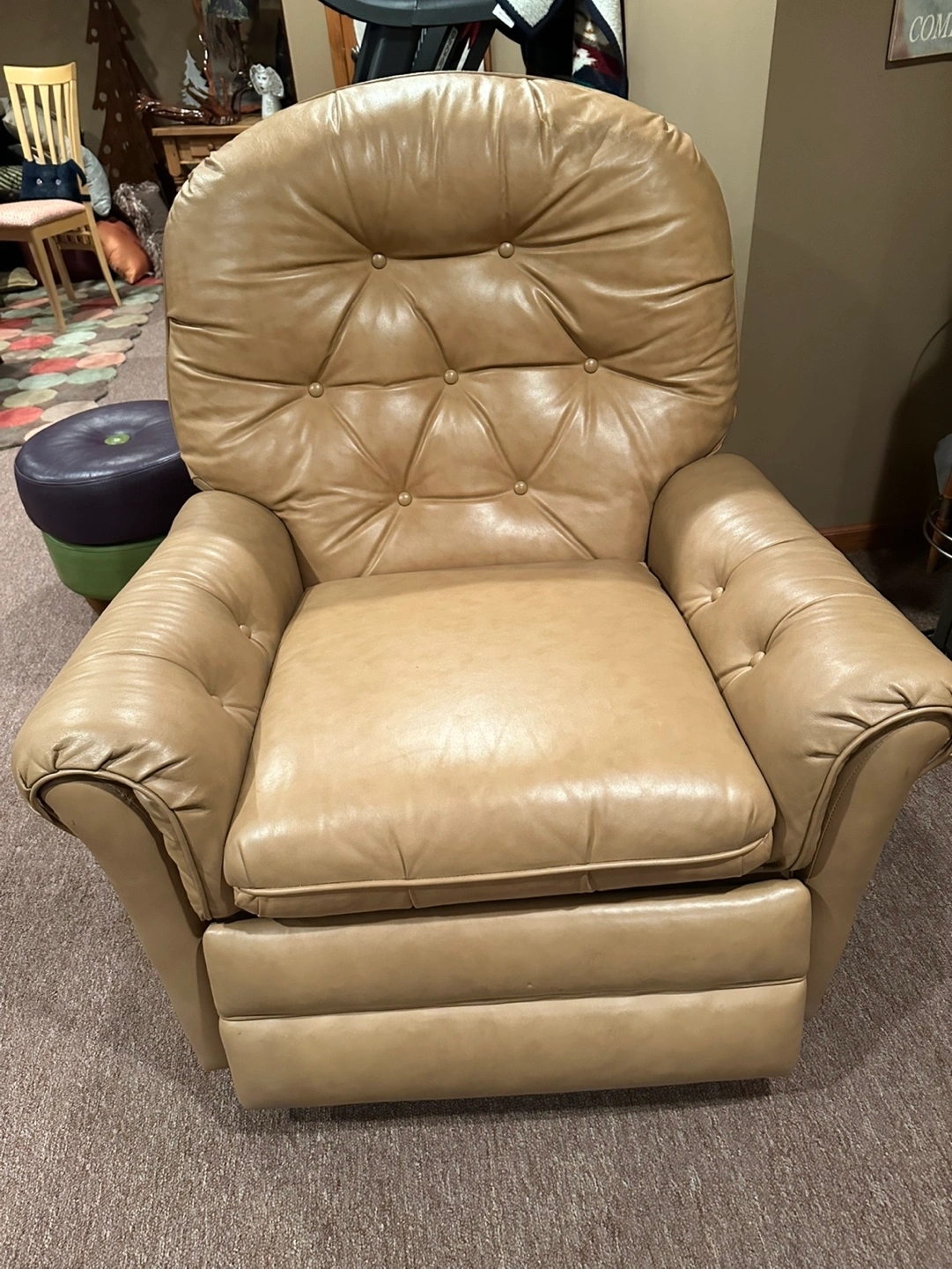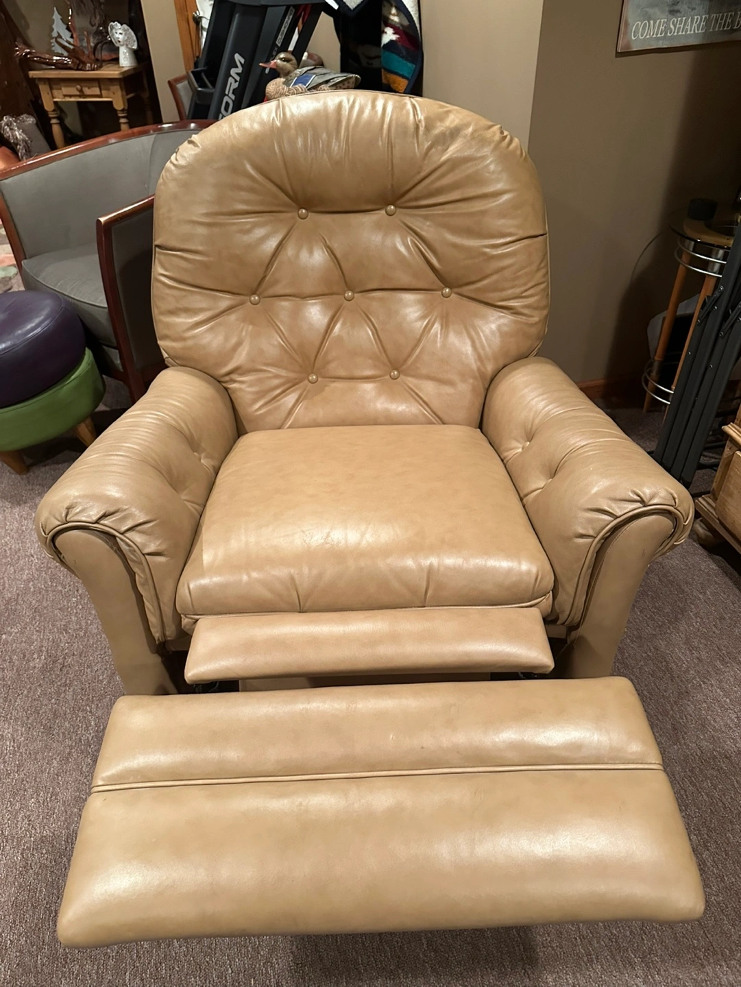 Tan leather recliner. Button-tufted back and seat. Reclining mechanism and footrest.