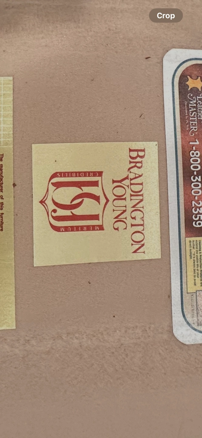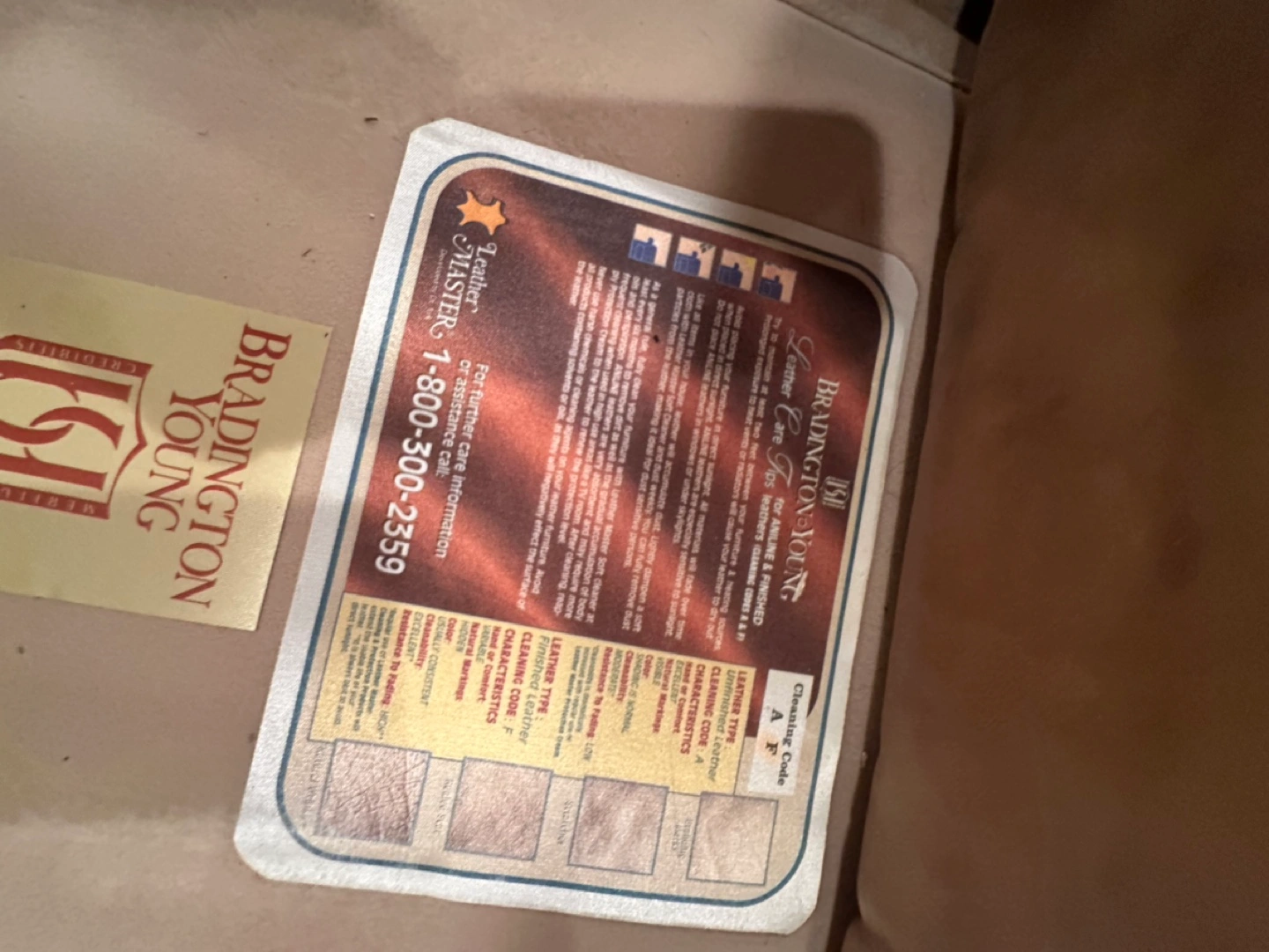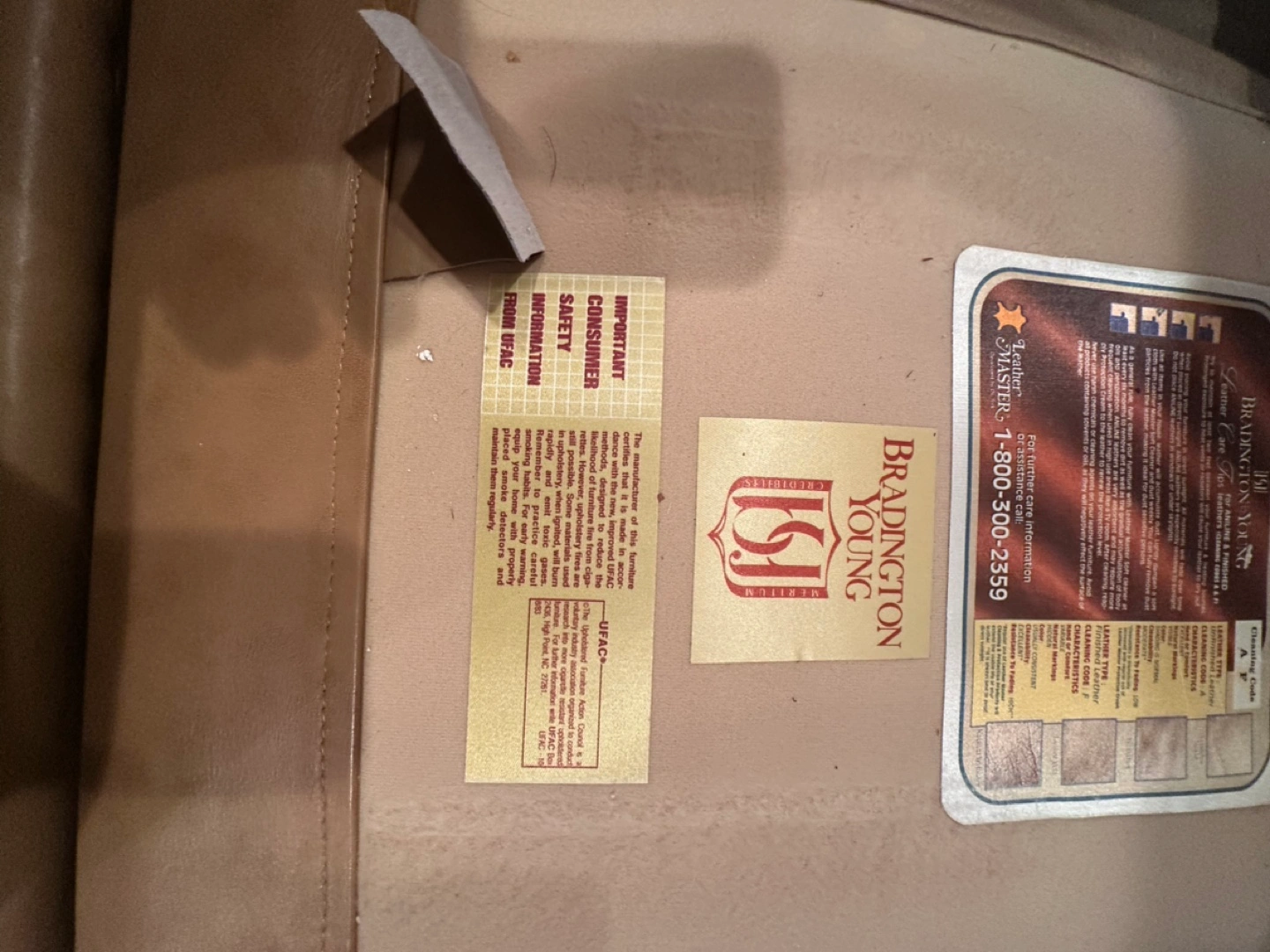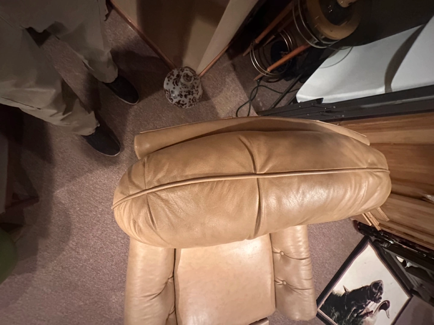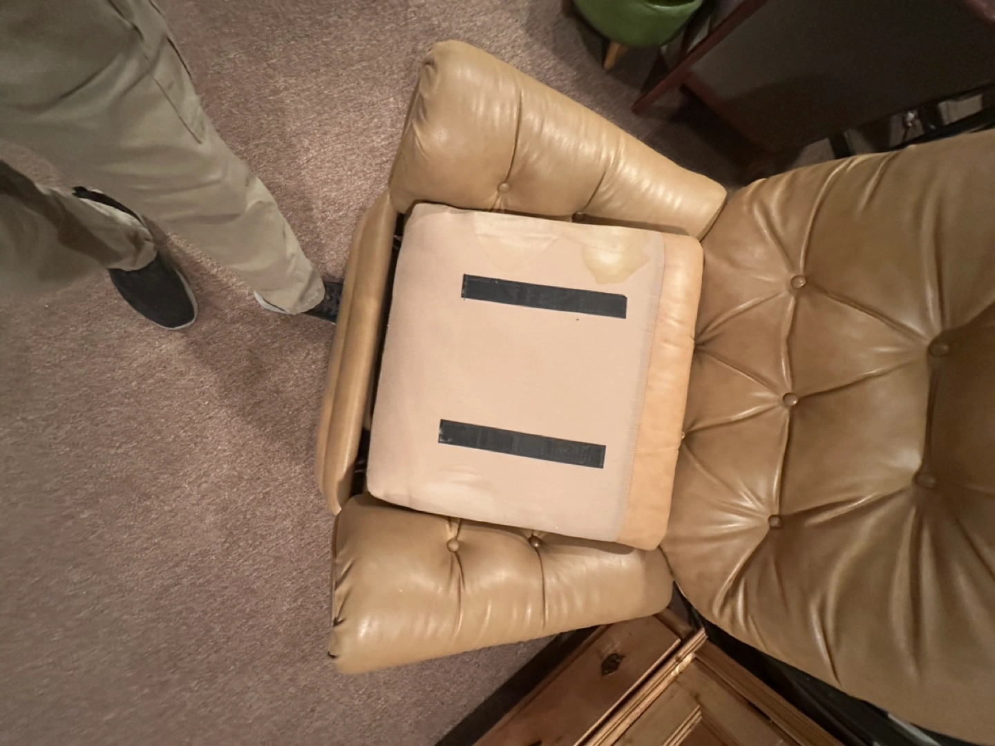 Tan leather recliner. Button-tufted back and seat. Reclining mechanism and footrest.