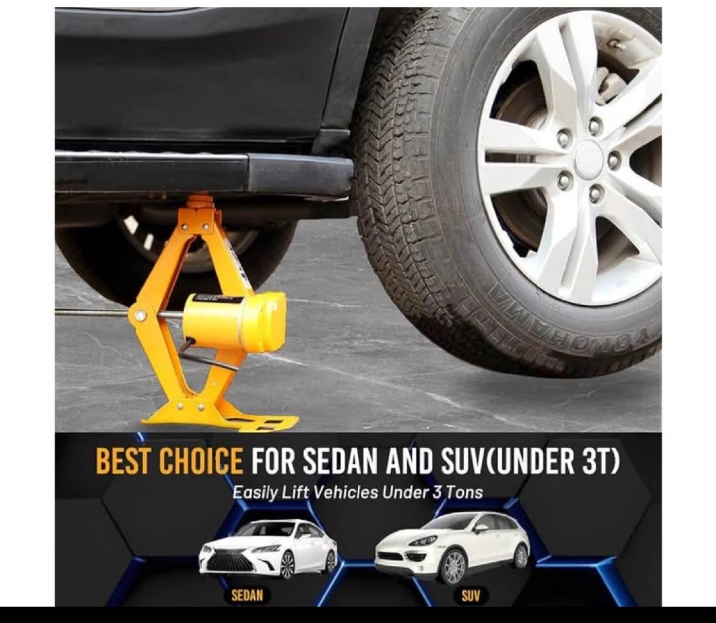 This electric scissor jack must be used on a flat ground and placed parallel to your car. Thanks to its overrall sturdy construction large base and saddle this electric car jack is super strong and stable. To ensure maximum safety this jack will automatically stop working when it reaches the height limitation (16.5in). Best choice for Sedan and SUV(under 3T): Comes with two different raised heads for Sedan and SUV this electric car jack can easily lift vehicles under 3 tons but DO NOT use it on the trucks and those beyond 3 tons. To power the jack you can either connect it to cigarette lighter or car s battery. When running into roadside Get Done in Minutes: It takes ONLY about 2 minutes to reach a maximum height (17in) with loading capacity as high as 3T. Whether men or women can replace the tire with ease in any emergent case.Save Effort :electric car jack with Controller is perfect for emergent roadside tire change and repair. Built-in flashlight for Night Use: The convenient built-in flash LED light enables operation at night or in the dimmed light without any additional lighting tools.Besides it s totally water-proof so you can use it even on rainy day.Especially including a newly developed jump starter the car repair tool let you no more fighting with an old-fashioned hand jack or the dark of a night.Just power on the jump starter and touch a button for smooth lift Professional Double-Purpose Tool Box: The Package includes electric car jack x1(SUV headx1 Sedan headx1) a suitcase and 2 spare fuses.The structure of the electric car floor jack is succinct and easy to operate with a compact and organized storage box. All the electric jacks are equipped with a powerful firm suitcase which helps keeping the components and parts well organized and conveniently fits in your vehicle.By the time it can also act as a road sign when you stand it behind the car.