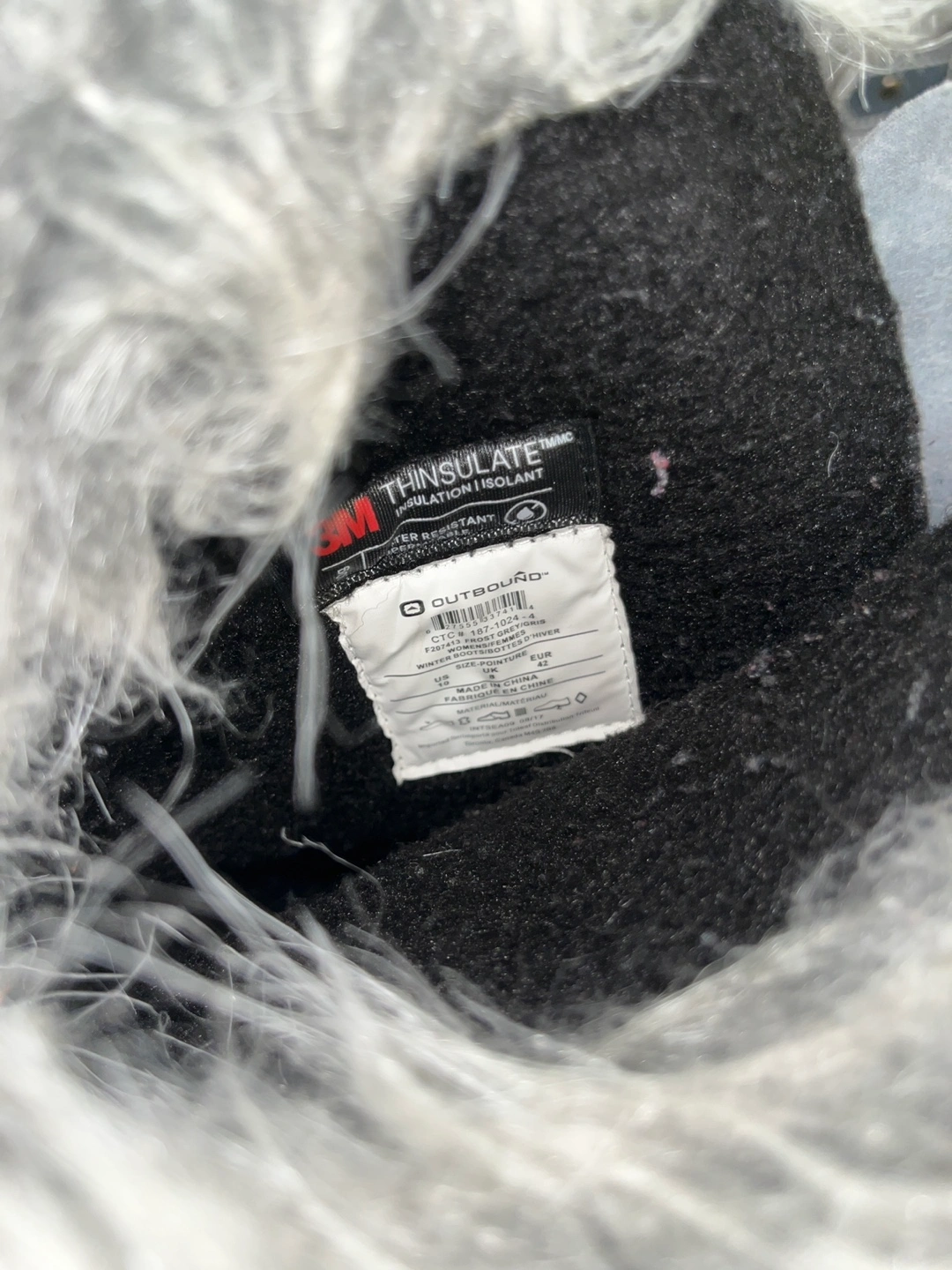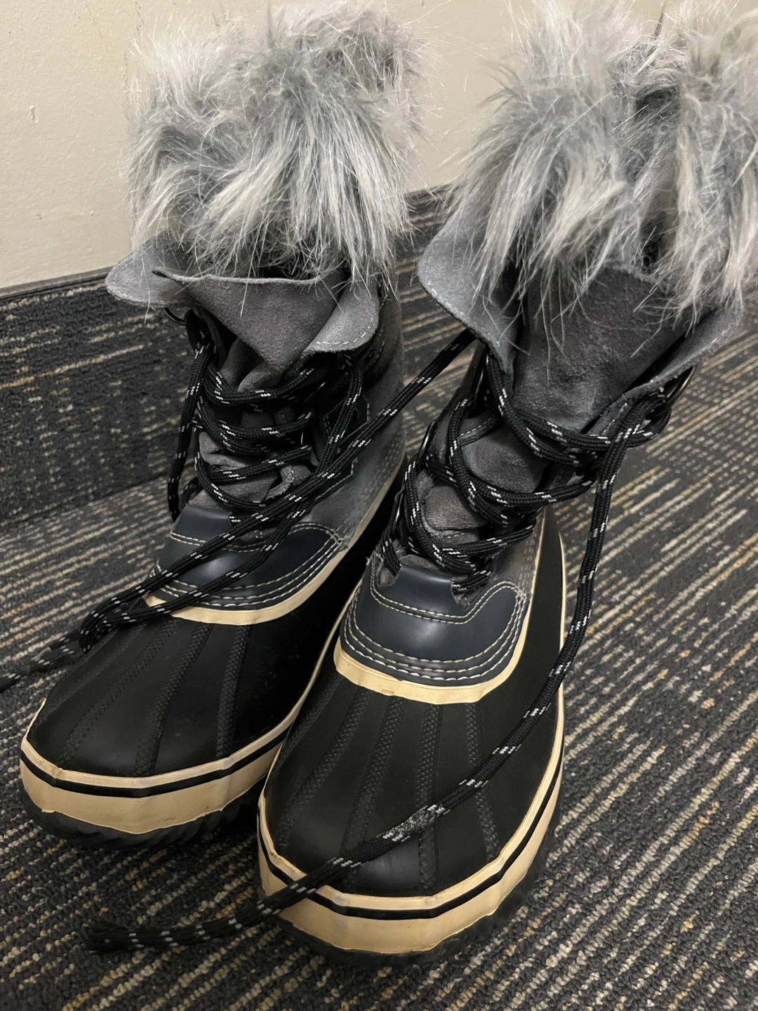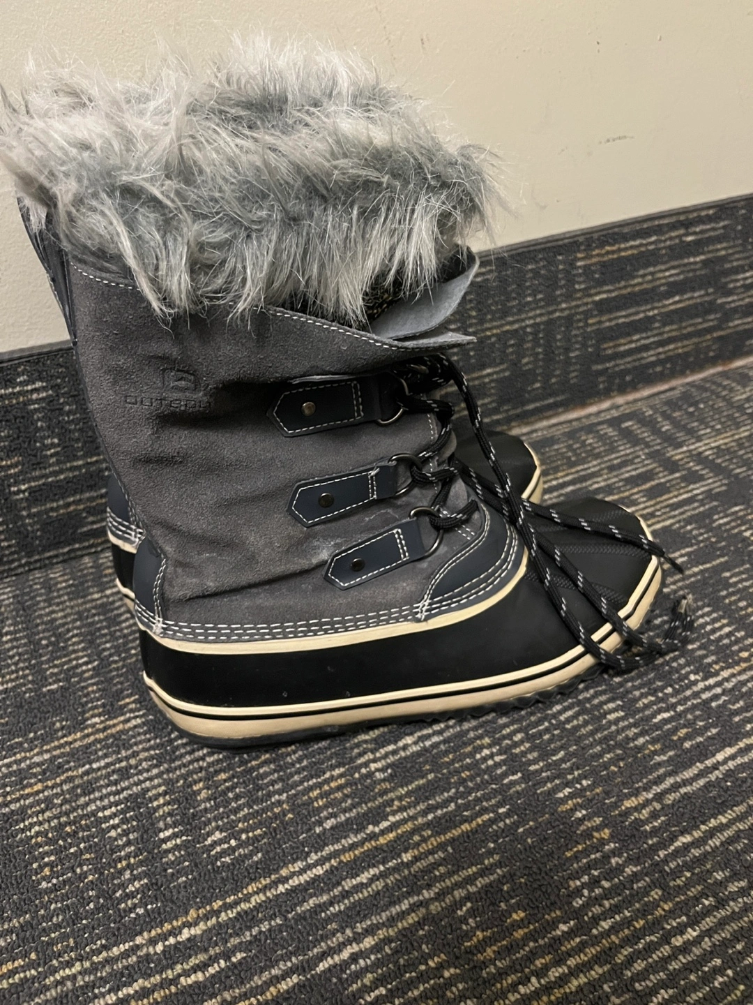 Warm winter boots. Grey suede upper, black rubber sole. Faux fur trim. Lace-up closure. Thinsulate insulation. Excellent for snow and cold weather. Pre-owned, good condition.