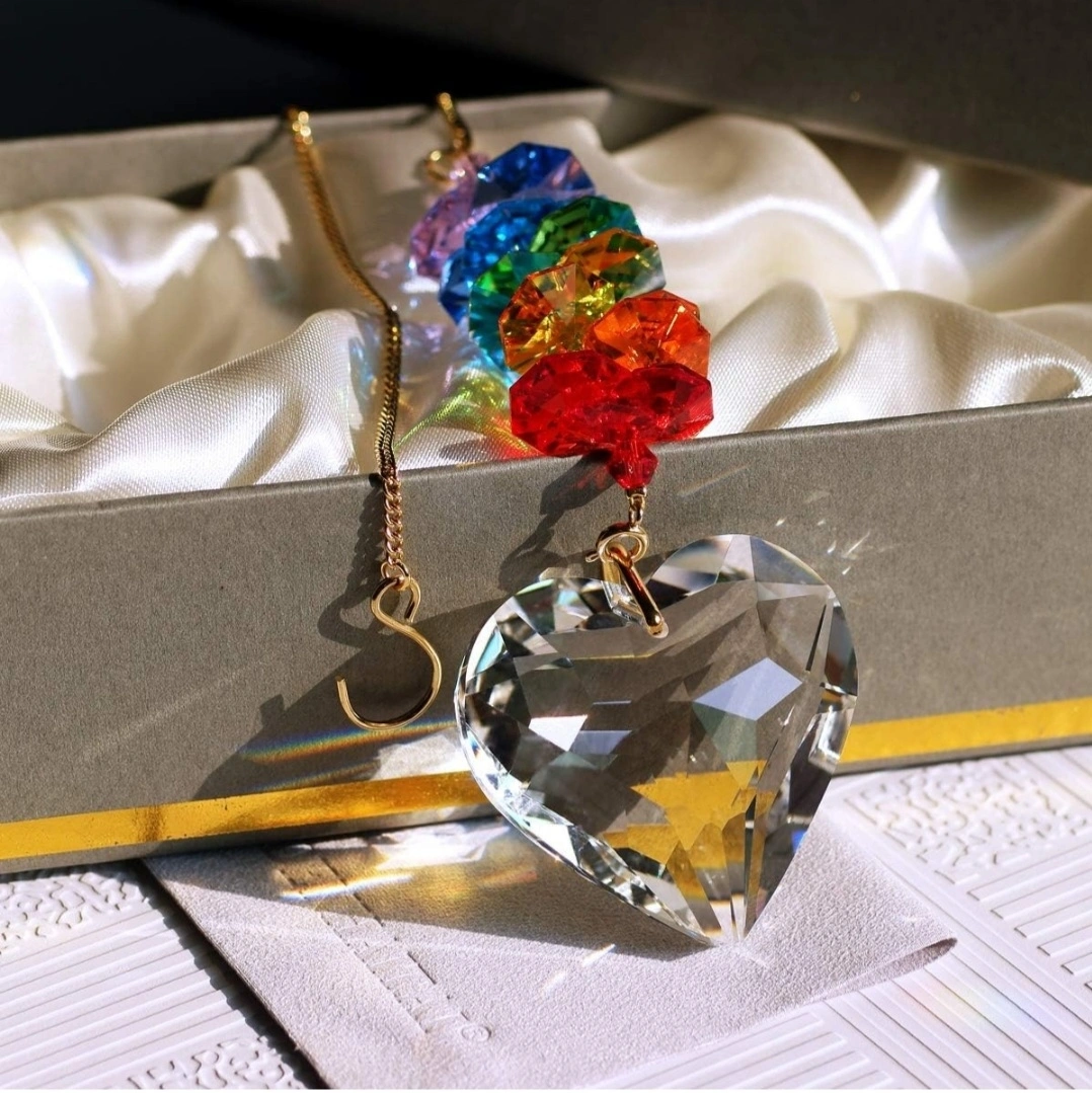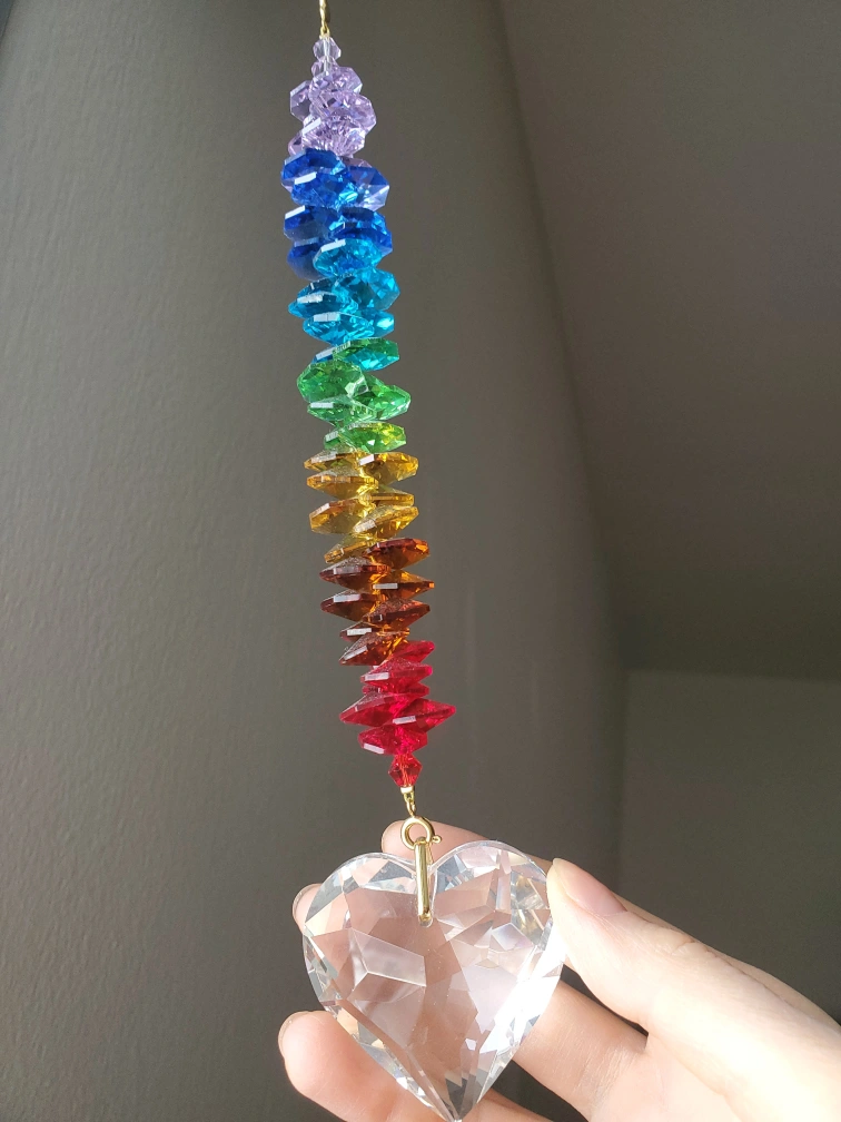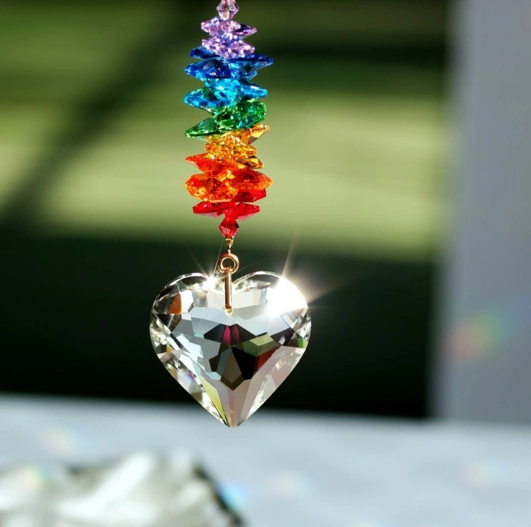 Gorgeous crystal suncatcher. Features a clear heart-shaped crystal. Rainbow colored crystals hang above. Gold chain and hook included. Beautiful addition to any window.