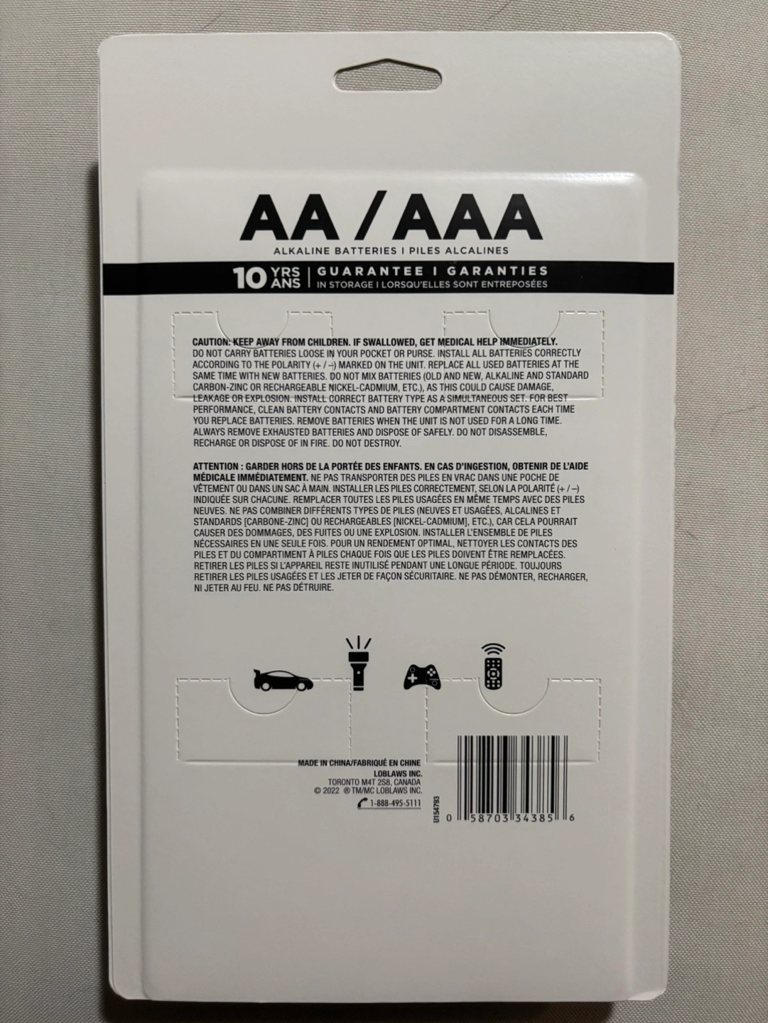 Bulk pack of President's Choice AA and AAA alkaline batteries. 10-year guarantee. New in package.
