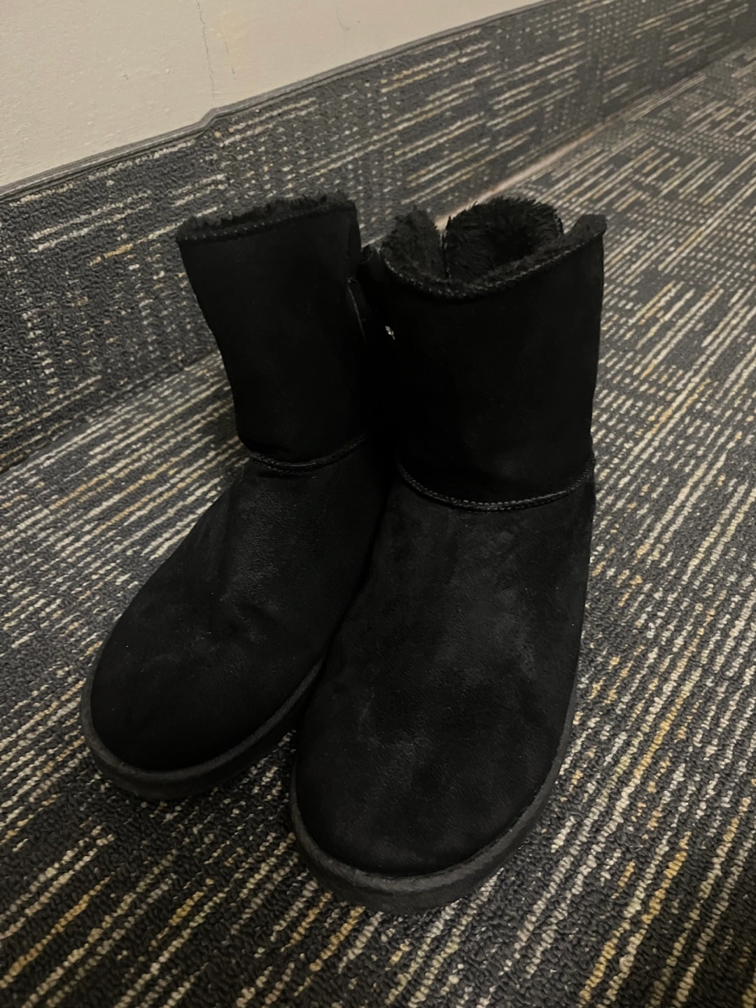 Pair of black suede ankle boots. Fuzzy lining. Side zipper closure. Good for winter. There is a small hole but can be fixable by a shoe cobbler.