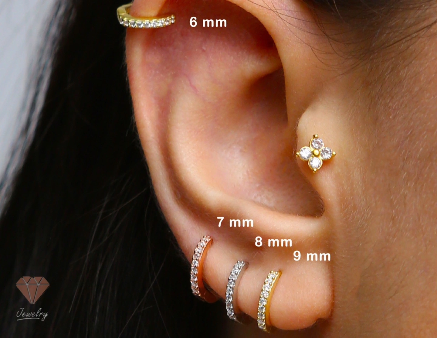 Set of four dainty hinged clicker hoops. Sizes available: 6mm, 7mm, 8mm, and 9mm. Turquoise and clear cubic zirconia accents. Rose gold colour.
