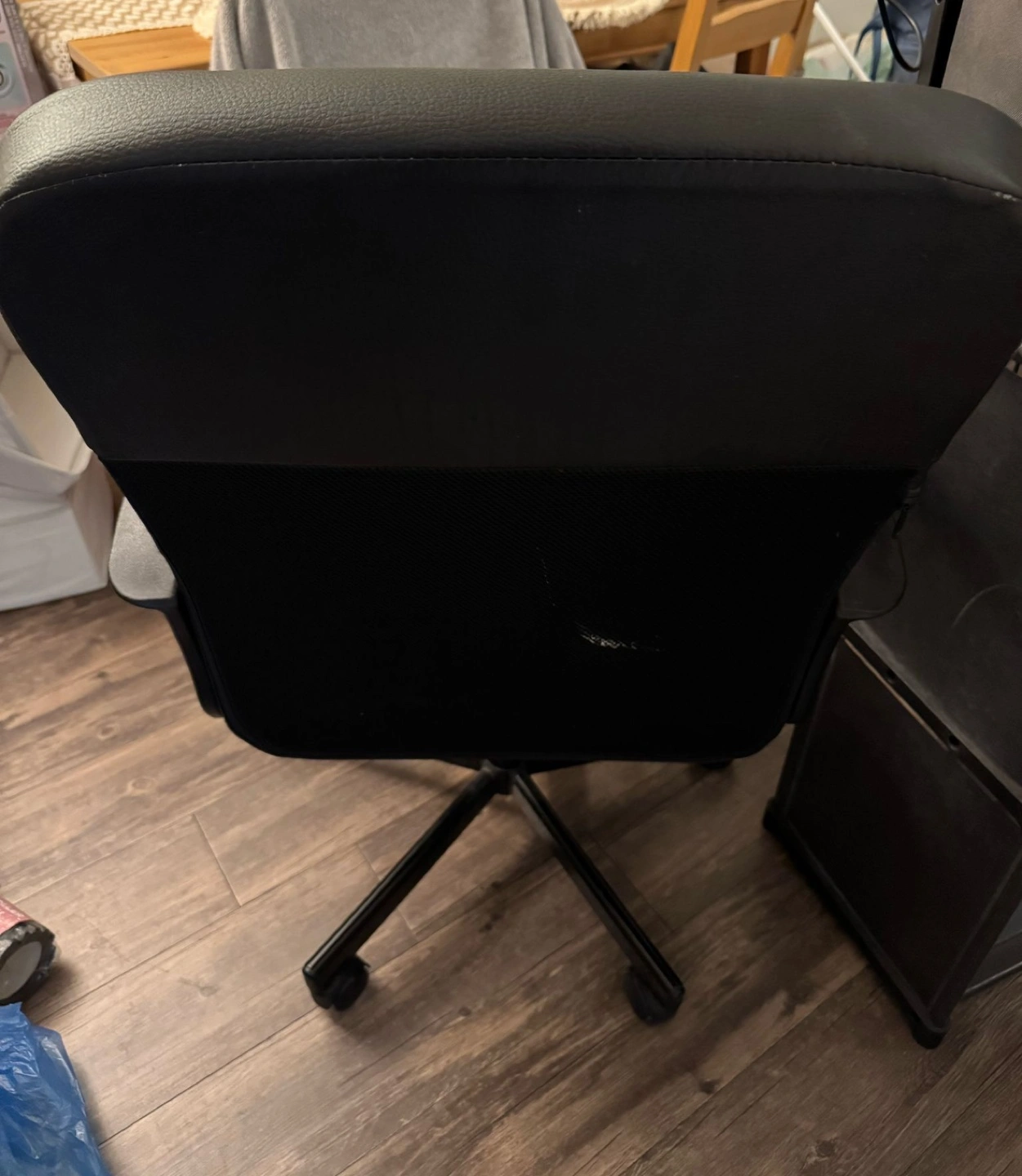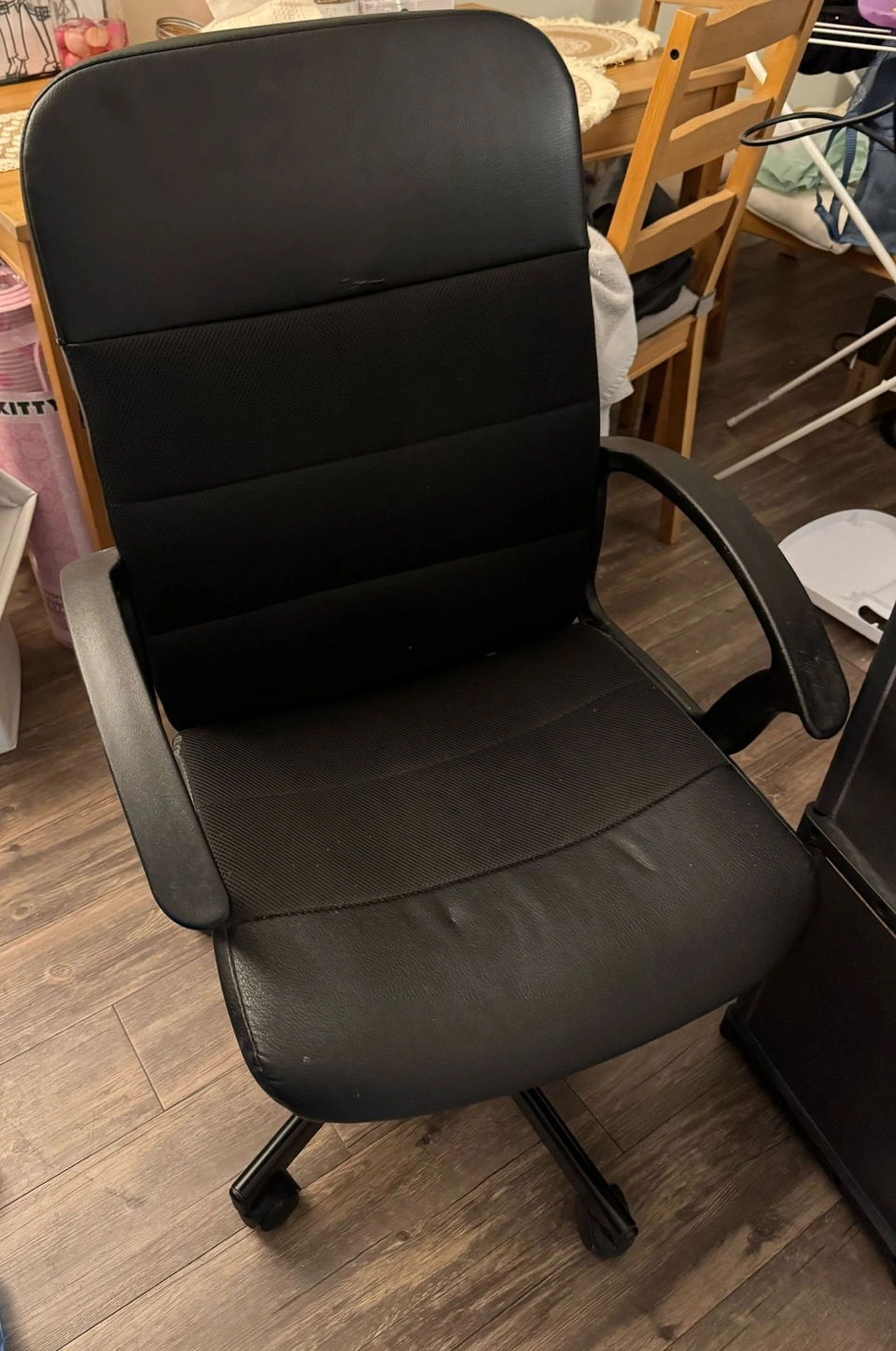 Comfortable office chair, black faux leather. Features armrests and rolling casters. Suitable for home or office use. Minor wear and tear.