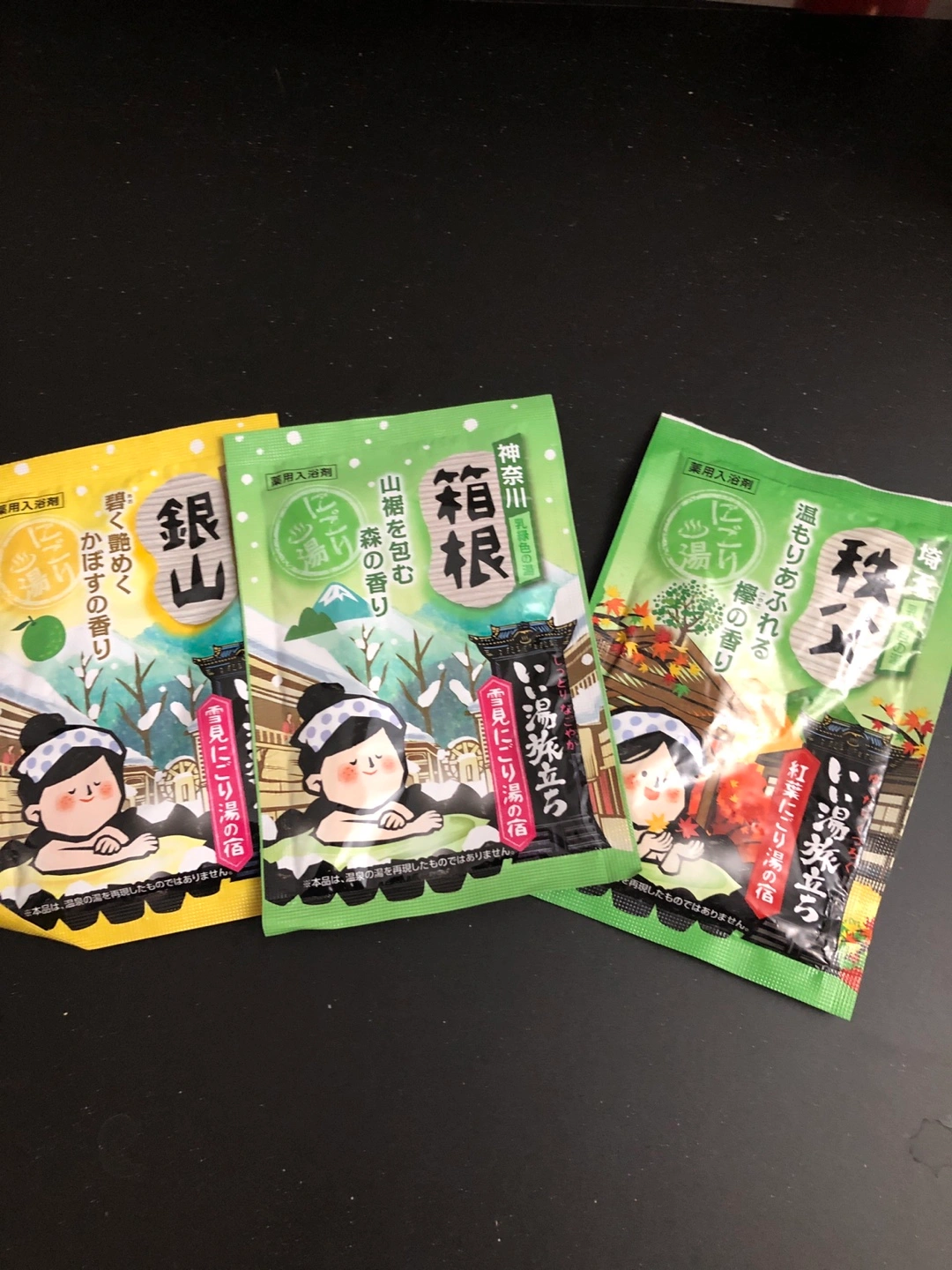 Three packets of Hakujouen Japanese bath salts. Scented bath salts, relaxing experience. Each packet contains enough for one bath.