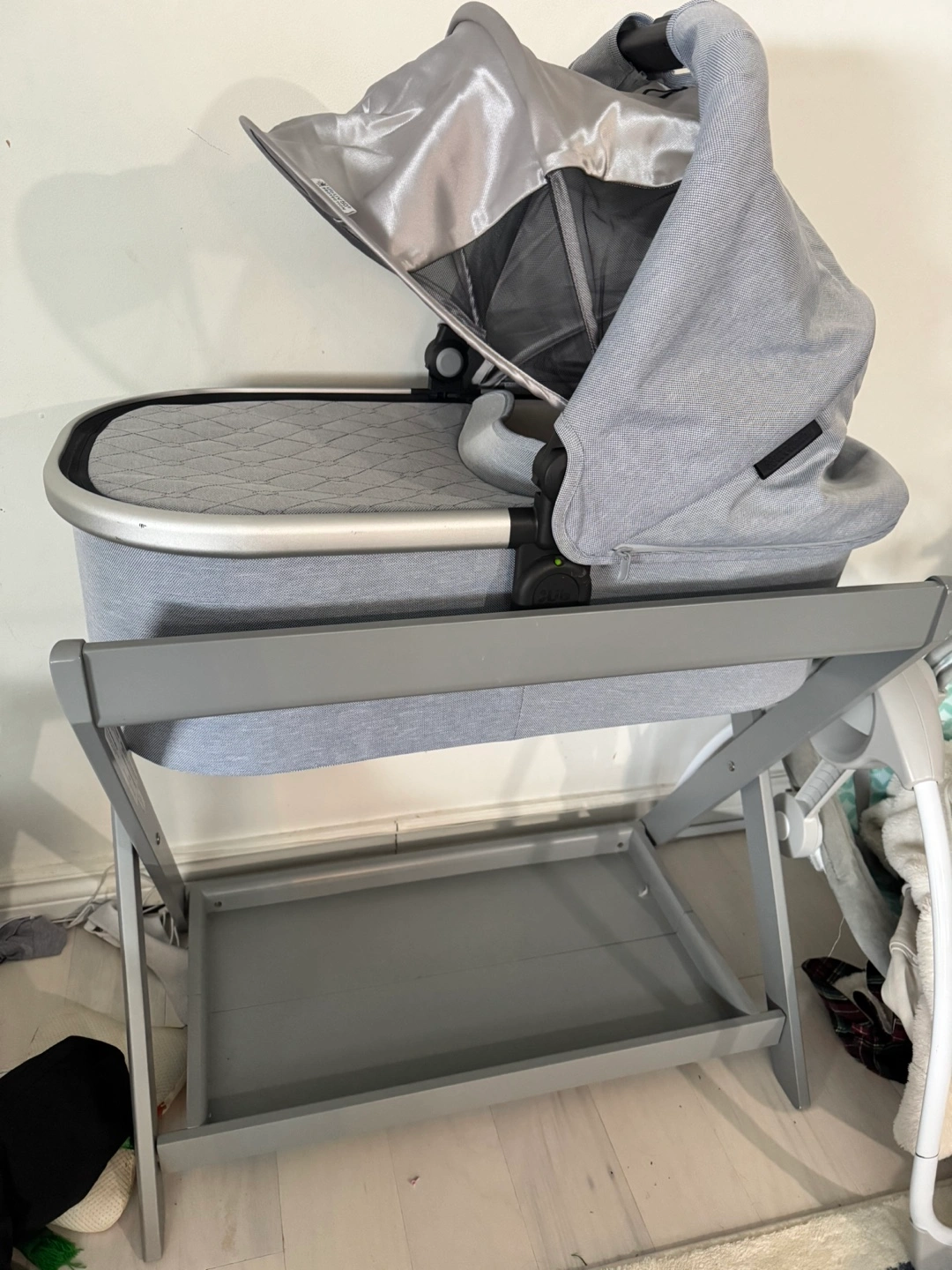 Blue/Grey Uppababy bassinet with stand. Excellent condition. Stand converts into laundry hamper after you no longer need the stand for the bassinet. Will include the laundry bags that come with the stand.