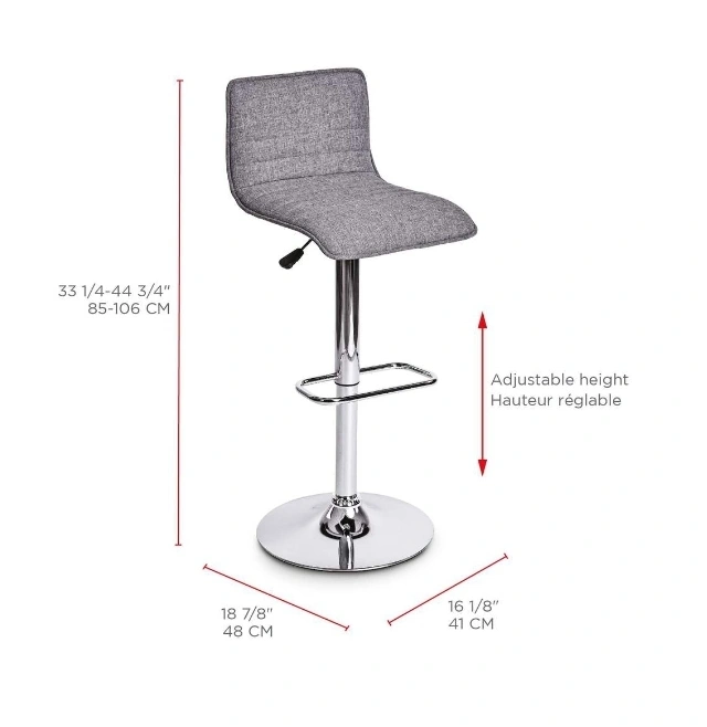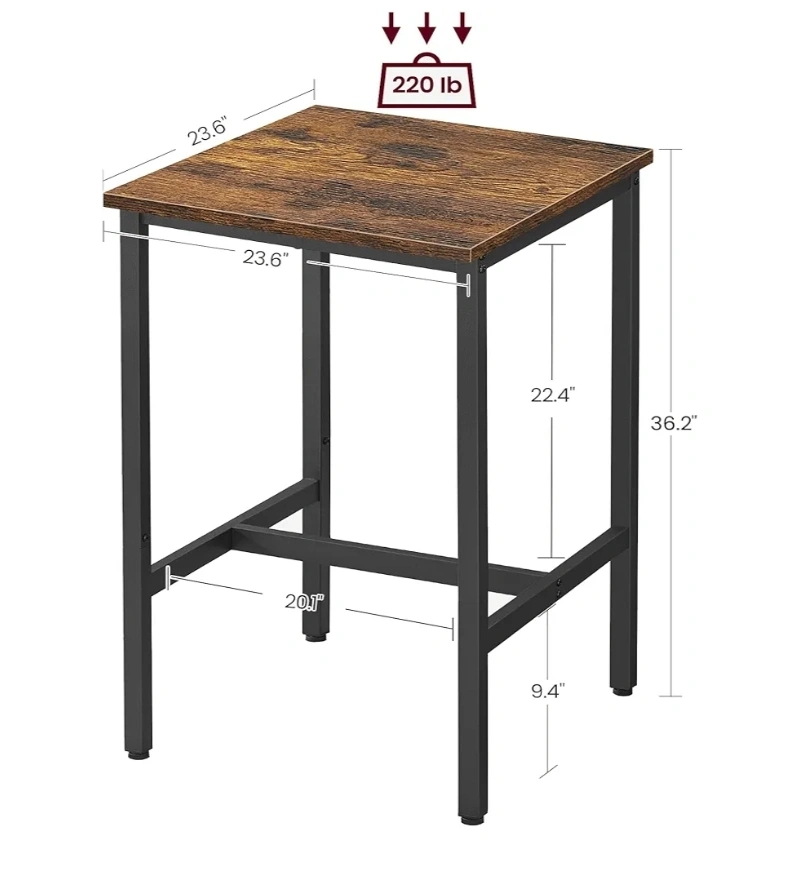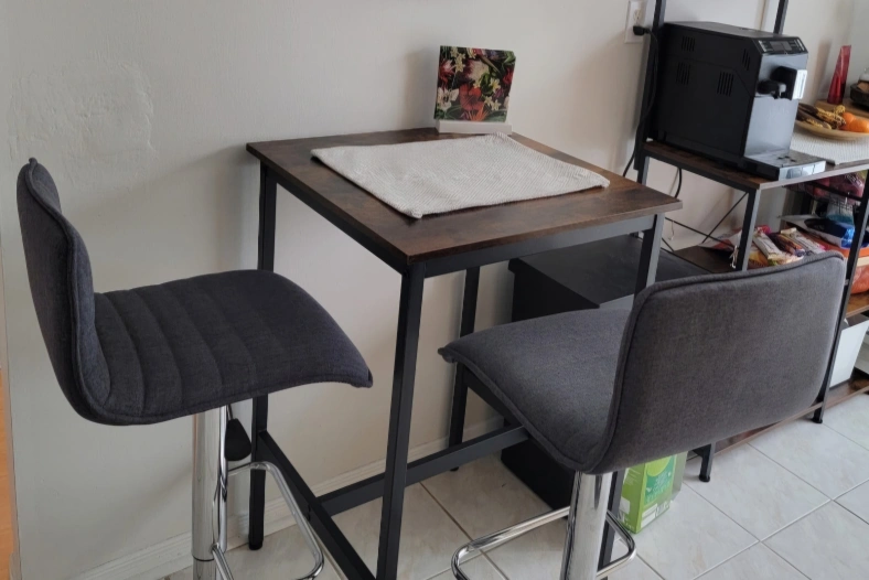 Small kitchen table set. Includes a square bar table and two grey fabric stools. Table Metal frame, brown wood top. Stools have adjustable height.