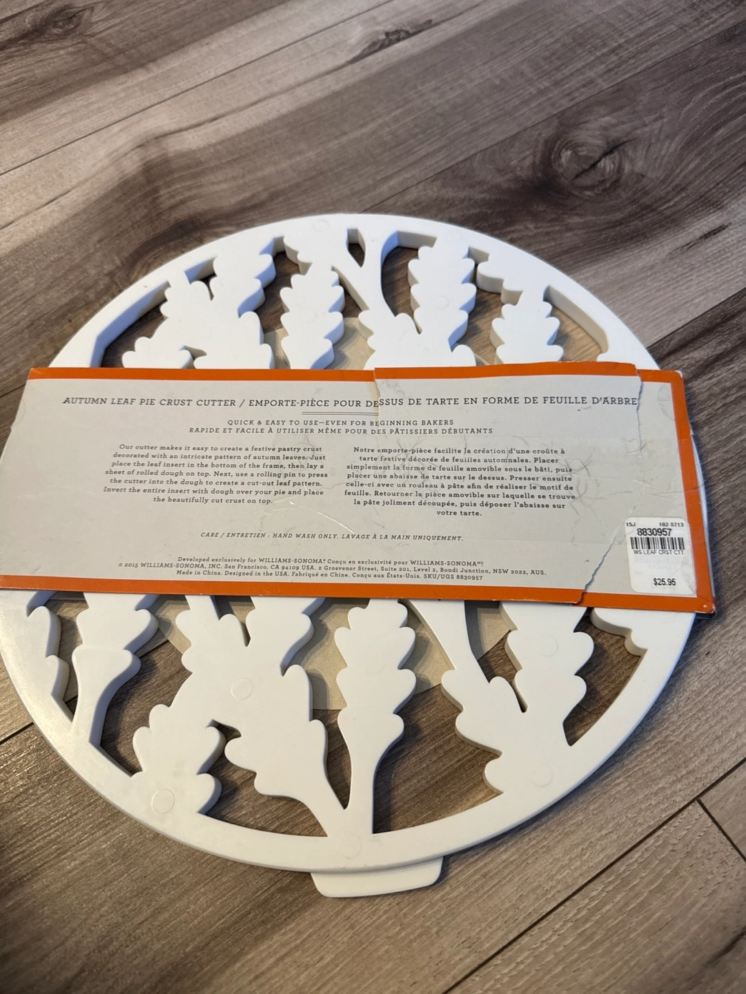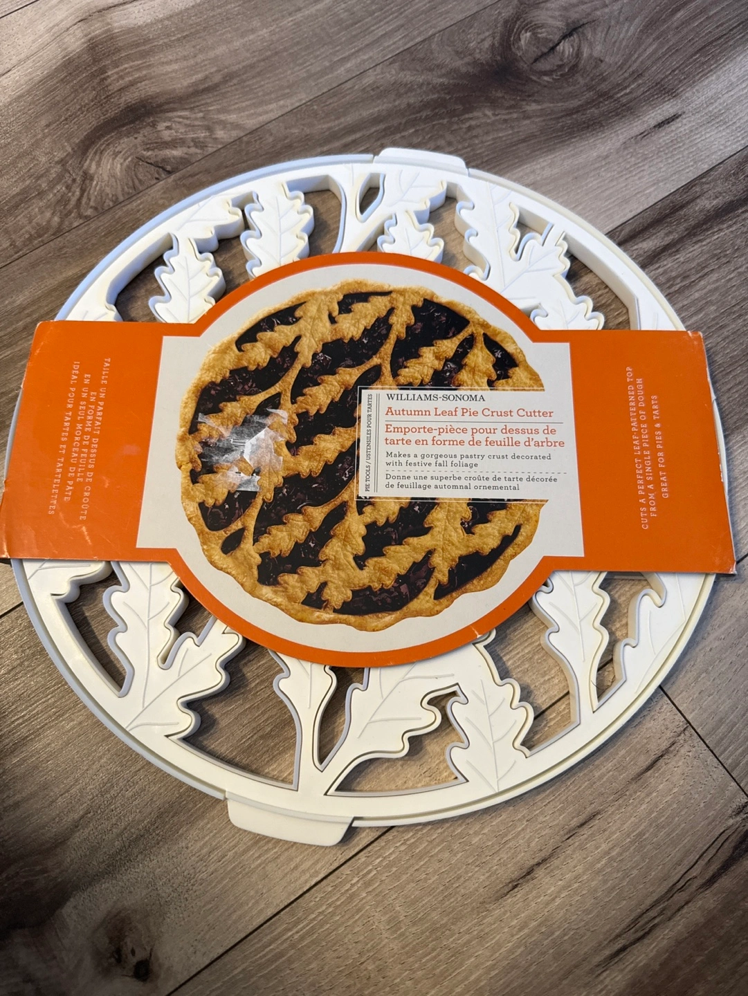 White plastic pie crust cutter. Features an autumn leaf design. Makes decorative pie crusts. Hand wash only. Smoke and Petfree Home. Serious Inquiries only. Pick up at Rosenthal.