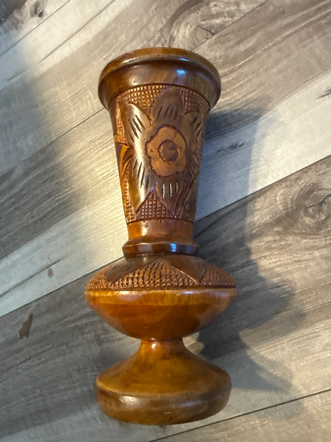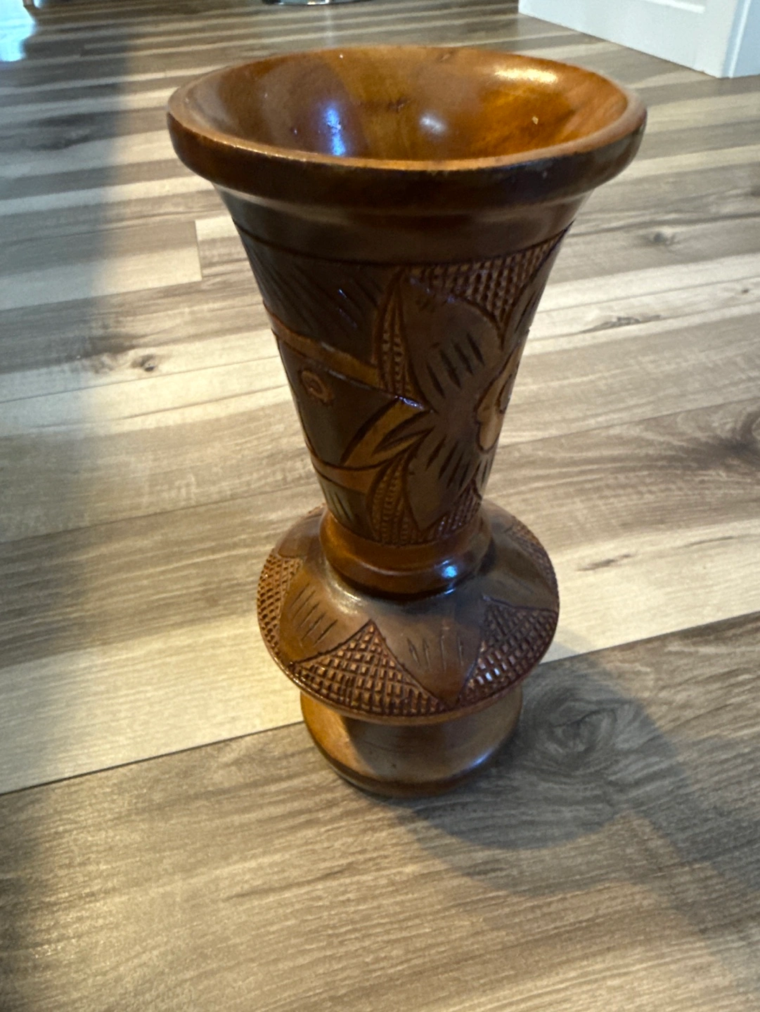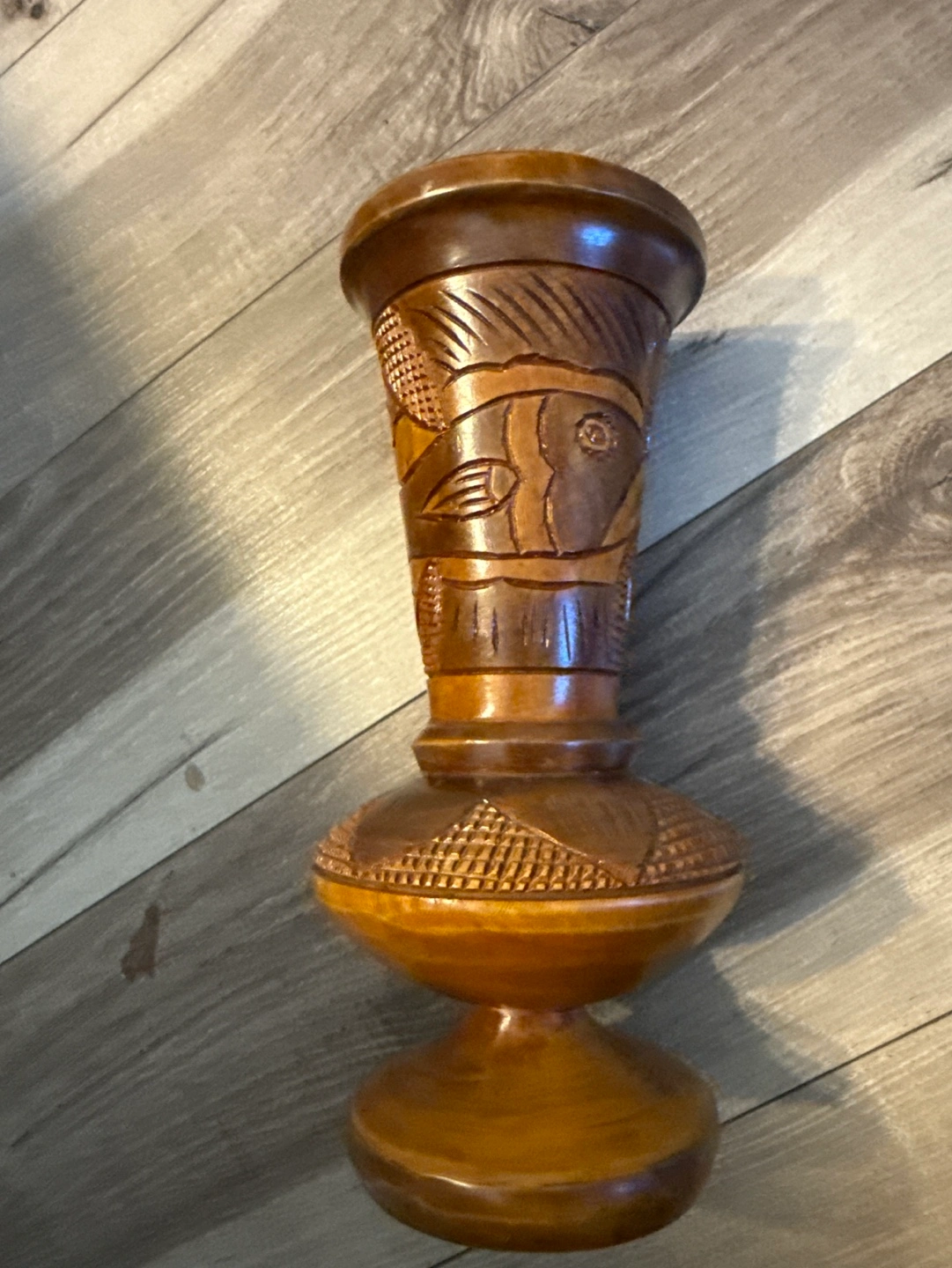 Intricate hand-carved wooden vase. Beautiful floral and fish designs. Unique piece for home décor. Dark brown colour. Excellent condition.