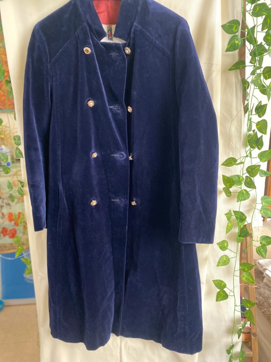 From “Rain or shine” fashion designer Lydia Sperlich for Rainmaster. A beautiful navy, deep royal blue velvet coat. Double breasted with gold-toned and pearl buttons. Fully lined. Made in Canada. Made of durable water resistant fabric. Good vintage condition. Circa 60’s-70’s