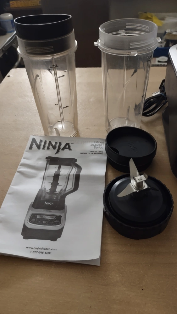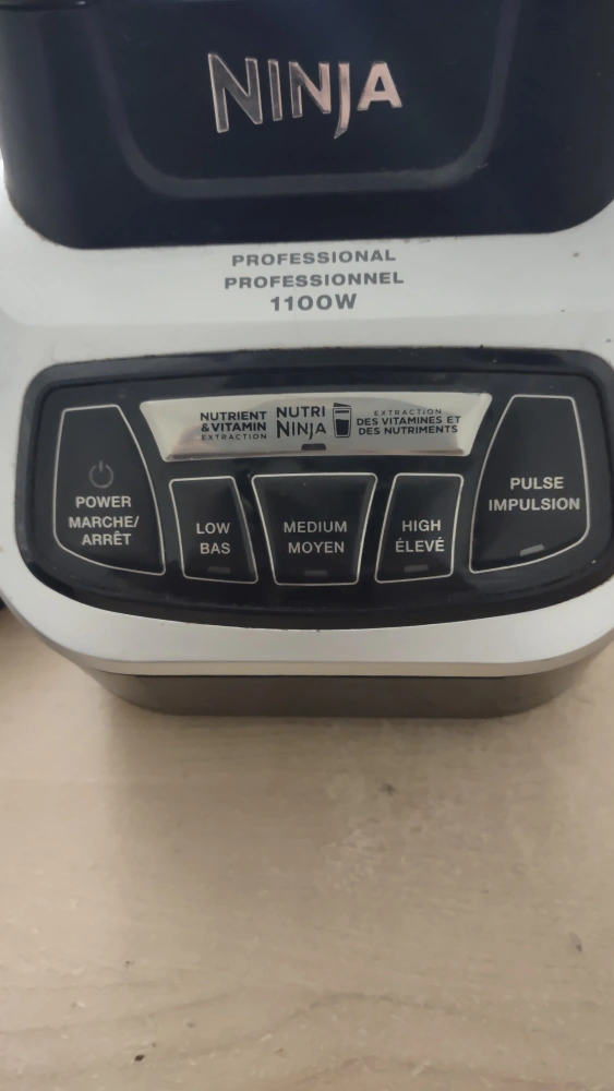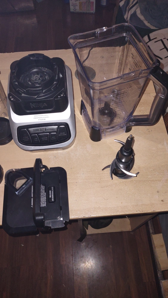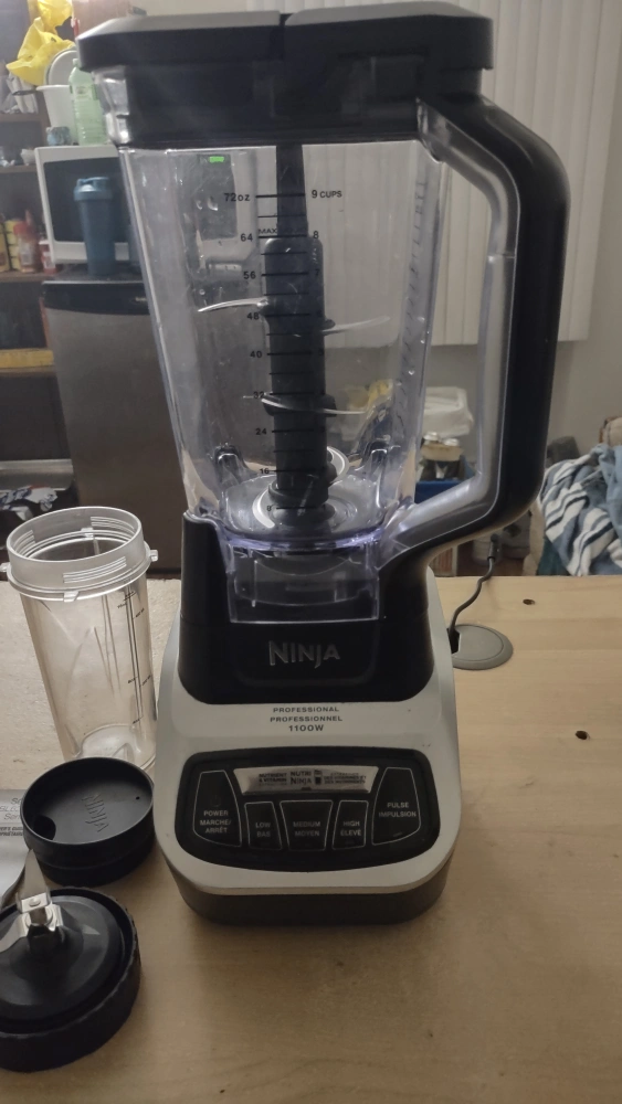 Ninja Professional 1100W blender. Works great and has consistent blends! Can crush ice and good for smoothies, protein shakes, sauces, juices, cocktails, etc. Comes with 2 16oz cups and sip caps. Also comes with miniblade to make smaller blend batches.