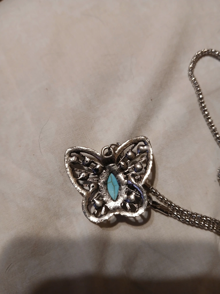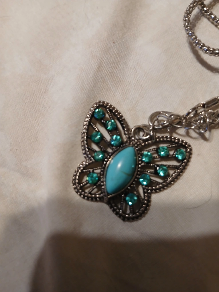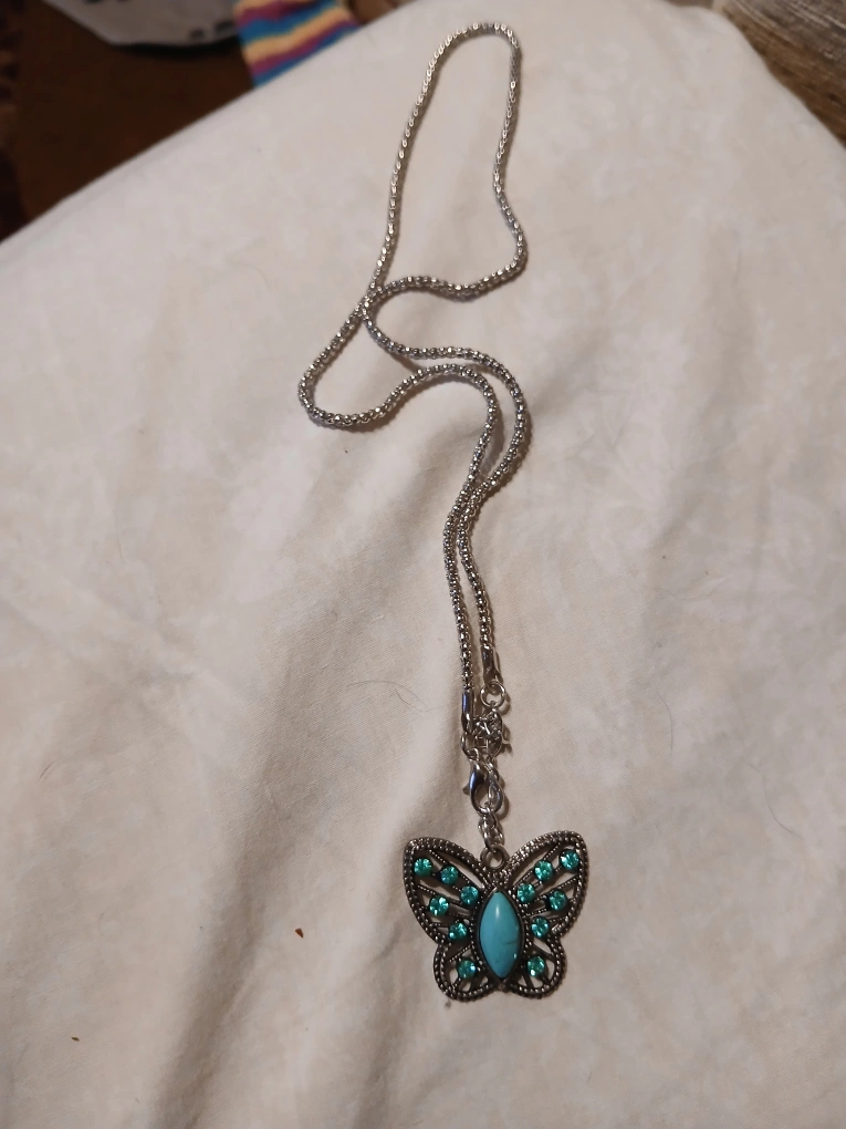 Beautiful silver chain necklace. Features a lovely butterfly pendant accented with sparkling turquoise stones. Perfect for adding a touch of elegance to any outfit.