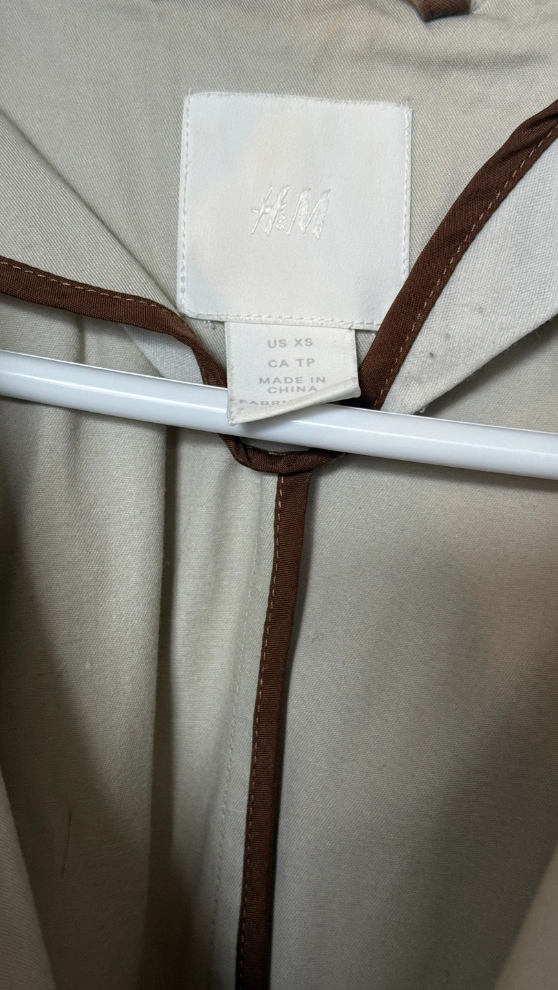 Lightweight beige trench coat. Double breasted. Self-tie belt. Three-quarter sleeves. Size XS.