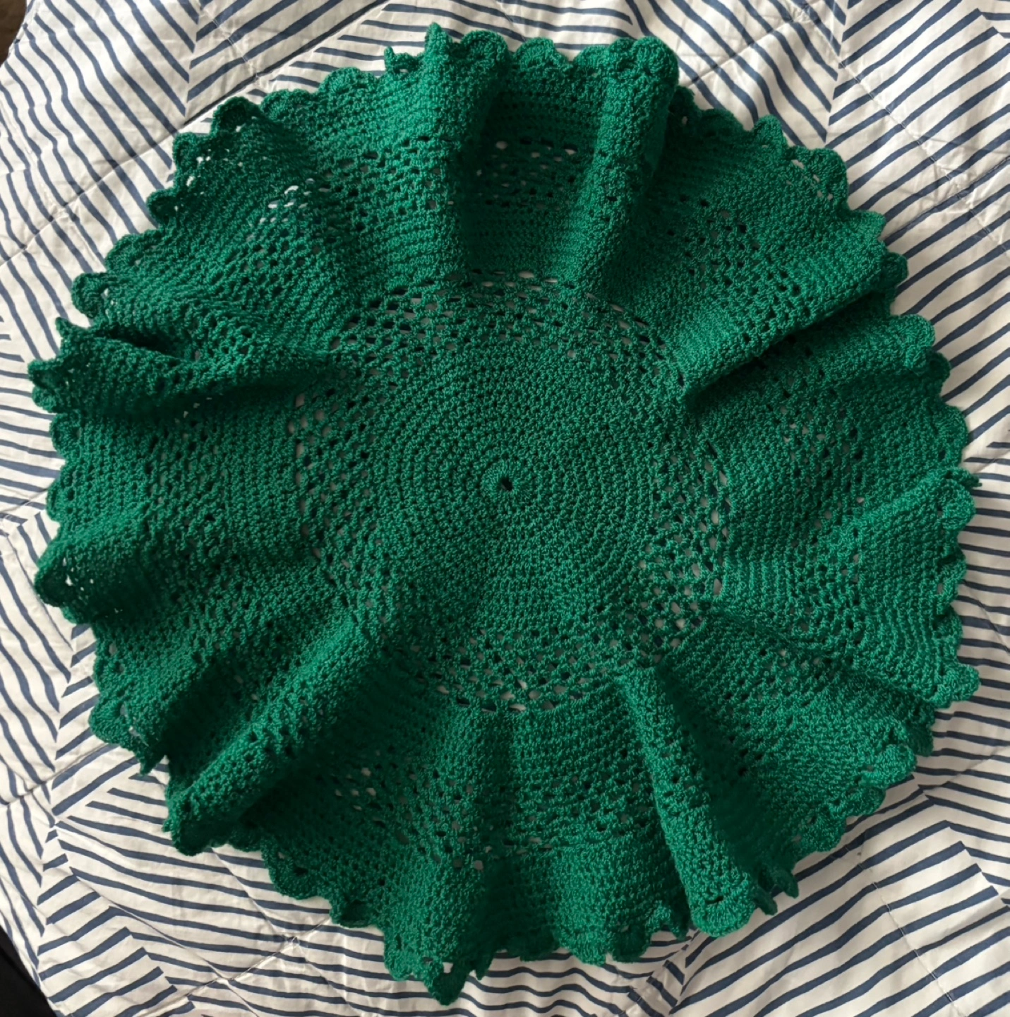 Dark green crocheted doily. Round shape with scalloped edges. Intricate design. Perfect for table decor. Brand new home decor - add a vase or a plant 14” diameter ———- I cross list B6
